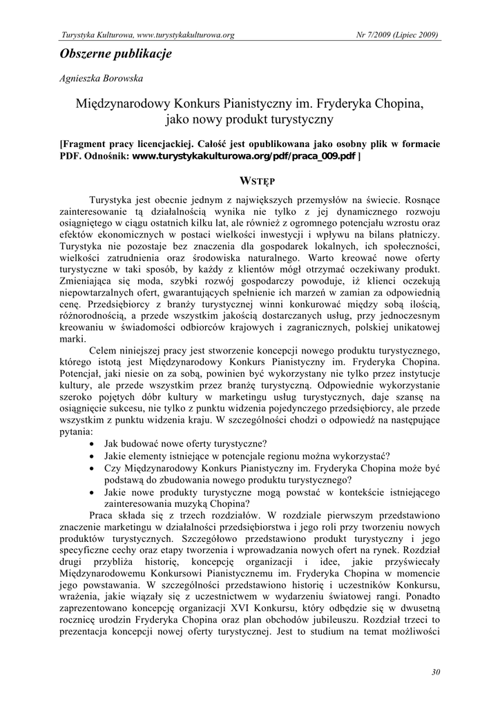 Turystyka Kulturowa, www.turystykakulturowa.org Nr 7/2009 (Lipiec 2009) Obszerne publikacje Agnieszka Borowska Międzynarodowy Konkurs Pianistyczny im. Fryderyka Chopina, jako nowy produkt turystyczny [Fragment pracy licencjackiej. Całość jest opublikowana jako osobny plik w formacie PDF. Odnośnik: www.turystykakulturowa.org/pdf/praca_009.pdf ] WSTĘP Turystyka jest obecnie jednym z największych przemysłów na świecie. Rosnące zainteresowanie tą działalnością wynika nie tylko z jej dynamicznego rozwoju osiągniętego w ciągu ostatnich kilku lat, ale również z ogromnego potencjału wzrostu oraz efektów ekonomicznych w postaci wielkości inwestycji i wpływu na bilans płatniczy. Turystyka nie pozostaje bez znaczenia dla gospodarek lokalnych, ich społeczności, wielkości zatrudnienia oraz środowiska naturalnego. Warto kreować nowe oferty turystyczne w taki sposób, by każdy z klientów mógł otrzymać oczekiwany produkt. Zmieniająca się moda, szybki rozwój gospodarczy powoduje, iż klienci oczekują niepowtarzalnych ofert, gwarantujących spełnienie ich marzeń w zamian za odpowiednią cenę. Przedsiębiorcy z branży turystycznej winni konkurować między sobą ilością, różnorodnością, a przede wszystkim jakością dostarczanych usług, przy jednoczesnym kreowaniu w świadomości odbiorców krajowych i zagranicznych, polskiej unikatowej marki. Celem niniejszej pracy jest stworzenie koncepcji nowego produktu turystycznego, którego istotą jest Międzynarodowy Konkurs Pianistyczny im. Fryderyka Chopina. Potencjał, jaki niesie on za sobą, powinien być wykorzystany nie tylko przez instytucje kultury, ale przede wszystkim przez branżę turystyczną. Odpowiednie wykorzystanie szeroko pojętych dóbr kultury w marketingu usług turystycznych, daje szansę na osiągnięcie sukcesu, nie tylko z punktu widzenia pojedynczego przedsiębiorcy, ale przede wszystkim z punktu widzenia kraju. W szczególności chodzi o odpowiedź na następujące pytania:  Jak budować nowe oferty turystyczne?  Jakie elementy istniejące w potencjale regionu można wykorzystać?  Czy Międzynarodowy Konkurs Pianistyczny im. Fryderyka Chopina może być podstawą do zbudowania nowego produktu turystycznego?  Jakie nowe produkty turystyczne mogą powstać w kontekście istniejącego zainteresowania muzyką Chopina? Praca składa się z trzech rozdziałów. W rozdziale pierwszym przedstawiono znaczenie marketingu w działalności przedsiębiorstwa i jego roli przy tworzeniu nowych produktów turystycznych. Szczegółowo przedstawiono produkt turystyczny i jego specyficzne cechy oraz etapy tworzenia i wprowadzania nowych ofert na rynek. Rozdział drugi przybliża historię, koncepcję organizacji i idee, jakie przyświecały Międzynarodowemu Konkursowi Pianistycznemu im. Fryderyka Chopina w momencie jego powstawania. W szczególności przedstawiono historię i uczestników Konkursu, wrażenia, jakie wiązały się z uczestnictwem w wydarzeniu światowej rangi. Ponadto zaprezentowano koncepcję organizacji XVI Konkursu, który odbędzie się w dwusetną rocznicę urodzin Fryderyka Chopina oraz plan obchodów jubileuszu. Rozdział trzeci to prezentacja koncepcji nowej oferty turystycznej. Jest to studium na temat możliwości 30 Turystyka Kulturowa, www.turystykakulturowa.org Nr 7/2009 (Lipiec 2009) wykorzystania prestiżowych wydarzeń kulturalnych w turystyce, do jakich należy Międzynarodowy Konkurs Pianistyczny im. Fryderyka Chopina, nie tylko w latach konkursowych, ale również poza nimi. Warszawa powinna nieustannie rozbrzmiewać muzyką Chopina. Przedstawiono w nim propozycję nowego produktu turystycznego, który jest spójny ze Strategią rozwoju turystyki województwa mazowieckiego na lata 2007-2013, a także ze Strategią rozwoju miasta stołecznego Warszawy do roku 2020. Produkt, który promuje kraj i wspiera miasto w staraniach o tytuł Europejskiej Stolicy Kultury w roku 2016. Praca powstała na podstawie literatury z zakresu marketingu turystyki oraz kultury, ze szczególnym uwzględnieniem pozycji takich jak: Marketing, Ph. Kotlera; Marketing usług turystycznych, red. Danuta Dudkiewicz; Produkt Turystyczny, J. Kaczmarka, Ekonomika Turystyki, R. Łazarka, Kronika Konkursów Chopinowskich, red. B. Niewiarowska, Wielka Gra, J. Waldorffa, A więc Konkurs, J. Żurawlewa. Wykorzystano także liczne źródła internetowe, artykuły prasowe oraz wywiady i materiały niepublikowane. Ponadto oparto się na doświadczeniu zawodowym autorki jako wieloletniego pilota wycieczek, przewodnika turystycznego - miejskiego a jednocześnie pracownika biur podróży takich jak: Orbis Travel czy Polish Travel Quo Vadis. 31