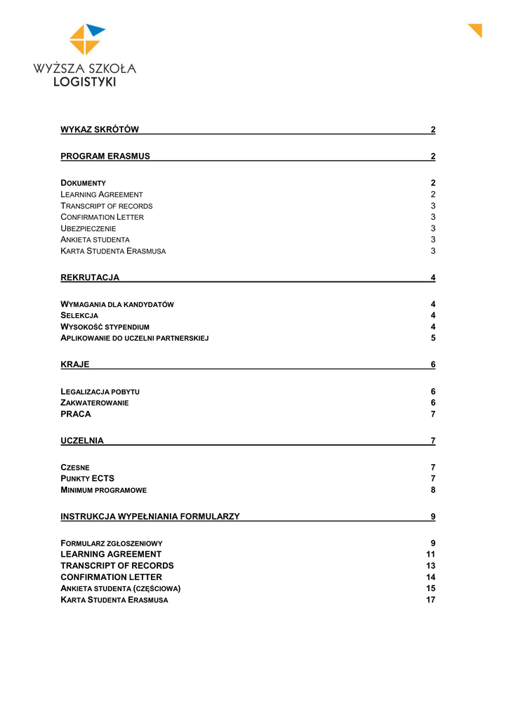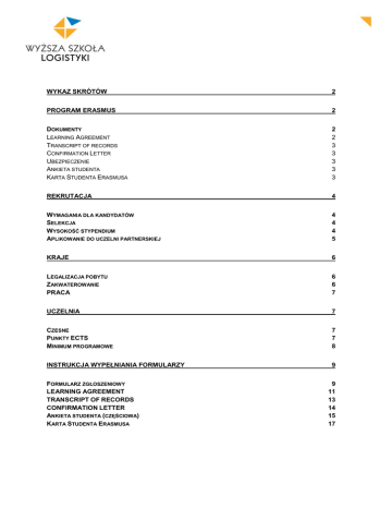 WYKAZ SKRÓTÓW 2 PROGRAM ERASMUS 2 DOKUMENTY LEARNING AGREEMENT TRANSCRIPT OF RECORDS CONFIRMATION LETTER UBEZPIECZENIE ANKIETA STUDENTA KARTA STUDENTA ERASMUSA 2 2 3 3 3 3 3 REKRUTACJA 4 WYMAGANIA DLA KANDYDATÓW SELEKCJA WYSOKOŚĆ STYPENDIUM APLIKOWANIE DO UCZELNI PARTNERSKIEJ 4 4 4 5 KRAJE 6 LEGALIZACJA POBYTU ZAKWATEROWANIE PRACA 6 6 7 UCZELNIA 7 CZESNE PUNKTY ECTS MINIMUM PROGRAMOWE 7 7 8 INSTRUKCJA WYPEŁNIANIA FORMULARZY 9 FORMULARZ ZGŁOSZENIOWY LEARNING AGREEMENT TRANSCRIPT OF RECORDS CONFIRMATION LETTER ANKIETA STUDENTA (CZĘŚCIOWA) KARTA STUDENTA ERASMUSA 9 11 13 14 15 17 Wykaz skrótów DBiW – Dział Badań i Współpracy OU - Óbuda University na Węgrzech JAMK - Jyváskylá University of Applied Sciences w Finlandii THW - Technische Hochschule Wildau w Niemczech LA – Learning Agreement Program Erasmus Dokumenty Learning Agreement Porozumienie o programie zajęć to umowa między studentem, uczelnią przyjmującą i uczelnią macierzystą, określająca program zajęć, w których student ma uczestniczyć w uczelni przyjmującej oraz liczbę punktów ECTS za każdy przedmiot. Porozumienie zawiera wykaz przedmiotów, jakie musisz zaliczyć w uczelni zagranicznej, aby Twoja uczelnia macierzysta mogła uznać i zaliczyć Twój okres studiów. Do Porozumienia można wprowadzić zmiany pod warunkiem, że wszystkie strony je zaakceptują i że będą wprowadzone w formie pisemnej (może się zdarzyć, że wybrane przedmioty nie są realizowane lub nie odpowiadają programowo wymaganiom studenta) – dokument ze zmianami należy przekazać do Działu Badań i Współpracy. Wykaz przedmiotów znajduje się na stronach uczelni partnerskich: Finlandia: wykaz przedmiotów JAMK Z pierwszego rozwijanego menu: TEL, Degree Programme In Logistics Engineering Kod kursu: TEL12S1, TEL11S1, TEL10S1 Przedmioty dla semestru zimowego oznaczone są: 3KOL1 Przedmioty dla semestru letniego oznaczone są: 2SOL1 Niemcy: wykaz przedmiotów THW Węgry: wykaz przedmiotów OU Tab. Przykładowe przedmioty w roku akademickim 2012/2013 Uczelnia JAMK THW OU Przedmioty Zarządzanie łańcuchem dostaw Zarządzanie informacją Transport Analiza wsparcia logistycznego Planowanie systemów magazynowych Zarządzanie logistyką i controlling ERP – Planowanie produkcji Projekt logistyczny w przedsiębiorstwie Finanse korporacyjne Zielony marketing Teoria decyzji Zachowania organizacyjne 2 Transcript of records Wykaz zaliczeń to wykaz wszystkich przedmiotów/zajęć, w których student uczestniczył w uczelni zagranicznej wraz z uzyskanymi punktami ECTS oraz ocenami przyznanymi zgodnie ze skalą stosowaną w danej uczelni, a także ze skalą ECTS. Wykaz jest konieczny do zaliczenia studiów zrealizowanych w uczelni goszczącej. Na podstawie wykazu WSL decyduje po Twoim powrocie o zaliczeniu poszczególnych przedmiotów i przepisaniu uzyskanych przez Ciebie ocen z egzaminów. W ciągu semestru musisz zdobyć łącznie 30 punktów ECTS. Wykaz zaliczeń z dotychczasowego przebiegu studiów jest też dokumentem wymaganym przez niektóre uczelnie przyjmujące - na etapie składania dokumentów aplikacyjnych. Wówczas taki dokument przygotowuje dla przyszłego stypendysty uczelnia macierzysta. UWAGA: W razie konieczności zaliczenia przedmiotów z minimum programowego na WSL, zdobyte punkty ECTS wliczają się do 30 wymaganych – dotyczy Óbuda University i Jyváskylá University of Applied Sciences, w TH Wildau wszystkie punkty ECTS należy uzyskać przez zaliczenie przedmiotów tej uczelni. Confirmation Letter List potwierdzający jest dokumentem wystawianym przez uczelnię przyjmującą, określającym dokładny termin pobytu studenta w uczelni goszczącej. Jest on potrzebny do rozliczenia otrzymanego stypendium. W tym kontekście istotnym jest, aby okres wskazany przez uczelnię przyjmującą był jednakowy z okresem wymienionym w umowie stypendialnej między uczelnią macierzystą a studentem. Ubezpieczenie Każdy stypendysta Erasmusa jest zobowiązany ubezpieczyć się przed wyjazdem od następstw nieszczęśliwych wypadków (NNW) oraz uzyskać odpowiednie ubezpieczenie zdrowotne (np. karta EURO<26 lub ISIC) Podstawowe ubezpieczenie zdrowotne gwarantuje Europejska Karta Ubezpieczenia Zdrowotnego (EKUZ) wydawana przez NFZ. DBiW wystawi stypendystom odpowiednie zaświadczenie potwierdzające status studenta wymiany, potrzebne do wydania EKUZ. Część uczelni zagranicznych wymaga od stypendystów Erasmusa wykupienia obowiązkowego ubezpieczenia na miejscu. Aby uniknąć podwójnych wydatków, dowiedz się przed wyjazdem, jakich formalności trzeba będzie dopełnić w uczelni goszczącej. Ankieta studenta Po powrocie z międzynarodowej wymiany, każdy student zobowiązany jest do wypełnienia ankiety, dostępnej na stronie http://ankiety.frse.org.pl/users/login. Ankieta dotyczy m.in. oceny organizacji ze strony uczelni, terminowości wypłat czy ogólnych wrażeń związanych z zagranicznymi studiami. Karta Studenta Erasmusa Przed wyjazdem na studia zagraniczne, każdy student otrzymuje Kartę Studenta Erasmusa wymieniającą podstawowe prawa i obowiązki „Erasmusowców". 3 Rekrutacja Wymagania dla kandydatów Student WSL, który chce wziąć udział w międzynarodowej wymianie programu Erasmus, musi spełnić kilka warunków: 1. Posiada obywatelstwo polskie, prawo stałego pobytu lub status uchodźcy na terytorium Polski. 2. Jest studentem studiów I stopnia (licencjackich lub inżynierskich) i nie może aplikować na wyjazd na ostatni semestr studiów (odpowiednio na VI i VII). 3. Nie był dotychczas beneficjentem programu LLP-Erasmus (wcześniej Sokrates/Erasmus). 4. Posiada znajomość języka obcego, w którym będą prowadzone zajęcia w uczelni przyjmującej, w stopniu umożliwiającym studiowanie. 5. W momencie wyjazdu ma zaliczony semestr studiów poprzedzający wyjazd na stypendium. Selekcja Kandydat do wyjazdu w ramach programu Erasmus musi przejść proces selekcji, składający się z trzech eta