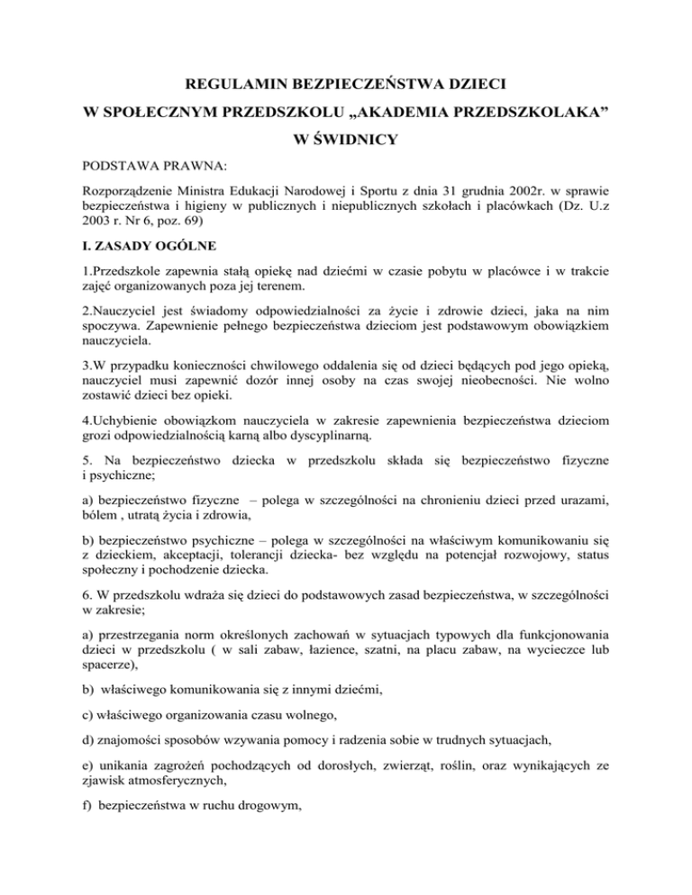 REGULAMIN BEZPIECZEŃSTWA DZIECI W SPOŁECZNYM PRZEDSZKOLU „AKADEMIA PRZEDSZKOLAKA” W ŚWIDNICY PODSTAWA PRAWNA: Rozporządzenie Ministra Edukacji Narodowej i Sportu z dnia 31 grudnia 2002r. w sprawie bezpieczeństwa i higieny w publicznych i niepublicznych szkołach i placówkach (Dz. U.z 2003 r. Nr 6, poz. 69) I. ZASADY OGÓLNE 1.Przedszkole zapewnia stałą opiekę nad dziećmi w czasie pobytu w placówce i w trakcie zajęć organizowanych poza jej terenem. 2.Nauczyciel jest świadomy odpowiedzialności za życie i zdrowie dzieci, jaka na nim spoczywa. Zapewnienie pełnego bezpieczeństwa dzieciom jest podstawowym obowiązkiem nauczyciela. 3.W przypadku konieczności chwilowego oddalenia się od dzieci będących pod jego opieką, nauczyciel musi zapewnić dozór innej osoby na czas swojej nieobecności. Nie wolno zostawić dzieci bez opieki. 4.Uchybienie obowiązkom nauczyciela w zakresie zapewnienia bezpieczeństwa dzieciom grozi odpowiedzialnością karną albo dyscyplinarną. 5. Na bezpieczeństwo dziecka w przedszkolu składa się bezpieczeństwo fizyczne i psychiczne; a) bezpieczeństwo fizyczne – polega w szczególności na chronieniu dzieci przed urazami, bólem , utratą życia i zdrowia, b) bezpieczeństwo psychiczne – polega w szczególności na właściwym komunikowaniu się z dzieckiem, akceptacji, tolerancji dziecka- bez względu na potencjał rozwojowy, status społeczny i pochodzenie dziecka. 6. W przedszkolu wdraża się dzieci do podstawowych zasad bezpieczeństwa, w szczególności w zakresie; a) przestrzegania norm określonych zachowań w sytuacjach typowych dla funkcjonowania dzieci w przedszkolu ( w sali zabaw, łazience, szatni, na placu zabaw, na wycieczce lub spacerze), b) właściwego komunikowania się z innymi dziećmi, c) właściwego organizowania czasu wolnego, d) znajomości sposobów wzywania pomocy i radzenia sobie w trudnych sytuacjach, e) unikania zagrożeń pochodzących od dorosłych, zwierząt, roślin, oraz wynikających ze zjawisk atmosferycznych, f) bezpieczeństwa w ruchu drogowym, g) oddalania się od nauczyciela oraz postępowania w przypadku zgubienia się. 7. Dziecku nie wolno; a) wychodzić samodzielnie z sali, placu zabaw, budynku lub innego miejsca bez pozwolenia i dozoru osoby dorosłej, b) łamać ustalonych w przedszkolu zasad zachowania, c) narażać siebie i innych dzieci na niebezpieczeństwo. 8. Nauczyciel ma obowiązek wdrażania dzieci do bezpiecznych zachowań, w szczególności: a) ustalenia wspólnie z dziećmi zasad i norm zachowań obowiązujących w grupie i w przedszkolu, b)) wdrażanie dzieci do przestrzegania obowiązujących w grupie i w przedszkolu zasad zachowania, w szczególności wynikających z podstawy programowej, realizowanego programu wychowania przedszkolnego i innych programów w zakresie bezpieczeństwa, c) zapoznania rodziców z obowiązującymi w przedszkolu zasadami zachowania, systemem konsekwencji za nie przestrzeganie zasad oraz nagradzania za postępowanie zgodne z obowiązującymi w grupie i w przedszkolu zasadami. 9. Nauczyciel ma obowiązek codziennego sprawdzania sprzętu, zabawek, otoczenia przed rozpoczęciem pracy. Ewentualne zagrożenia należy usuwać lub zgłaszać przełożonemu. Nie wolno organizować zabawy, zajęć oraz innych czynności w otoczeniu niebezpiecznym dla dzieci. 10. Nauczyciel ma obowiązek systematycznego sprawdzania stanu liczbowego grupy, w szczególności podczas zajęć organizowanych na placu zabaw lub poza terenem przedszkola. 11. Nauczyciele i pomoc nauczyciela mają obowiązek , w szczególności podczas pobytu dzieci na placu zabaw, przebywać w miejscach największych zagrożeń (huśtawka, zjeżdżalnia, itp.). 12.Podczas zajęć organizowanych w salach zabaw lub innych pomieszczeniach w przedszkolu uwaga nauczyciela i asystentów powinna być skierowana na dzieci. 13. Nauczyciel ma obowiązek organizowania zajęć w sposób przemyślany, tak by przewidywać ewentualne zagrożenia i im przeciwdziałać. 14. W szatni, łazience dzieci podlegają szczególnej kontroli ze strony pracowników przedszkola: nauczyciele lub pomoce nauczyciela zobowiązani są do monitoringu tych pomieszczeń w czasie, kiedy przebywają tam dzieci. 15. Każdy pracownik przedszkola jest zobowiązany zareagować w przypadku zauważenia dziecka pozostającego bez opieki w przedszkolu lub na placu zabaw ( w każdym miejscu poza salą). 16. Każdy pracownik przedszkola w trakcie swojej pracy zobowiązany jest do sprawdzenia zabezpieczeń drzwi, okien, bram oraz zabezpieczenia dostępu dzieci do środków chemicznych. 17. Każde wyjścia nauczyciela z grupą poza teren przedszkola wpisywane jest do zeszytu wyjść edukacyjnych – z podaniem miejsca, celu wyjścia, planowanego czasu pobytu. 18. Organizacja wycieczki przebiega na zasadach określonych w regulaminie wycieczek i spacerów. 19. W razie zaistnienia wypadku dziecka na terenie przedszkola lub poza nim nauczyciel jest zobowiązany do udzielania pomocy oraz przestrzegania procedury postępowania w razie wypadku. 20. Rodzice mają obowiązek przyprowadzania i odbierania dzieci według zasad określonych w procedurze przyprowadzania i odbierania dzieci z przedszkola. 21. Obowiązkiem rodziców jest przyprowadzanie do przedszkola dziecka zdrowego, czystego, ubranego w odzież adekwatną do pogody. 22. Rodzice przed oddaniem dziecka do grupy powinni skontrolować, czy dziecko nie ma przy sobie przedmiotów zagrażających jego bezpieczeństwu oraz bezpieczeństwu rówieśników. 23. Nauczyciele nie mają uprawnień do podawania dzieciom żadnych leków, a rodzice nie mają prawa domagać się od nauczycieli lub opiekunów podawania dzieciom leków. II. POSTANOWIENIE KOŃCOWE. 1.Niniejszy Regulamin stosuje się do wszystkich pracowników przedszkola i Rodziców dzieci uczęszczających do Społecznego Przedszkola „AKADEMIA PRZEDSZKOLAKA” w Świdnicy. 2.Regulamin wchodzi w życie w dniu podpisania przez wszystkich członkó
