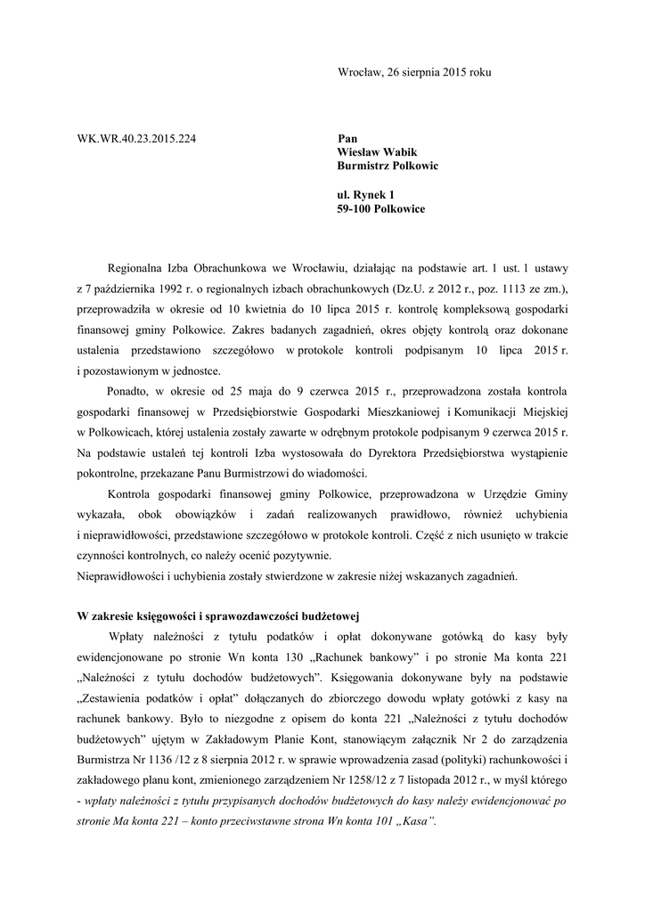 Wrocław, 26 sierpnia 2015 roku WK.WR.40.23.2015.224 Pan Wiesław Wabik Burmistrz Polkowic ul. Rynek 1 59-100 Polkowice Regionalna Izba Obrachunkowa we Wrocławiu, działając na podstawie art. 1 ust. 1 ustawy z 7 października 1992 r. o regionalnych izbach obrachunkowych (Dz.U. z 2012 r., poz. 1113 ze zm.), przeprowadziła w okresie od 10 kwietnia do 10 lipca 2015 r. kontrolę kompleksową gospodarki finansowej gminy Polkowice. Zakres badanych zagadnień, okres objęty kontrolą oraz dokonane ustalenia przedstawiono szczegółowo w protokole kontroli podpisanym 10 lipca 2015 r. i pozostawionym w jednostce. Ponadto, w okresie od 25 maja do 9 czerwca 2015 r., przeprowadzona została kontrola gospodarki finansowej w Przedsiębiorstwie Gospodarki Mieszkaniowej i Komunikacji Miejskiej w Polkowicach, której ustalenia zostały zawarte w odrębnym protokole podpisanym 9 czerwca 2015 r. Na podstawie ustaleń tej kontroli Izba wystosowała do Dyrektora Przedsiębiorstwa wystąpienie pokontrolne, przekazane Panu Burmistrzowi do wiadomości. Kontrola gospodarki finansowej gminy Polkowice, przeprowadzona w Urzędzie Gminy wykazała, obok obowiązków i zadań realizowanych prawidłowo, również uchybienia i nieprawidłowości, przedstawione szczegółowo w protokole kontroli. Część z nich usunięto w trakcie czynności kontrolnych, co należy ocenić pozytywnie. Nieprawidłowości i uchybienia zostały stwierdzone w zakresie niżej wskazanych zagadnień. W zakresie księgowości i sprawozdawczości budżetowej Wpłaty należności z tytułu podatków i opłat dokonywane gotówką do kasy były ewidencjonowane po stronie Wn konta 130 „Rachunek bankowy” i po stronie Ma konta 221 „Należności z tytułu dochodów budżetowych”. Księgowania dokonywane były na podstawie „Zestawienia podatków i opłat” dołączanych do zbiorczego dowodu wpłaty gotówki z kasy na rachunek bankowy. Było to niezgodne z opisem do konta 221 „Należności z tytułu dochodów budżetowych” ujętym w Zakładowym Planie Kont, stanowiącym załącznik Nr 2 do zarządzenia Burmistrza Nr 1136 /12 z 8 sierpnia 2012 r. w sprawie wprowadzenia zasad (polityki) rachunkowości i zakładowego planu kont, zmienionego zarządzeniem Nr 1258/12 z 7 listopada 2012 r., w myśl którego - wpłaty należności z tytułu przypisanych dochodów budżetowych do kasy należy ewidencjonować po stronie Ma konta 221 – konto przeciwstawne strona Wn konta 101 „Kasa”. Dowody kasowe, objęte kontrolą, dokumentujące wypłatę gotówki z kasy KW „Kasa wypłaci”; tj. KW z 9 maja 2013 r. na kwotę 500 zł., KW z 18 września 2014 r. na kwotę 1.000 zł i KW z 19 września 2014 r. na kwotę 3.750 zł nie zawierały numeru dokumentu, numeru raportu kasowego oraz pozycji ujęcia w raporcie, wbrew wymogom § 8 pkt 3 Instrukcji w sprawie gospodarki kasowej, zgodnie z którym „dowód „KW” - kasa wypłaci jest drukowany z systemu informatycznego i winien posiadać nadany przez system numer kolejny w danym roku, nr „RK” oraz pozycję, pod którą jest w nim zaewidencjonowany”. W przyjętych zasadach (polityce) rachunkowości, wprowadzonych zarządzeniem Burmistrza Nr 136/12 z 8 sierpnia 2012 r. § 7 stanowił wykaz zbiorów danych tworzących księgi rachunkowe na komputerowych nośnikach danych. Nie zawierał on wskazania aktualnych wersji stosowanych programów komputerowych ani dat rozpoczęcia ich eksploatacji, co było niezgodne z art. 10 ust. 1 pkt 3 lit. c i ust. 2 ustawy z 29 września 1994 r. o rachunkowości (Dz. U. z 2013 r., poz. 330 ze zm.), które wskazują, że kierownik jednostki ustala w formie pisemnej i aktualizuje dokumentację dotyczącą m. in. opisu systemu informatycznego, zawierającego wykaz programów, procedur lub funkcji (…), a ponadto określenie wersji oprogramowania i daty rozpoczęcia jego eksploatacji. Zestawienia obrotów i sald Urzędu Gminy w podanych niżej przypadkach sporządzone zostały z opóźnieniem; w 2013 roku: za czerwiec - we wrześniu, za wrzesień w listopadzie, za grudzień w kwietniu 2014 roku; w 2014 roku: za marzec w maju, za grudzień w kwietniu 2015 roku. Naruszało to art. 24 ust. 5 ustawy z 29 września 1994 r. o rachunkowości, który stanowi, że k sięgi rachunkowe uznaje się za prowadzone bieżąco, jeżeli zestawienia obrotów i sald kont księgi głównej są sporządzane przynajmniej za poszczególne okresy sprawozdawcze, nie rzadziej niż na koniec miesiąca, w terminie, o którym mowa w pkt 1, tj. w terminie umożliwiającym sporządzenie obowiązujących jednostkę sprawozdań finansowych i innych sprawozdań, w tym deklaracji podatkowych, oraz dokonanie rozliczeń finansowych (zestawienie obrotów i sald śródroczne do 20 każdego miesiąca za miesiąc poprzedni) a za rok obrotowy - nie później niż do 85 dnia po dniu bilansowym (pkt 5). W toku kontroli ustalono, że w sprawozdaniu rocznym jednostkowym Rb-28S Urzędu Gminy Polkowice z wykonania planu wydatków budżetowych za 2013 i 2014 rok, nie zostały wykazane niewygasające wydatki, które należało ująć w kolumnie „Wydatki wykonane” oraz w kolumnie „Wydatki, które nie wygasły z upływem roku budżetowego”, w wysokości odpowiednio 19.815.076,45 zł i 7.561.199,60 zł. Naruszało to przepisy § 8 ust. 2 pkt 3 i pkt 6 oraz § 9 ust. 2 pkt 3 i pkt 6 Instrukcji sporządzania sprawozdań budżetowych w zakresie budżetów jednostek samorządu terytorialnego, stanowiących załącznik Nr 39 do rozporządzeń Ministra Finansów w sprawie sprawozdawczości budżetowej odpowiednio z 3 lutego 2010 r. (Dz.U. nr 20, poz. 103) oraz z 16 stycznia 2014 r. (Dz.U., poz.119 ze zm.). Wydatki, które nie wygasły z upływem roku budżetowego, zostały wykazane w zbiorczym sprawozdaniu Rb-28S z wykonania planu wydatków budżetowych za 2013 i 2014 r. Zgodnie z § 6 ust. 1 pkt 3 powołanych wyżej rozporządzeń „Sprawozdania zbiorcze, w szczegółowości sprawozdań jednostkowych - są sporządza