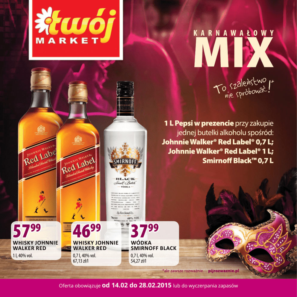 5799 4699 3799 1 l, 40% vol. 0,7 l, 40% vol. 67,13 zł/l 0,7 l, 40% vol. 54,27 zł/l WHISKY JOHNNIE WALKER RED WHISKY JOHNNIE WALKER RED Oferta obowiązuje od WÓDKA SMIRNOFF BLACK 14.02 do 28.02.2015 lub do wyczerpania zapasów 1849 21 0,5 l, 40% vol. 36,98 zł/l 0,5 l, 40% vol. 42,98 zł/l 49 WÓDKA PREMIUM 1999 WÓDKA LUKSUSOWA 0,5 l, 40% vol. 39,98 zł/l WÓDKA WYBOROWA 2399 WÓDKA PAN TADEUSZ 0,5 l, 40% vol. 47,98 zł/l 20 49 WÓDKA SOPLICA 0,5 l, 40% vol. 40,98 zł/l 19 99 KRUPNIK WIŚNIOWY, PIGWOWY, ŚLIWKOWY, ORZECHOWY, CYTRYNOWY, GRAPEFRUIT 0,5 l, 32% vol. 39,98 zł/l 2888 WÓDKA SOBIESKI 0,7 l, 40% vol. 41,26 zł/l 1699 17 99 WINO CARLO ROSSI SWEET RED 9,5% vol. VERMOUTH CIN & CIN BIANCO ROSSO 1 l, 14% vol. 5999 3999 1 l, 40% vol. 0,5 l, 17% vol. 79,98 zł/l Whisky ballantine’s CITY BOTTLE BAILEY’S IRISH CREAM LIKIER czerwone słodkie SWEET WHITE 9,5% vol. białe słodkie 0,75 l, 23,99 zł/l Oferta obowiązuje w podanym terminie lub do wyczerpania zapasów. Folder dostępny wyłącznie na wydzielonym stoisku alkoholowym. Jeśli znajdą go Państwo w innym miejscu, prosimy o zwrot personelowi sklepu. Alkohol szkodzi zdrowiu. Nie sprzedajemy napojów alkoholowych osobom nietrzeźwym oraz osobom do lat 18, zgodnie z art. 15 ust. 1 ustawy z dnia 26.10.1982 r., Dz. U. z 2002r., Nr 147, poz. 1231 ze zm. Sieć sklepów Twój Market nie ponosi odpowiedzialności za błędy w druku. Zdjęcia zamieszczone w ulotce mogą odbiegać od wyglądu produktów znajdujących się w sprzedaży.