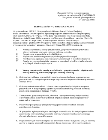 Załącznik Nr 2 do regulaminu pracy wydanym zarządzeniem Nr 836/MZBK/08 Prezydenta Miasta Kędzierzyn-Koźle z 4 czerwca 2008r. BEZPIECZEŃSTWO I HIGIENA PRACY Na podstawie art. 232 K.P, Rozporządzenia Ministra Pracy i Polityki Socjalnej z dnia 26 września 1997r w sprawie ogólnych przepisów bezpieczeństwa i higieny pracy , tekst jednolity, Dz.U.Nr 169 poz. 1650 z 2003 r ze zmianami oraz Rozporządzenia Rady Ministrów z dnia 28 maja 1996r w sprawie profilaktycznych posiłków i napojów (Dz.U. Nr 60 poz.279 z dnia 30 maja 1996r). Rozporządzenia Ministra Pracy i Polityki Socjalnej z dnia 1 grudnia 1998 r w sprawie bezpieczeństwa i higieny pracy na stanowiskach wyposaŜonych w monitory ekranowe (Dz.U.nr 148,poz.973 z 1998 r) ustala się : I. II. III. IV. V. I. Normy zaopatrzenia, zasady przydzielania , gospodarowania i uŜytkowania odzieŜy roboczej, ochronnej i sprzętu ochrony osobistej. Zaopatrzenia pracowników w środki higieny. Wydawanie posiłków regeneracyjnych i napojów chłodzących. Profilaktyczna opieka na stanowiskach wyposaŜonych w monitory ekranowe. Zasady przyznawania dodatku za pracę w warunkach szkodliwych dla zdrowia, uciąŜliwych lub niebezpiecznych. Normy zaopatrzenia, zasady przydzielania , gospodarowania i uŜytkowania odzieŜy roboczej, ochronnej i sprzętu ochrony osobistej. 1. Ochrony indywidualne oraz odzieŜ i obuwie ochronne i robocze są przyznawane pracownikom do stałego indywidualnego uŜytkowania bezpłatnie i stanowią własność zakładu pracy. 2. Ochrony osobiste oraz odzieŜ i obuwie robocze powinny być uŜytkowane przez pracowników w miejscu pracy zgodnie z przeznaczeniem w/g wskazań instrukcji producenta załączonej do kaŜdego wyrobu. 3. Za racjonalną gospodarkę odzieŜą, obuwiem i sprzętem ochrony indywidualnej odpowiedzialni są kierownicy jednostek organizacyjnych zakładu i pracownicy przez nich wyznaczeni. 4. Pracownicy podejmujący pracę nabywają uprawnienia do ochron z dniem przystąpienia do pracy. 5. W przypadku wykonywania prac na róŜnych stanowiskach, dla których przewidziane asortymenty ochron naleŜy przydzielić ochrony w/g asortymentu przewidzianego dla najtrudniejszych warunków pracy. 6. Przydział nowych ochron następuje po uprzednim zwrocie zuŜytych z tym, Ŝe ochrony zuŜyte w stopniu uniemoŜliwiającym ich dalsze stosowanie lub wykorzystanie do innych odpowiednich celów mogą być przekazane nieodpłatnie na własność pracownika. Bielizna osobista nie podlega obowiązkowi zwrotu. 7. UŜywane ochrony z wyjątkiem bielizny osobistej moŜna przydzielić pracownikowi , jeŜeli przedmioty te są nadal przydatne , czyste i zdezynfekowane w stopniu odpowiadającym wymaganiom higieny. 8. OdzieŜ i obuwie robocze wydane do stałego indywidualnego uŜywania winny być uŜywane do czasu utraty cech uŜytkowych w stopniu uniemoŜliwiającym dokonanie naprawy , a środki ochrony indywidualnej do czasu utraty ich cech ochronnych. Nie przewiduje się ekwiwalentu z tytułu przedłuŜenia okresu uŜywalności ochron przez okres dłuŜszy niŜ ustalono w tabeli norm. Okresy podane w tabeli słuŜą do potrzeb prowadzenia prawidłowej gospodarki ochronami i ustaleniem potrzeb ilościowych. Okresy te sa uwzględniane podczas rozliczania się pracownika z wydanych mu do uŜytkowania ochron, gdy następuje rozwiązanie stosunku pracy. 9. W razie przesunięcia pracownika na inne stanowisko pracy , na którym przysługuje inne wyposaŜenie w ochrony indywidualne – pracownik jest obowiązany zwrócić uprzednio pobrane i nie przewidziane do tego stanowiska wyposaŜenie w ochrony indywidualne. 10. Poszczególne przedmioty ochron osobistych , odzieŜy i obuwia roboczego i ochronnego przed wydaniem pracownikowi powinny być oznaczone znakiem zakładu w sposób zapewniający moŜliwość ustalenia zakładu , którego stanowią własność. 11. Pracownik nie moŜe być dopuszczony do pracy bez ochron indywidualnych przewidzianych dla danego stanowiska pracy oraz bez przeszkolenia go w zakresie posługiwania się tymi środkami. 12. Konserwacje ochron osobistych , odzieŜy i obuwia roboczego , ich odkaŜania , naprawa oraz pranie odzieŜy ochronnej i roboczej a takŜe naprawa obuwia roboczego naleŜą do obowiązków zakładu pracy . JeŜeli zakład pracy nie ma moŜliwości prania odzieŜy roboczej wydanej do stałego indywidualnego uŜytkowania , za zgodą pracownika wypłaca się ekwiwalent pienięŜny w wysokości ustalonych kosztów tych czynności i środków piorących. Nie moŜna zlecać pracownikowi do prania lub naprawy we własnym zakresie odzieŜy roboczej skaŜonej bakteriologicznie lub substancjami szkodliwymi dla zdrowia. 13. W razie utraty , zniszczenia lub przedwczesnego zuŜycia ochron osobistych oraz odzieŜy i obuwia roboczego naleŜy wydać niezwłocznie inne ochrony indywidualne przewidziane w zakładowej tabeli norm. JeŜeli utrata , zniszczenie nastąpiło z winy pracownika jest on obowiązany uiścić kwotę równo nie zamortyzowanej części wartości utraconych lub zniszczonych przedmiotów. 14. w razie rozwiązania stosunku pracy pracownik jest obowiązany zwrócić równowartość pienięŜną tych przedmiotów z uwzględnieniem stopnia ich zuŜycia. 15. Zakład pracy przydziela środki ochrony indywidualnej wykonane według unijnych dyrektyw gdzie w Polsce zawarte są w poszczególnych rozporządzeniach , na podstawie ustawy z 30 sierpnia 2002 r o systemie oceny zgodności (DZ.U. nr 166, poz.1360 z późniejszymi zmianami) wykazy norm zharmonizowanych z tymi rozporządzeniami ogłaszane w obwieszczeniach Prezesa Polskiego Komitetu Normalizacyjnego. 16. Zakładowa tabela norm przydziału odzieŜy roboczej, ochronnej, obuwia oraz sprzętu ochrony indywidualnej przedstawiona w załączniku Nr 1 stanowi integralną część niniejszego zarządzenia. II. Zaopatrzenia pracowników w środki higieny osobistej. 1. Środki higieny osobistej przydzielane są z góry na dany miesiąc. Grupa I 100 g mydła