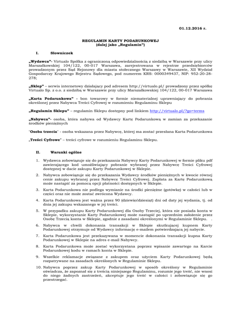 01.12.2016 r. REGULAMIN KARTY PODARUNKOWEJ