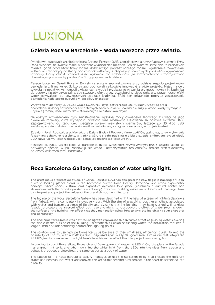 Galeria Roca w Barcelonie – woda tworzona przez swiatło. Prestizowa pracownia architektoniczna Carlosa Ferrater OAB, zaprojektowała nowy flagowy budynek firmy Roca, wiodacej na swiecie marki w sektorze wyposazenia łazienek. Galeria Roca w Barcelonie to propozycja miejsca, gdzie produktów firmy mozna doswiadczyc poprzez róznego rodzaju wydarzenia towarzyskie, kulturalne i ekspozycyjne (łaczy ona osrodek kulturalny z ekspozycja markowych produktów wyposazenia łazienek). Nowy obiekt stanowił duze wyzwanie dla architektów: jak zinterpretowac i zaprojektowac charakterystyczne cechy produktów firmy poprzez architekture. Fasada budynku Galerii Roca w Barcelonie została zaprojektowana przy udziale zespołu projektantów oswietlenia z firmy Artec 3, którzy zaproponowali całkowicie innowacyjna wizje projektu. Majac na celu wywołanie pozytywnych emocji zwiazanych z woda i przekazanie wrazenia płynnosci i dynamiki budynku, do budowy fasady uzyto szkła, aby stworzyc efekt przezroczystosci w ciagu dnia, a w porze nocnej efekt wody spływajacej po zewnetrznych scianach budynku. Efekt ten osiagnieto poprzez zastosowanie oswietlenia nadajacego budynkowi osobliwy charakter. Wyzwaniem dla firmy LED&Co (Grupa LUXIONA) było odtworzenie efektu ruchu wody poprzez oswietlenie szklanej powierzchni zewnetrznych scian budynku. Stworzenie iluzji płynacej wody wymagało uzycia ogromnej ilosci niezaleznie sterowanych punktów swietlnych. Najlepszym rozwiazaniem było zainstalowanie wysokiej mocy oswietlenia ledowego z uwagi na jego niewielkie rozmiary, duza wydajnosc, trwałosc oraz mozliwosc sterowania za pomoca systemu DMX. Zaprojektowano do tego celu specjalne oprawy niewielkich rozmiarów, łaczace po 36 diod LED, zwiekszajace do maksimum uzyskiwana ilosc swiatła, aby osiagnac zamierzony w projekcie efekt. Zdaniem Jordi Rocasalbas’a, Menadzera Działu Badan i Rozwoju firmy Led&Co, „szkło uzyte do wykonania fasady ma zabarwienie zielone, a kiedy z góry do dołu pada na nie białe swiatło emitowane przed diody LED, uzyskujemy kolor niebieski, tak samo jak zmienia sie kolor wody”. Fasadzie budynku Galerii Roca w Barcelonie, dzieki wrazeniom wywoływanym przez swiatło, udało sie odtworzyc sposób, w jaki zachowuje sie woda i urzeczywistnic ten ambitny projekt architektoniczny połozony w samym sercu Barcelony. Roca Barcelona Gallery, sensation of water using light. The prestigious architecture studio of Carlos Ferrater OAB has designed the new flagship building of Roca, a world leading global brand in the bathroom sector. Roca Gallery Barcelona is a brand experiential concept where social, cultural and expositive activities take place (combines a cultural centre and showroom, with the brand’s products on display). This new building raises an architectural challenge: how to interpret and project the values of the brand through architecture. The façade of the Roca Barcelona Gallery has been designed with the help of a team of lighting designers from Artec3, with a completely innovative vision. With the aim of provoking positive emotions associated with water and transmit a sense of fluidity and dynamism in the building, they have worked with a glass façade to create a transparent effect both day and night, to reproduce the effect of water pouring down the surface of the building. An effect that they manage by using light to give the building its own character and personality. The challenge for LED&Co was how to use light to reproduce this dynamic effect of gushing water covering the whole of the outside of the building. To create this illusion of running water, the installation required a large number of independently controllable lighting points. The solution was to use high performance LEDs because of their small size, efficiency, durability and the possibility of control, with a DMX system. They used specifically designed small luminaires that integrated 36 LEDs/m that maximised the light levels to achieve the effect that the project was aiming for. According to Jordi Rocasalbas, Research and Development Manager at LED & Co, ‘the glass in the façade has a green tint to it, and when we shine the white light from the LEDs into the glass from above and below, it produces a blue effect the same colour as a body of water’. The façade of the Roca Barcelona Gallery manages to use the sensation of light to imitate the different states and behaviour of water and convert this ambitious architectural project in the heart of Barcelona into a reality.