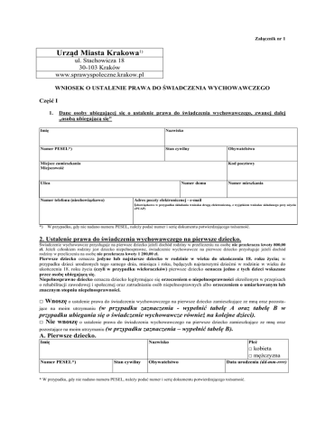 Załącznik nr 1 Urząd Miasta Krakowa1) ul. Stachowicza 18 30-103 Kraków www.sprawyspoleczne.krakow.pl WNIOSEK O USTALENIE PRAWA DO ŚWIADCZENIA WYCHOWAWCZEGO Część I 1. Dane osoby ubiegającej się o ustalenie prawa do świadczenia wychowawczego, zwanej dalej „osobą ubiegającą się" Imię Nazwisko Numer PESEL*) Stan cywilny Miejsce zamieszkania Miejscowość Kod pocztowy Ulica Numer telefonu (nieobowiązkowo) Obywatelstwo Numer domu Numer mieszkania Adres poczty elektronicznej - e-mail (obowiązkowo w przypadku składania wniosku drogą elektroniczną, z wyjątkiem wniosku składanego przy użyciu ePUAP) *) W przypadku, gdy nie nadano numeru PESEL, należy podać numer i serię dokumentu potwierdzającego tożsamość. 2. Ustalenie prawa do świadczenia wychowawczego na pierwsze dziecko. Świadczenie wychowawcze przysługuje na pierwsze dziecko jeżeli dochód rodziny w przeliczeniu na osobę nie przekracza kwoty 800,00 zł. Jeżeli członkiem rodziny jest dziecko niepełnosprawne, świadczenie wychowawcze na pierwsze dziecko przysługuje jeżeli dochód rodziny w przeliczeniu na osobę nie przekracza kwoty 1 200,00 zł. Pierwsze dziecko oznacza jedyne lub najstarsze dziecko w rodzinie w wieku do ukończenia 18. roku życia; w przypadku dzieci urodzonych tego samego dnia, miesiąca i roku, będących najstarszymi dziećmi w rodzinie w wieku do ukończenia 18. roku życia (czyli w przypadku wieloraczków) pierwsze dziecko oznacza jedno z tych dzieci wskazane przez osobę ubiegającą się. Niepełnosprawne dziecko oznacza dziecko legitymujące się orzeczeniem o niepełnosprawności określonym w przepisach o rehabilitacji zawodowej i społecznej oraz zatrudnianiu osób niepełnosprawnych albo orzeczeniem o umiarkowanym lub znacznym stopniu niepełnosprawności. □ Wnoszę o ustalenie prawa do świadczenia wychowawczego na pierwsze dziecko zamieszkujące ze mną oraz pozostające na moim utrzymaniu (w przypadku zaznaczenia - wypełnić tabelę A oraz tabelę B w przypadku ubiegania się o świadczenie wychowawcze również na kolejne dzieci). □ Nie wnoszę o ustalenie prawa do świadczenia wychowawczego na pierwsze dziecko zamieszkujące ze mną oraz pozostające na moim utrzymaniu (w przypadku zaznaczenia – wypełnić tabelę B). A. Pierwsze dziecko. Imię Płeć Nazwisko □ kobieta □ mężczyzna Numer PESEL*) Stan cywilny Obywatelstwo Data urodzenia (dd-mm-rrrr) * W przypadku, gdy nie nadano numeru PESEL, należy podać numer i serię dokumentu potwierdzającego tożsamość. Osoba ubiegająca się o świadczenie wychowawcze na pierwsze dziecko dołącza do wniosku odpowiednie załączniki (oświadczenia) dotyczące osiągniętych dochodów wypełnione przez członków rodziny. 3. Ustalenie prawa do świadczenia wychowawczego na kolejne dziecko/dzieci w wieku poniżej 18. roku życia, inne niż pierwsze dziecko. Wnoszę o ustalenie prawa do świadczenia wychowawczego na następujące dzieci/dziecko zamieszkujące ze mną oraz pozostające na moim utrzymaniu (świadczenie wychowawcze na drugie i kolejne dziecko przysługuje do dnia ukończenia przez dziecko 18. roku życia i przysługuje niezależnie od osiągniętego dochodu): B. Kolejne dziecko/dzieci (poniższa lista nie obejmuje pierwszego dziecka). 1. Imię Płeć Nazwisko □ kobieta □ mężczyzna Numer PESEL*) 2. Imię Stan cywilny Obywatelstwo Data urodzenia (dd-mm-rrrr) Płeć Nazwisko □ kobieta □ mężczyzna Numer PESEL 3. *) Imię Stan cywilny Obywatelstwo Data urodzenia (dd-mm-rrrr) Płeć Nazwisko □ kobieta □ mężczyzna Numer PESEL *) Stan cywilny Imię Nazwisko Numer PESEL *) Stan cywilny Imię Nazwisko 4. Obywatelstwo Data urodzenia (dd-mm-rrrr) Płeć □ kobieta □ mężczyzna 5. Obywatelstwo Data urodzenia (dd-mm-rrrr) Płeć □ kobieta □ mężczyzna Numer PESEL *) Stan cywilny Obywatelstwo Data urodzenia (dd-mm-rrrr) * W przypadku, gdy nie nadano numeru PESEL, należy podać numer i serię dokumentu potwierdzającego tożsamość. 4. Dane członków rodziny Rodzina oznacza odpowiednio: małżonków, rodziców dzieci, opiekuna faktycznego dziecka (opiekun faktyczny dziecka to osoba faktycznie opiekującą się dzieckiem, jeżeli wystąpiła z wnioskiem do sądu opiekuńczego o przysposobienie dziecka) oraz zamieszkujące wspólnie z tymi osobami, pozostające na ich utrzymaniu dzieci w wieku do ukończenia 25. roku życia, a także dzieci, które ukończyły 25. rok życia, legitymujące się orzeczeniem o znacznym stopniu niepełnosprawności, jeżeli w związku z tą niepełnosprawnością przysługuje świadczenie pielęgnacyjne lub specjalny zasiłek opiekuńczy albo zasiłek dla opiekuna, o którym mowa w ustawie z dnia 4 kwietnia 2014 r. o ustaleniu i wypłacie zasiłków dla opiekunów (Dz. U. z 2016 r. poz. 162). Do członków rodziny nie zalicza się dziecka pozostającego pod opieką opiekuna prawnego, dziecka pozostającego w związku małżeńskim, a także pełnoletniego dziecka posiadającego własne dziecko. W przypadku gdy dziecko, zgodnie z orzeczeniem sądu, jest pod opieką naprzemienną obydwojga rodziców rozwiedzionych, żyjących w separacji lub żyjących w rozłączeniu, dziecko zalicza się jednocześnie do członków rodzin obydwojga rodziców. Osoba samotnie wychowująca dziecko (oznacza to pannę, kawalera, wdowę, wdowca, osobę pozostającą w separacji orzeczonej prawomocnym wyrokiem sądu, osobę rozwiedzioną, chyba że wychowuje wspólnie co najmniej jedno dziecko z jego rodzicem) nie wpisuje do składu rodziny drugiego z rodziców dziecka. W skład mojej rodziny zgodnie z ww. definicją wchodzą (zgodnie z ww. definicją należy wpisać wszystkich członków rodziny osoby ubiegającej się o świadczenie wychowawcze, w tym dzieci wskazane w tabeli A i B): 1. Imię i nazwisko stopień pokrewieństwa PESEL* Urząd skarbowy** 2. Imię i nazwisko stopień pokrewieństwa PESEL* Urząd skarbowy** 3. Imię i nazwisko stopień pokrewieństwa PESEL* Urząd ska