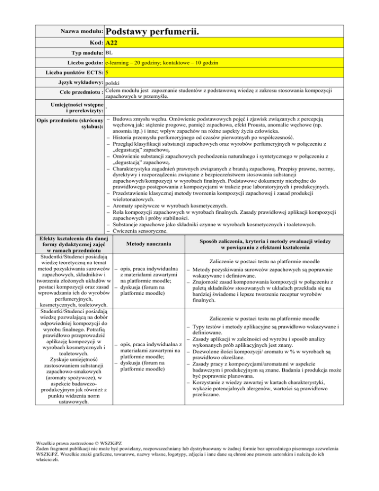 Nazwa modułu: Podstawy perfumerii. Kod: A22 Typ modułu: BL Liczba godzin: e-learning – 20 godziny; kontaktowe – 10 godzin Liczba punktów ECTS: 5 Język wykładowy: polski Cele przedmiotu : Celem modułu jest zapoznanie studentów z podstawową wiedzę z zakresu stosowania kompozycji zapachowych w przemyśle. Umiejętności wstępne i prerekwizyty: Opis przedmiotu (skrócony sylabus): Efekty kształcenia dla danej formy dydaktycznej zajęć w ramach przedmiotu Studentki/Studenci posiadają wiedzę teoretyczną na temat metod pozyskiwania surowców zapachowych, składników i tworzenia złożonych układów w postaci kompozycji oraz zasad wprowadzania ich do wyrobów perfumeryjnych, kosmetycznych, toaletowych. Studentki/Studenci posiadają wiedzę pozwalającą na dobór odpowiedniej kompozycji do wyrobu finalnego. Potrafią prawidłowo przeprowadzić aplikację kompozycji w wyrobach kosmetycznych i toaletowych. Zyskuje umiejętność zastosowaniem substancji zapachowo-smakowych (aromaty spożywcze), w aspekcie badawczoprodukcyjnym jak również z punktu widzenia norm ustawowych. Budowa zmysłu węchu. Omówienie podstawowych pojęć i zjawisk związanych z percepcją węchową jak: stężenie progowe, pamięć zapachowa, efekt Prousta, anomalie węchowe (np. anosmia itp.) i inne; wpływ zapachów na różne aspekty życia człowieka. Historia przemysłu perfumeryjnego od czasów pierwotnych po współczesność. Przegląd klasyfikacji substancji zapachowych oraz wyrobów perfumeryjnych w połączeniu z „degustacją” zapachową. Omówienie substancji zapachowych pochodzenia naturalnego i syntetycznego w połączeniu z „degustacją” zapachową. Charakterystyka zagadnień prawnych związanych z branżą zapachową. Przepisy prawne, normy, dyrektywy i rozporządzenia związane z bezpieczeństwem stosowania substancji zapachowych/kompozycji w wyrobach finalnych. Podstawowe dokumenty niezbędne do prawidłowego postępowania z kompozycjami w trakcie prac laboratoryjnych i produkcyjnych. Przedstawienie klasycznej metody tworzenia kompozycji zapachowej i zasad produkcji wielotonażowych. Aromaty spożywcze w wyrobach kosmetycznych. Rola kompozycji zapachowych w wyrobach finalnych. Zasady prawidłowej aplikacji kompozycji zapachowych i próby stabilności. Substancje zapachowe jako składniki czynne w wyrobach kosmetycznych i toaletowych. Ćwiczenia sensoryczne. Metody nauczania Sposób zaliczenia, kryteria i metody ewaluacji wiedzy w powiązaniu z efektami kształcenia Zaliczenie w postaci testu na platformie moodle opis, praca indywidualna z materiałami zawartymi na platformie moodle; dyskusja (forum na platformie moodle) Metody pozyskiwania surowców zapachowych są poprawnie wskazywane i definiowane. Znajomość zasad komponowania kompozycji w połączeniu z paletą składników stosowanych w układach przekłada się na bardziej świadome i lepsze tworzenie receptur wyrobów finalnych. Zaliczenie w postaci testu na platformie moodle opis, praca indywidualna z materiałami zawartymi na platformie moodle; dyskusja (forum na platformie moodle) Typy testów i metody aplikacyjne są prawidłowo wskazywane i definiowane. Zasady aplikacji w zależności od wyrobu i sposób analizy wykonanych prób aplikacyjnych jest znany. Dozwolone ilości kompozycji/ aromatu w % w wyrobach są prawidłowo określane. Zasady pracy z kompozycjami/aromatami w aspekcie badawczym i produkcyjnym są znane. Badania i produkcja może być poprawnie planowana. Korzystanie z wiedzy zawartej w kartach charakterystyki, wykazie potencjalnych alergenów, wartości są prawidłowo przeliczane. Wszelkie prawa zastrzeżone © WSZKiPZ Żaden fragment publikacji nie może być powielany, rozpowszechniany lub dystrybuowany w żadnej formie bez uprzedniego pisemnego zezwolenia WSZKiPZ. Wszelkie znaki graficzne, towarowe, nazwy własne, logotypy, zdjęcia i inne dane są chronione prawem autorskim i należą do ich właścicieli. Efekty kształcenia dla danej formy dydaktycznej zajęć w ramach przedmiotu Metody nauczania opis, praca indywidualna z materiałami zawartymi na platformie moodle dyskusja (forum na platformie moodle) Studentki/Studenci w sposób czynny nabierają wiedzy na temat palety składników zapachowych oraz zapachów konkretnych typów rodziny zapachowych wyrobów perfumeryjnych. Sposób zaliczenia, kryteria i metody ewaluacji wiedzy w powiązaniu z efektami kształcenia Zaliczenie w postaci testu na platformie moodle. Historia poszczególnych kierunków zapachowych jest poprawnie znana. Definicje i odmiany poszczególnych rodzin zapachowych są poprawnie definiowane. Wykonanie ćwiczeń sensorycznych wskazanych przez prowadzącego. praktyczna (ćwiczenia laboratoryjne w pracowni chemii kosmetycznej) praca indywidualna Forma pracy (zasady wąchania, sposób oczyszczania nosa, itp.) z substancjami zapachowymi jest poprawnie prowadzona. Fartuchy i rękawiczki są poprawnie wykorzystywane. Zasady testów sensorycznych z uwagi na zmysł węchu są prawidłowo przyswojone. Ocena testów sensorycznych przeprowadzonych w trakcie spotkania nie podlega klasycznym sposobom oceny. Studentka/Student zyskuje wiedzę o osobistych predyspozycjach zmysłu węchu, nie mają one jednak wpływu na ocenę końcową modułu. Wnosi ona jednak samoświadomość dotyczącą predyspozycji zapachowych i daje podstawę do dalszego doskonalenia w tym zakresie (lub znajomość swoich ograniczeń). Zaliczenie testu zamieszczonego na platformie modle Sposób zaliczenia modułu, kryteria Wykonanie ćwiczeń wskazanych przez prowadzącego i aktywności w trakcie zajęć kontaktowych (udział obowiązkowy) (Stosowana skala ocen: <60 % – ndst; 60-67 % – dst; 68-75 % – dst+; 76-83 % – db; 84-91 % – db+; ≥92 % - bdb) 1. „Podstawy Perfumerii” W.S. Brud, I. Konopacka-Brud Literatura: 2. „Pachnąca apteka – tajemnice aromaterapii” W.S. Brud, I. Konopacka-Brud 3. Materiały literaturowe zawarte w wykładach. 4. „Intr
