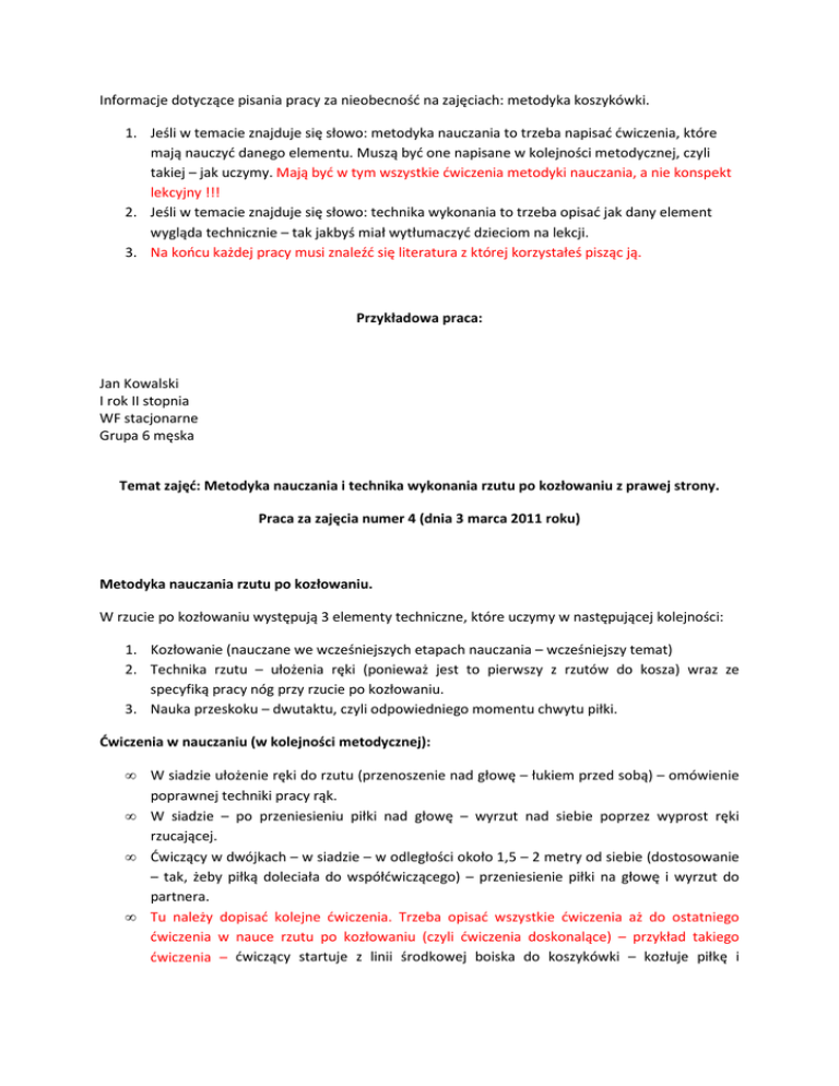 Informacje dotyczące pisania pracy za nieobecność na zajęciach: metodyka koszykówki. 1. Jeśli w temacie znajduje się słowo: metodyka nauczania to trzeba napisać ćwiczenia, które mają nauczyć danego elementu. Muszą być one napisane w kolejności metodycznej, czyli takiej – jak uczymy. Mają być w tym wszystkie ćwiczenia metodyki nauczania, a nie konspekt lekcyjny !!! 2. Jeśli w temacie znajduje się słowo: technika wykonania to trzeba opisać jak dany element wygląda technicznie – tak jakbyś miał wytłumaczyć dzieciom na lekcji. 3. Na końcu każdej pracy musi znaleźć się literatura z której korzystałeś pisząc ją. Przykładowa praca: Jan Kowalski I rok II stopnia WF stacjonarne Grupa 6 męska Temat zajęć: Metodyka nauczania i technika wykonania rzutu po kozłowaniu z prawej strony. Praca za zajęcia numer 4 (dnia 3 marca 2011 roku) Metodyka nauczania rzutu po kozłowaniu. W rzucie po kozłowaniu występują 3 elementy techniczne, które uczymy w następującej kolejności: 1. Kozłowanie (nauczane we wcześniejszych etapach nauczania – wcześniejszy temat) 2. Technika rzutu – ułożenia ręki (ponieważ jest to pierwszy z rzutów do kosza) wraz ze specyfiką pracy nóg przy rzucie po kozłowaniu. 3. Nauka przeskoku – dwutaktu, czyli odpowiedniego momentu chwytu piłki. Ćwiczenia w nauczaniu (w kolejności metodycznej): • • • • W siadzie ułożenie ręki do rzutu (przenoszenie nad głowę – łukiem przed sobą) – omówienie poprawnej techniki pracy rąk. W siadzie – po przeniesieniu piłki nad głowę – wyrzut nad siebie poprzez wyprost ręki rzucającej. Ćwiczący w dwójkach – w siadzie – w odległości około 1,5 – 2 metry od siebie (dostosowanie – tak, żeby piłką doleciała do współćwiczącego) – przeniesienie piłki na głowę i wyrzut do partnera. Tu należy dopisać kolejne ćwiczenia. Trzeba opisać wszystkie ćwiczenia aż do ostatniego ćwiczenia w nauce rzutu po kozłowaniu (czyli ćwiczenia doskonalące) – przykład takiego ćwiczenia – ćwiczący startuje z linii środkowej boiska do koszykówki – kozłuje piłkę i wykonuje rzut po kozłowaniu. Trzeba pamiętać, że te ćwiczenia mają być napisane metodycznie, czyli: od najłatwiejszego do najtrudniejszego. Technika wykonania rzutu po kozłowaniu z prawej strony: • • • • • • Chwyt piłki następuje w trakcie przeskoku – w momencie kiedy żadna stopa nie styka się z parkietem. Przeskok ten jest długi, a nogi przemieszczają się przy samej ziemi (nie jest to skok wzwyż). Tym przeskokiem mamy się maksymalnie zbliżyć do kosza. Wykonując rzut po kozłowaniu z prawej strony – po chwycie piłki spadamy na prawą stopę. Wykonujemy przejście na lewą (nie możemy zrobić drugiego przeskoku) i w tym samym momencie przenosimy piłkę nad głowę. To przejście z prawej na lewą nogę musi być krótkie, ponieważ da nam to możliwość wyskoczenia do góry a nie do przodu (przy dalekim postawieniu lewej stopy względem prawej). Po przeniesieniu (nad głowę) piłka spoczywa na dłoni ręki rzucającej, a drugą dłonią podtrzymują piłkę z boku. Odbijamy się z lewej nogi (prawe kolano podnosimy do góry – stopa tej nogi pozostaje pod kolanem – pomaga nam to w wyskoku) i prostujemy w najwyższym punkcie wyskoku (znad głowy) rękę rzucającą. Opadamy na dwie stopy bardzo blisko miejsca z którego wyskoczyliśmy do rzutu (możliwość zbiórki piłki z tablicy). Literatura: 1. Badora J., Piwowar W. (1976) Koszykówka – zasób ćwiczeń technicznych dla początkujących. AWF Warszawa. 2. Piwowar W. I inni (1982) Koszykówka zasób ćwiczeń i wskazania organizacyjno – metodyczne. AWF Warszawa.