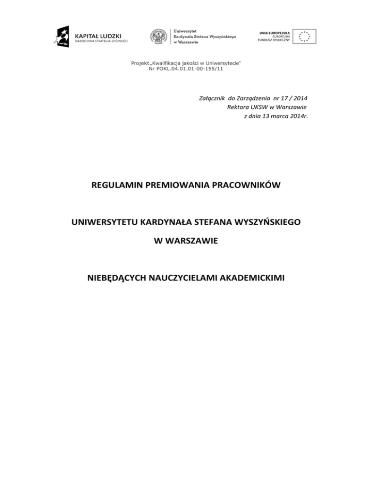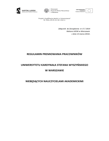 Projekt „Kwalifikacja jakości w Uniwersytecie” Nr POKL.04.01.01-00-155/11 Załącznik do Zarządzenia nr 17 / 2014 Rektora UKSW w Warszawie z dnia 13 marca 2014r. REGULAMIN PREMIOWANIA PRACOWNIKÓW UNIWERSYTETU KARDYNAŁA STEFANA WYSZYŃSKIEGO W WARSZAWIE NIEBĘDĄCYCH NAUCZYCIELAMI AKADEMICKIMI Projekt „Kwalifikacja jakości w Uniwersytecie” Nr POKL.04.01.01-00-155/11 § 1. Utworzenie funduszu Na podstawie niniejszego Regulaminu premiowania pracowników Uniwersytetu Kardynała Stefana Wyszyńskiego w Warszawie niebędących nauczycielami akademickimi, zwanego dalej „regulaminem”, w ramach środków przeznaczonych na wynagrodzenia tworzy się w UKSW fundusz premiowy dla pracowników niebędących nauczycielami akademickimi, zwany dalej funduszem. § 2. Zasady tworzenia funduszu 1. Fundusz, o którym mowa w § 1, tworzy się na dany rok kalendarzowy w wysokości ustalonej przez Rektora. 2. Podstawą naliczenia funduszu premiowego są wynagrodzenia zasadnicze pracowników niebędących nauczycielami akademickimi, zatrudnionych w UKSW na podstawie umowy o pracę. 3. Fundusz premiowy zaplanowany na dany rok kalendarzowy nie musi zostać wykorzystany w całości. § 3. Podstawa obliczenia premii 1. Podstawę obliczenia premii stanowi miesięczne wynagrodzenie zasadnicze wynikające z osobistego zaszeregowania pracownika wypłacane za czas efektywnie przepracowany oraz urlop wypoczynkowy. 2. Premia ulega proporcjonalnemu pomniejszeniu za czas choroby lub opieki nad dzieckiem/członkiem rodziny. O fakcie pomniejszenia premii z tego tytułu pracownik nie będzie informowany pisemnie. 3. Pracownicy w zależności od stanowiska na podstawie zrealizowania przedstawionych im celów określonych na zasadach opisanych w § 7, z zastrzeżeniem postanowień § 14, będą otrzymywali premię stanowiącą określony procent od kwoty wskazanej w ust. 1, stanowiący „całkowitą kwotę premii”. Projekt „Kwalifikacja jakości w Uniwersytecie” Nr POKL.04.01.01-00-155/11 § 4. Wysokość premii Ustala się maksymalną łączną wysokość premii dla następujących poziomów stanowisk: Poziom stanowisk N-1 Stanowisko Kanclerz, Kwestor, Dyrektor Kancelarii Rektora Maksymalna wysokość premii w % 40% podstawy premii Kierownicy, Zastępcy Kanclerza i Kwestora, Dyrektor 20% podstawy premii Wydawnictwa (w tym p.o. tych stanowisk) N-2 N-3 Zastępcy kierowników 10% podstawy premii Pozostali pracownicy 5% podstawy premii § 5. Stanowiska uprawione do stawiania celów Osobami uprawnionymi do stawiania celów premiowych są członkowie kadry kierowniczej wyższego szczebla w odniesieniu do kierowników komórek organizacyjnych oraz pracowników podległych im w strukturze organizacyjnej, w tym przede wszystkim osoby pełniące następujące funkcje : 1) Rektora, 2) Prorektora, 3) Dziekana, 4) Kanclerza, 5) Kwestora, 6) Dyrektora Kancelarii Rektora, 7) Kierownika działu, 8) Zastępcy kierownika działu kierującego pracownikami, zwani dalej „przełożonymi stawiającymi cele premiowe” w niniejszym regulaminie. Projekt „Kwalifikacja jakości w Uniwersytecie” Nr POKL.04.01.01-00-155/11 § 6. Charakter premii Przełożeni zobowiązani są do przedstawienia podwładnym celów według podległości służbowej, których realizacja powoduje powstanie obowiązku wypłaty premii na zasadach i w wysokości określonej treścią niniejszego regulaminu. § 7. Charakterystyka celów 1. Cele stawiane dla poziomu stanowisk N-1 mają charakter ogólny i muszą odnosić się do wskaźników ekonomicznych Uczelni w szczególności związanych z maksymalizacją źródeł finansowania Uczelni oraz odnosić się do współpracy pracownika z poziomu N-1 z innymi pracownikami. Powinny także mieć charakter indywidualny i w tym zakresie muszą odnosić się do wyników związanych z rozwojem naukowym i dydaktyką Uczelni oraz muszą być powiązane z bieżącą działalnością operacyjną wynikającą z pełnionej przez pracownika poziomu N-1 funkcji. 2. Cele stawiane dla poziomu stanowisk N-2 formułowane są przez przełożonych poziomu N-1 i muszą: 1) odnosić się do strategicznych priorytetów dla administracji UKSW, 2) być powiązane z bieżącą/stałą działalnością operacyjną jednostki, 3) odnosić się do wzrostu kompetencji i umiejętności pracowników jednostki, 4) odnosić się do współpracy między komórkami. 3. Cele stawiane pracownikom poziomu N-3 powinny odzwierciedlać cele otrzymane od przełożonych poziomu N-2 i być w miarę możliwości sformułowane dla każdego pracownika w sposób indywidualny, mając na względzie zakres jego obowiązków. 4. Jeżeli będzie to w danej sytuacji uzasadnione, cele dla wybranej grupy pracowników lub jednostek organizacyjnych mogą być identyczne jak dla innych grup lub stanowisk. § 8. Formułowanie celów 1. Podstawowym założeniem dla stawiania celów jest zwiększenie indywidualnej oraz zespołowej efektywności. 2. Przy uwzględnieniu ust. 1, postawione cele muszą być obiektywnie możliwe do realizacji, sformułowane w sposób zrozumiały oraz w taki sposób opisane, aby możliwa była weryfikacja poziomu ich realizacji. 3. Każdemu z celów musi być przyporządkowany równy procent z wysokości premii ustalonej w § 4. Suma procentów określonych dla każdego z celów wynosi 100%. 4. Przełożeni odpowiedzialni są za należyte postawienie celów odpowiednio: przełożony poziomu N-1 pracownikowi poziomu N-2 oraz przełożony poziomu N-2 pracownikowi poziomu N-3. Projekt „Kwalifikacja jakości w Uniwersytecie” Nr POKL.04.01.01-00-155/11 5. Pracownicy poziomu N-2, nie mogą ponosić odpowiedzialności za nienależyte postawienie celu przez przełożonego z poziomu N-1. 6. Pracownicy poziomu N-3, nie mogą ponosić odpowiedzialności za nienależyte postawienie celu przez przełożonego z poziomu N-2. 7. Cele będą stawiane na okres co najmniej kwartalny i muszą być tak sformułowane, aby ich weryfikacja możliwa była w okres
