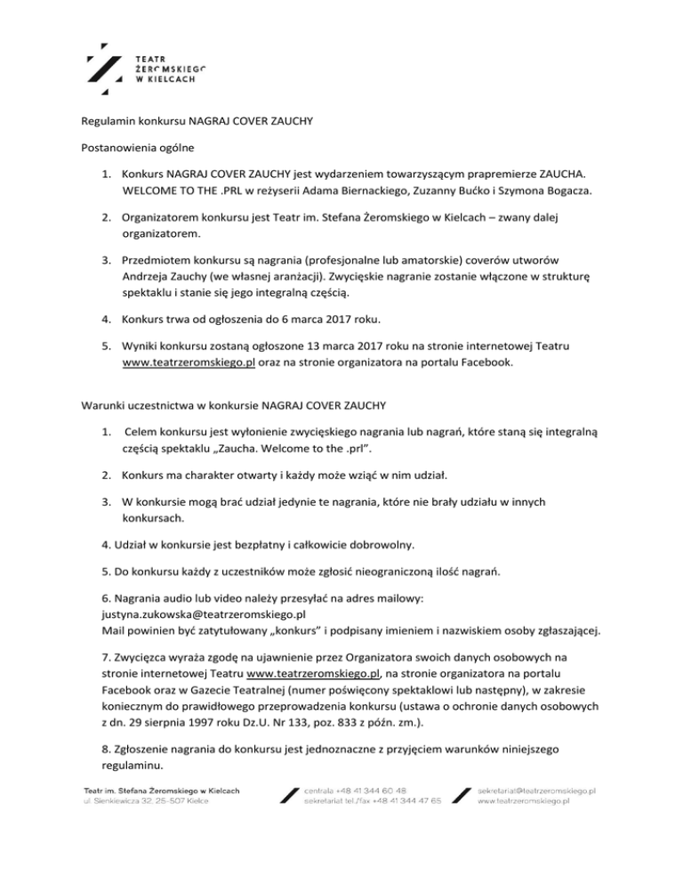 Regulamin konkursu NAGRAJ COVER ZAUCHY Postanowienia ogólne 1. Ko kurs NAGRAJ COVER )AUCHY jest ydarze ie to arzyszą y prapre ierze )AUCHA. WELCOME TO THE .PRL reżyserii Ada a Bier a kiego, )uza y Bućko i Szy o a Boga za. 2. Organizatorem konkursu jest Teatr i . Stefa a Żero skiego organizatorem. Kiel a h – zwany dalej 3. Przed iote ko kursu są agra ia profesjo al e lu a atorskie o eró ut oró A drzeja )au hy e łas ej ara ża ji . ) y ięskie agra ie zosta ie łą zo e strukturę spektaklu i stanie się jego i tegral ą zęś ią. 4. Ko kurs tr a od ogłosze ia do ar a roku. 5. Wy iki ko kursu zosta ą ogłoszo e ar a roku a stro ie i ter eto ej Teatru www.teatrzeromskiego.pl oraz na stronie organizatora na portalu Facebook. Warunki uczestnictwa w konkursie NAGRAJ COVER ZAUCHY 1. Cele ko kursu jest yło ie ie z y ięskiego agra ia lu zęś ią spektaklu „)au ha. Wel o e to the .prl”. 2. Konkurs ma charakter otwarty i każdy 3. W ko kursie konkursach. . Udział oże ziąć i agrań, które sta ą się i tegral ą udział. ogą rać udział jedy ie te agra ia, które ie rały udziału i y h ko kursie jest ezpłat y i ałko i ie do ro ol y. . Do ko kursu każdy z u zest ikó oże zgłosić ieogra i zo ą ilość agrań. . Nagra ia audio lu ideo ależy przesyłać a adres ailo y: [email protected] Mail po i ie yć zatytuło a y „ko kurs” i podpisa y i ie ie i az iskie oso y zgłaszają ej. . ) y ięz a yraża zgodę a uja ie ie przez Organizatora swoich danych osobowych na stronie internetowej Teatru www.teatrzeromskiego.pl, na stronie organizatora na portalu Fa e ook oraz Gaze ie Teatral ej u er poś ię o y spektaklo i lu astęp y , w zakresie ko ie z y do pra idło ego przepro adze ia ko kursu usta a o o hro ie da y h oso o y h z d . sierp ia roku Dz.U. Nr , poz. z pó́ . z . . . )głosze ie agra ia do ko kursu jest jed oz a z e z przyję ie regulaminu. aru kó i iejszego Kryteria o e y agrań ko kurso y h . Pra e zosta ą podda e o e ie przez Ko isję Ko kurso ą, Ada składzie: Bier a ki reżyser Szy o Boga z autor tekstu, reżyser )uza a Bućko autorka tekstu, reżyser . Nagra ie ędzie o e ia e pod zględe artysty z y . 3. Ko isja Ko kurso a doko a y oru ajlepszy h jej zda ie agrań. 4. De yzja Ko isji jest iepod ażal a. . De yzja Ko isji jest ostate z a i ie przysługuje od iej od oła ie. . )astrzega się, że Ko isja oże ie skazać z y ięskiego agra ia. Nagrody 1. Nagroda i ko kursie są: ykorzysta ie agra ia spektaklu, zaprosze ie a pre ierę spektaklu pt. „)au ha. Wel o e to the .prl” reżyserii Ada a Bier a kiego, )uza y Bućko i Szy o a Boga za; ogłosze ie z y ięz y na stronie internetowej Teatru www.teatrzeromskiego.pl, na stronie organizatora na portalu Facebook, w Gazecie Teatralnej. 2. Odbiór nagrody a od iór zaprosze ia a prapre ierę e łas y Teatru. zakresie z y ięz y Ko kursu w kasie Pra o ykorzysta ia z y ięskiego agra ia 1. Zwycięzca oś iad za, że dzieło przesła e do udziału ko kursie, ędzie orygi al e, ez iedoz olo y h zapoży zeń z pra osó trze i h, oraz ie ędzie aruszać pra przysługują y h osobom trze i , sz zegól oś i pra autorski h i y h osó , a przesła y przez iego ut ór ędzie st orzo y a zasada h t ór zej ara ża ji. 2.W przypadku ystąpie ia przez oso ę trze ią z rosz ze ia i y ikają y i z tytułu arusze ia pra określo y h po yżej u zest ik zreko pe suje Orga izatoro i, jako stro a yłą z ie odpo iedzial a, koszty po iesio e z iązku ze skiero a ie prze i ko ie u rosz zeń odszkodo a zy h, z al iają Orga izatora od szelki h zo o iązań, jakie po sta ą z tego tytułu. 3. Zwycięzca przenosi na Organizatora autorskie pra a wynagrodzenia na okres eksploatacji spektaklu. ajątko e dzieła ez dodatko ego 4.Prze iesie ie autorski h pra ajątko y h do dzieła, o który h h ilą przyję ia dzieła i o ej uje astępują e pola eksploata ji: o a ust. astępuje z a) publiczne wystawianie w przedstawieniach; b) zarejestro a ie przedsta ień a do ol y h oś ika h aterial y h z łasz za a taś ie ag ety z ej, płyta h DVD, Blu-ray, CD-R, CD-RW, Video – CD, Mini Disc, plikach MP3 i MP4); c) wytwarza ie określo ą te h iką egze plarzy przedsta ie ia, po yżej; a oś ika h określo y h d) w zakresie obrotu egzemplarzami na których przedstawienie utrwalono; e) zakresie ada a ia, ree ito a ia oraz odt arza ia oraz pu li z ego udostęp ia ia utrwalenia przedsta ie ia taki sposó , a y każdy ógł ieć do iego dostęp iejs u i czasie przez siebie wybranym; f) wykorzystanie w multimediach; g) pra a de ydo a ia o ykorzysta iu pra zależ y h h) wykorzystania fragmentów przedstawienia do celów promocji i reklamy Organizatora; i) rozwoju i ulepszania. 4. Zwycięzca oś iad za, że prze oszo e a Organizatora o pra a, określo e ogra i zo e, a i o iążo e pra a i osó trze i h. ust. ie ędą 5. Przeniesienie wymienionych praw, nie jest ograniczone ani czasowo, ani terytorialnie tzn. od osi się zaró o do terytoriu Polski jak i do terytorió szystki h i y h państ . 6. Organizator oże ykorzysty ać do ra oso iste Zwycięzcy celu prowadzenia promocji spektaklu. az isko, głos i izeru ek 7. Organizator konkursu zastrzega sobie pra o do e e tual y h odyfika ji z y ięskiego nagrania z poszanowaniem oryginalnej formy, w celu jego skutecznego wykorzystania. 8. Organizator ko kursu zo o iązuje się do pokry ia e e tual y h ta tie autorski h do ara ża ji ut oró A drzeja )auchy w ZAiKSie. z tytułu pra Posta o ie ia koń o e . Orga izator zastrzega so ie pra o z ia posta o ień i iejszego regula i u każdy zasie ez poda ia przy zy y z zastrzeże ie opu liko a ia i for a ji o z ia a h a . 2. We wszystkich sprawach spornych decyduje Komisja Konkursowa. . Ni iejszy regula i podlega ogłosze iu a stro ie i ter eto ej Orga izatora: www.teatzeromskiego.pl