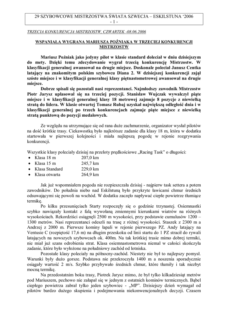 29 SZYBOWCOWE MISTRZOSTWA ŚWIATA SZWECJA – ESKILSTUNA ‘2006 -1TRZECIA KONKURENCJA MISTRZOSTW, CZWARTEK -08.06.2006 WSPANIAŁA WYGRANA MARIUSZA POŹNIAKA W TRZECIEJ KONKURENCJI MISTRZOSTW Mariusz Poźniak jako jedyny pilot w klasie standard doleciał w dniu dzisiejszym do mety. Dzięki temu zdecydowanie wygrał trzecią konkurencję Mistrzostw. W klasyfikacji generalnej awansował na drugie miejsce. Doskonale poleciał Janusz Centka latający na znakomitym polskim szybowcu Diana 2. W dzisiejszej konkurencji zajął szóste miejsce i w klasyfikacji generalnej klasy piętnastometrowej awansował na drugie miejsce. Dobrze spisali się pozostali nasi reprezentanci. Najmłodszy zawodnik Mistrzostw Piotr Jarysz uplasował się na trzeciej pozycji. Stanisław Wujczak wywalczył piąte miejsce i w klasyfikacji generalnej klasy 18 metrowej zajmuje 8 pozycje z niewielką stratą do lidera. W klasie otwartej Tomasz Rubaj uzyskał największą odległość dnia i w klasyfikacji generalnej po trzech konkurencjach zajmuje piąte miejsce z niewielką stratą punktową do pozycji medalowych. Ze względu na utrzymujące się od rana duże zachmurzenie, organizator wysłał pilotów na dość krótkie trasy. Ciekawostką było najkrótsze zadanie dla klasy 18 m, która w dodatku startowała w pierwszej kolejności i miała najlepszą pogodę w rejonie rozgrywania konkurencji. Wszystkie klasy poleciały dzisiaj na przeloty prędkościowe „Racing Task” o długości: • Klasa 18 m 207,0 km • Klasa 15 m 245,7 km • Klasa Standard 229,0 km • Klasa otwarta 264,9 km Jak już wspomniałem pogoda nie rozpieszczała dzisiaj - najpierw task settera a potem zawodników. Do południa niebo nad Eskilstuną było przykryte ławicami chmur średnich odsuwającymi się powoli na wschód. W dodatku zaczęło napływać ciepłe powietrze tłumiące termikę. Po kilku przesunięciach Starty rozpoczęły się o godzinie trzynastej. Osiemnastki szybko nawiązały kontakt z falą wywołaną zmiennymi kierunkami wiatrów na różnych wysokościach. Rekordziści osiągnęli 2500 m wysokości, przy podstawie cumulusów 1200 – 1300 metrów. Nasi reprezentanci odeszli na trasę z różnej wysokości. Staszek z 2300 m a Andrzej z 2000 m. Pierwsze kominy łapali w rejonie pierwszego PZ. Andy latający na Ventusie C (rozpiętość 17,6 m) na długim przeskoku od linii startu do 1 PZ stracił do rywali latających na nowszych szybowcach ok. 400m. Na tak krótkiej trasie mimo dobrej termiki, nie miał już szans odrobienia strat. Klasa osiemnastometrowa niemal w całości skończyła zadanie, które było wyłożone na południowy zachód od lotniska. Pozostałe klasy poleciały na północny-zachód. Niestety nie był to najlepszy pomysł. Warunki były dużo gorsze. Podstawa nie przekroczyła 1400 m a noszenia sporadycznie osiągały wartość 2 m/s. Szybko przybywało średnich chmur, które tłumiły i tak niezbyt mocną termikę. Na przedostatnim boku trasy, Piotrek Jarysz mimo, że był tylko kilkadziesiąt metrów pod Mariuszem, pechowo nie załapał się w jednym z ostatnich kominów termicznych. Bąbel ciepłego powietrza zabrał tylko jeden szybowiec - „MP”. Dzisiejszy dzień wymagał od pilotów bardzo dużego skupienia i podejmowania niekonwencjonalnych decyzji. Czasem 29 SZYBOWCOWE MISTRZOSTWA ŚWIATA SZWECJA – ESKILSTUNA ‘2006 -2trzeba było odchodzić w bok prostopadle od trasy. Jednym z większych pechowców okazał się lider klasy 15 m i obrońca tytułu mistrzowskiego - John Couts. Wylądował w polu na 65 km. Metę w dniu dzisiejszym osiągnęło tylko 6 „długali” dwie piętnastki i jeden standard. Uzyskane prędkości najlepiej pokazują jakim kunsztem musieli wykazać się piloci w dzisiejszym dniu. Nasi piloci nie stracili dobrego rytmu po dwóch dniach przerwy. Wyniki czołówki w dzisiejszej konkurencji w poszczególnych klasach przedstawiają się następująco: • Klasa 15 metrowa: 1. Erik Jansen DEN 978 pkt 2. Gyorgi GULYAS HUN 969 pkt 3. Javier GAUDE ARG 786 pkt 6. Janusz CENTKA POL 777 pkt W klasyfikacji generalnej po trzech konkurencjach sytuacja wygląda następująco: 1. Gyorgi GULYAS HUN 2763 pkt 2. Janusz CENTKA POL 2526 pkt 3. Mikael ENGSTROM SWE 2494 pkt • Klasa 18 metrowa: 1. Phil JONES GBR 415 pkt 2. Makoto ICHIKAWA JAP 381 pkt 3. Hadrian van Nes NED 370 pkt 5. Stanisław WUJCZAK POL 360 pkt 14.Andrzej ŚMIELKIEWICZ POL 306 pkt W klasyfikacji generalnej po trzech konkurencjach sytuacja wygląda następująco: 1. Ronald TERMAAT NED 2293 pkt 2. Wolfgang JANOWITCH AUT 2292 pkt 3. Luciano AVANZINI ITA 2261 pkt 8. Stanisław WUJCZAK POL 2196 pkt 15. Andrzej ŚMIELKIEWICZ POL 1890 pkt • Klasa Standard: 1. Mariusz POŹNIAK POL 895 pkt 2. Tomas SUCHANEK CZE 730 pkt 3. Piotr JARYSZ POL 711 pkt W klasyfikacji generalnej po trzech konkurencjach sytuacja wygląda następująco: 1. Damian GOLDENZWEIG ARG 2525 pkt 2. Mariusz POŹNIAK POL 2453 pkt 3. Leigh WELLS GBR 2451 pkt 25.Piotr JARYSZ POL 1801 pkt • Klasa Otwarta: 1. Giorgio BALLARATI 2. Dick BUTLER 3. Goran AX a. Tomasz RUBAJ ITA USA SWE POL 950 pkt 942 pkt 929 pkt 706 pkt 29 SZYBOWCOWE MISTRZOSTWA ŚWIATA SZWECJA – ESKILSTUNA ‘2006 -3W klasyfikacji generalnej po trzech konkurencjach sytuacja wygląda następująco: 1. Dick BUTLER USA 2796 pkt 2. Giorgio BALLARATI ITA 2653 pkt 3. Oscar GOUDRIAN RPA 2612 pkt 5. Tomasz RUBAJ POL 2543 pkt Jacek Dankowski Kierownik Ekipy