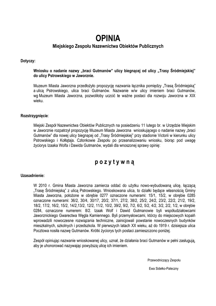 OPINIA Miejskiego Zespołu Nazewnictwa Obiektów Publicznych Dotyczy: Wniosku o nadanie nazwy „braci Gutmanów” ulicy biegnącej od ulicy „Trasy Śródmiejskiej” do ulicy Pstrowskiego w Jaworznie. Muzeum Miasta Jaworzna przedłożyło propozycję nazwania łącznika pomiędzy „Trasą Śródmiejską” a ulicą Pstrowskiego, ulica braci Gutmanów. Nazwanie w/w ulicy imieniem braci Gutmanów, wg Muzeum Miasta Jaworzna, pozwoliłoby uczcić te ważne postaci dla rozwoju Jaworzna w XIX wieku. Rozstrzygnięcie: Miejski Zespół Nazewnictwa Obiektów Publicznych na posiedzeniu 11 lutego br. w Urzędzie Miejskim w Jaworznie rozpatrzył propozycję Muzeum Miasta Jaworzna wnioskującego o nadanie nazwy „braci Gutmanów” dla nowej ulicy biegnącej od „Trasy Śródmiejskiej” przy stadionie Victorii w kierunku ulicy Pstrowskiego i Kołłątaja. Członkowie Zespołu po przeanalizowaniu wniosku, biorąc pod uwagę życiorys Izaaka Wolfa i Dawida Gutmanów, wydali dla wnoszonej sprawy opinię: pozytywną Uzasadnienie: W 2010 r. Gmina Miasta Jaworzna zamierza oddać do użytku nowo-wybudowaną ulicę, łączącą „Trasę Śródmiejską” z ulicą Pstrowskiego. Wnioskowana ulica, to działki będące własnością Gminy Miasta Jaworzna, położone w obrębie 0277 oznaczone numerami: 15/1, 15/2, w obrębie 0285 oznaczone numerami: 36/2, 30/4, 30/17, 20/2, 37/1, 27/2, 38/2, 25/2, 24/2, 23/2, 22/2, 21/2, 19/2, 18/2, 17/2, 16/2, 15/2, 14/2,13/2, 12/2, 11/2, 10/2, 39/2, 9/2, 7/2, 6/2, 5/2, 4/2, 3/2, 2/2, 1/2, w obrębie 0284, oznaczone numerem: 8/2. Izaak Wolf i Dawid Gutmanowie byli współudziałowcami Jaworznickiego Gwarectwa Węgla Kamiennego. Byli przemysłowcami, którzy do miejscowych kopalń wprowadzili nowoczesne rozwiązania techniczne, zainicjowali powstanie nowoczesnych budynków mieszkalnych, szkolnych i przedszkola. W pierwszych latach XX wieku, aż do 1919 r. dzisiejsza ulica Pocztowa nosiła nazwę Gutmanów. Krótki życiorys tych postaci zamieszczono poniżej. Zespół opiniując nazwanie wnioskowanej ulicy, uznał, że działania braci Gutmanów w pełni zasługują, aby je uhonorować nazywając powyższą ulicę ich imieniem. Przewodniczący Zespołu Ewa Sidełko-Paleczny Życiorys Izaaka Wolfa i Dawida Gutmanów W 1871 roku jaworznickie kopalnie nabyła spółka wiedeńskich finansistów. Warunki kupna były bardzo korzystne. Spółka przyjęła oficjalną nazwę JAWORZNOER STEINKOHLEN GEWERKSCHAFT- po polsku Jaworznickie Gwarectwo Węgla Kamiennego. Spółka ta była właścicielem jaworznickich kopalń do sierpnia 1919 roku, czyli 47 lat. Pierwszy skład rady nadzorczej stanowiło: dwóch Gutmanów Izaak Wolf i Dawid, Maksymilian Springer oraz dwóch panów Scholler i dwóch Todesco. W Jaworznie półwiecze działalności wiedeńskiej spółki określano skrótowo „za Gutmanów”. W powstaniu powiedzenia, jakoby tylko Gutmanowie byli właścicielami spółki odegrał fakt, że Dawid Gutman był od 1887 do 1908 roku prezesem rady nadzorczej i z tego tytułu mógł bywać w Jaworznie. Wiedeńska spółka, którą w Jaworznie nazywano spółką Gutmanów, odegrała bardzo ważną rolę w rozwoju jaworznickiego górnictwa oraz rozwoju tego regionu. Do miejscowych kopalń wprowadzili nowoczesne rozwiązania techniczne. Działania właścicieli jaworznickich kopalń miały duże znaczenie w życiu społecznym Jaworzna. Kopalnie były głównymi zakładami, które gwarantowały zatrudnienie dla większości mieszkańców. Z pracy w nich utrzymywała się prawie cała ludność Jaworzna i okolicznych miejscowości. Zarząd Jaworznickiego Gwarectwa angażował się w szereg inwestycji i robót służących mieszkańcom. Gwarectwo prowadziło budowę drogi prowadzącej z Chrzanowa przez Byczynę, Jaworzno i dalej do Wysokiego Brzegu. Droga z Chrzanowa do Jaworzna została ukończona w 1876 roku i uzyskała status drogi powiatowej, na razie na odcinku z Chrzanowa do Jaworzna. Dalsze odcinki drogi oraz most na Przemszy zbudowano w latach następnych. Tak więc droga, która służy do dzisiaj w kierunku Katowic powstała dzięki staraniom Gwarectwa w latach osiemdziesiątych XX wieku. Gwarectwo rozpoczęło budowę pierwszej ogólnodostępnej sieci wodociągowej. Mieszkańcy korzystali z nich jeśli akurat położenie ich domów pozwalało na takie podłączenie. Wybudowano łaźnie w jaworznickich kopalniach – pierwsza powstała przy szybie „Rudolf”. Budowano bardzo wiele budynków użytku publicznego jak np. szkoły i przedszkole oraz budynków mieszkalnych. Z tego czasu pochodzą m.in.: Szkoła w Pechniku, szkoła przy ul. Mickiewicza, domy urzędnicze w okolicy ul. Różanej, przedszkole przy ul. Królowej Jadwigi (dziś restauracja), projekt i pierwsze domy kolonii przy dzisiejszej ul. Lipowej. To właśnie budynki, które stanowią najstarszą zabudowę w centrum powstały za czasów „Gutmanów”. Opracowało Muzeum Miasta Jaworzna