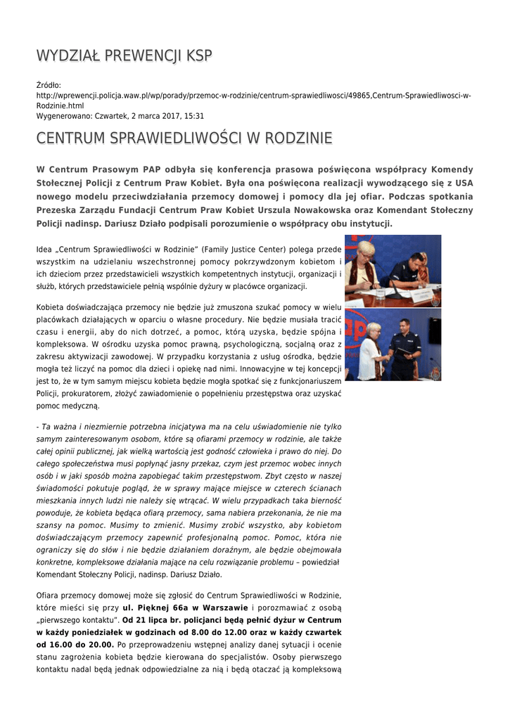 WYDZIAŁ PREWENCJI KSP Źródło: http://wprewencji.policja.waw.pl/wp/porady/przemoc-w-rodzinie/centrum-sprawiedliwosci/49865,Centrum-Sprawiedliwosci-wRodzinie.html Wygenerowano: Czwartek, 2 marca 2017, 15:31 CENTRUM SPRAWIEDLIWOŚCI W RODZINIE W Centrum Prasowym PAP odbyła się konferencja prasowa poświęcona współpracy Komendy Stołecznej Policji z Centrum Praw Kobiet. Była ona poświęcona realizacji wywodzącego się z USA nowego modelu przeciwdziałania przemocy domowej i pomocy dla jej ofiar. Podczas spotkania Prezeska Zarządu Fundacji Centrum Praw Kobiet Urszula Nowakowska oraz Komendant Stołeczny Policji nadinsp. Dariusz Działo podpisali porozumienie o współpracy obu instytucji. Idea „Centrum Sprawiedliwości w Rodzinie” (Family Justice Center) polega przede wszystkim na udzielaniu wszechstronnej pomocy pokrzywdzonym kobietom i ich dzieciom przez przedstawicieli wszystkich kompetentnych instytucji, organizacji i służb, których przedstawiciele pełnią wspólnie dyżury w placówce organizacji. Kobieta doświadczająca przemocy nie będzie już zmuszona szukać pomocy w wielu placówkach działających w oparciu o własne procedury. Nie będzie musiała tracić czasu i energii, aby do nich dotrzeć, a pomoc, którą uzyska, będzie spójna i kompleksowa. W ośrodku uzyska pomoc prawną, psychologiczną, socjalną oraz z zakresu aktywizacji zawodowej. W przypadku korzystania z usług ośrodka, będzie mogła też liczyć na pomoc dla dzieci i opiekę nad nimi. Innowacyjne w tej koncepcji jest to, że w tym samym miejscu kobieta będzie mogła spotkać się z funkcjonariuszem Policji, prokuratorem, złożyć zawiadomienie o popełnieniu przestępstwa oraz uzyskać pomoc medyczną. - Ta ważna i niezmiernie potrzebna inicjatywa ma na celu uświadomienie nie tylko samym zainteresowanym osobom, które są ofiarami przemocy w rodzinie, ale także całej opinii publicznej, jak wielką wartością jest godność człowieka i prawo do niej. Do całego społeczeństwa musi popłynąć jasny przekaz, czym jest przemoc wobec innych osób i w jaki sposób można zapobiegać takim przestępstwom. Zbyt często w naszej świadomości pokutuje pogląd, że w sprawy mające miejsce w czterech ścianach mieszkania innych ludzi nie należy się wtrącać. W wielu przypadkach taka bierność powoduje, że kobieta będąca ofiarą przemocy, sama nabiera przekonania, że nie ma szansy na pomoc. Musimy to zmienić. Musimy zrobić wszystko, aby kobietom doświadczającym przemocy zapewnić profesjonalną pomoc. Pomoc, która nie ograniczy się do słów i nie będzie działaniem doraźnym, ale będzie obejmowała konkretne, kompleksowe działania mające na celu rozwiązanie problemu – powiedział Komendant Stołeczny Policji, nadinsp. Dariusz Działo. Ofiara przemocy domowej może się zgłosić do Centrum Sprawiedliwości w Rodzinie, które mieści się przy ul. Pięknej 66a w Warszawie i porozmawiać z osobą „pierwszego kontaktu”. Od 21 lipca br. policjanci będą pełnić dyżur w Centrum w każdy poniedziałek w godzinach od 8.00 do 12.00 oraz w każdy czwartek od 16.00 do 20.00. Po przeprowadzeniu wstępnej analizy danej sytuacji i ocenie stanu zagrożenia kobieta będzie kierowana do specjalistów. Osoby pierwszego kontaktu nadal będą jednak odpowiedzialne za nią i będą otaczać ją kompleksową opieką. Wybór form pomocy, z jakich kobieta będzie chciała skorzystać, zawsze będzie należał do niej samej. Ona też będzie decydowała o tym, jakimi informacjami będzie chciała się podzielić z innymi. W ramach interdyscyplinarnej współpracy różnych służb tworzony będzie indywidualny plan bezpieczeństwa i pomocy dla każdej pokrzywdzonej kobiety i jej bliskich. Ważnym elementem planu będzie ocena zagrożenia dla życia i zdrowia ofiary przemocy. Charakterystyczną cechą tego modelu będzie również stworzenie domowych warunków i przyjaznej atmosfery w placówce. - Kobiety, które są ofiarami przemocy będą mogły w szybki sposób i w przyjaznych warunkach poinformować funkcjonariusza o popełnieniu przestępstwa. Ale poza stroną formalną, tego typu współpraca, przynosi również korzyść w wymiarze psychicznym. Ofiary przestępstw będą mogły traktować zgłoszenie jako element całego procesu, a nie oddzielną czynność. A to z kolei rodzi poczucie bezpieczeństwa zaufania do wszystkich organów, sprzyja lepszej współpracy z pokrzywdzonymi i zwiększa szansę na pełniejsze zebranie i zabezpieczenie materiału dowodowego. Doświadczenie z innych krajów pokazuje, że przesłuchiwane w takich warunkach kobiety rzadziej wycofują zeznania co z kolei zwiększa szanse na pociągnięcie sprawców do odpowiedzialności - powiedziała Urszula Nowakowska, Prezeska Zarządu Centrum Praw Kobiet. Wyniki ewaluacji prowadzonej w USA potwierdzają dużą skuteczność takiej formuły współpracy w zwalczaniu przemocy domowej. W jej ramach funkcjonariusze Policji będą przyjmować zawiadomienia o popełnieniu przestępstwa z użyciem przemocy, udzielać informacji i porad oraz podejmować działania zmierzające do położenia kresu przemocy i ukarania sprawcy. Z policyjnych danych wynika, że w tym roku w garnizonie stołecznym wszczęto procedurę Niebieskiej Karty w 1707 przypadkach (w analogicznym okresie 2013 roku – 1489). W 1532 sprawach to kobiety były ofiarami przemocy, a w 1538 sprawach sprawcami byli mężczyźni ( w 2013 roku – 1358 kobiet to ofiary, a 1336 mężczyzn było sprawcami przemocy). W wielu przypadkach sprawcy stosujący przemoc w rodzinie byli pod wpływem alkoholu – w 2014 r. – 1024, a w 2013 r. – 790. Najczęściej sprawcy stosują przemoc psychiczną i fizyczną, mniej takich przypadków dotyczy stosowania przemocy ekonomicznej i seksualnej. wyk. mat CPK Ocena: 0/5 (0) Tweetnij