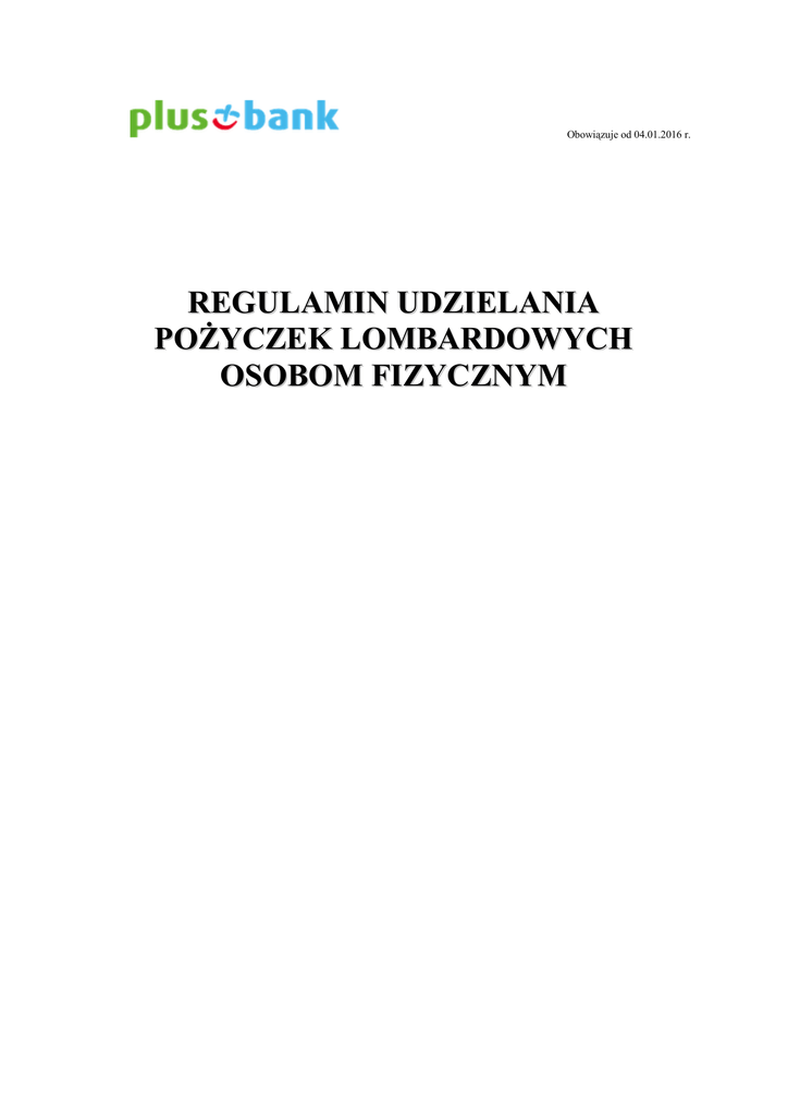 Obowiązuje od 04.01.2016 r. REGULAMIN UDZIELANIA POŻYCZEK LOMBARDOWYCH OSOBOM FIZYCZNYM I. POSTANOWIENIA OGÓLNE §1 Regulamin określa podstawowe zasady udzielania oraz zabezpieczenia spłaty pożyczek lombardowych. §2 Wyjaśnienie wyrażeń użytych w Regulaminie: Bank - oznacza PLUS BANK S.A. Oddział Banku - oznacza Oddział PLUS BANK S.A. bank - oznacza bank lub Spółdzielczą Kasę Oszczędnościowo-Kredytowa, w którym/której prowadzony jest rachunek osobisty Pożyczkobiorcy Wnioskodawca - oznacza osoba fizyczna, która złożyła wniosek o pożyczkę, pożyczka - oznacza udzielaną w złotych krótkoterminową pożyczkę lombardową, Pożyczkobiorca - oznacza osobę lub osoby fizyczne, którym Bank udzielił pożyczki lombardowej na cele bezpośrednio niezwiązane z działalnością gospodarczą lub wykonywaniem zawodu Regulamin - oznacza Regulamin udzielania pożyczek lombardowych osobom fizycznym Taryfa - oznacza Taryfę prowizji i opłat dla osób fizycznych w PLUS BANK S.A. Tabela - oznacza Tabelę oprocentowania dla osób fizycznych w PLUS BANK S.A. odsetki - oznacza określone zgodnie z Kodeksem cywilnym maksymalne oprocentowanie kredytu maksymalne Odsetki - oznacza Określone zgodnie z Kodeksem cywilnym maksymalne oprocentowanie należności maksymalne za przeterminowanych opóźnienie należności - oznacza wszelkie należności przysługujące Bankowi z tytułu Umowy, które nie zostały przeterminowane uregulowane (tj. niezapłacone) w ustalonym terminie ich płatności. §3 1. Pożyczkobiorcą może być wyłącznie osoba fizyczna spełniająca łącznie następujące warunki: a) posiada obywatelstwo polskie, b) posiada dwa ważne dokumenty stwierdzające tożsamość, c) posiada pełną zdolność do czynności prawnych, d) posiada stałe zameldowanie na terenie Polski. 2. W przypadku, gdy małżonkowie nie zaciągają pożyczki wspólnie, a związek małżeński oparty jest o ustrój wspólności majątkowej, udzielenie pożyczki może być uzależnione od zgody współmałżonka wyrażonej na piśmie. II. WARUNKI UDZIELANIA POŻYCZKI §4 1. Podstawę udzielenia pożyczki stanowi umowa o pożyczkę sporządzana w formie pisemnej. Przed zawarciem umowy o pożyczkę, Pożyczkobiorca ma prawo do otrzymania bezpłatnego wzorca umowy wypełnionego jego danymi i danymi dotyczącej wnioskowanej pożyczki. 2. Zawarcie umowy o pożyczkę następuje na pisemny wniosek Wnioskodawcy złożony w placówce Banku. 3. Bank może uzależnić udzielenie pożyczki od spełnienia przez Pożyczkobiorcę warunków dodatkowych. 4. W przypadku odmowy udzielenia pożyczki, Bank zwraca Wnioskodawcy w oryginale tylko te z dokumentów przez niego złożonych, które nie zostały sporządzone na drukach lub formularzach przygotowanych i dostarczonych przez Bank. §5 Pożyczka może być udzielona na okres od 7 dni do 6 miesięcy. §6 1. Wypłata pożyczki nastąpi w terminie do 14 dni po podpisaniu umowy pożyczki i skutecznym ustanowieniu przez Pożyczkobiorcę prawnych zabezpieczeń jej spłaty. 2. Pożyczka może zostać wypłacona w gotówce lub bezgotówkowo przelewem na rachunek wskazany przez Wnioskodawcę we wniosku. §7 1. Pożyczkobiorca jest uprawniony do odstąpienia od umowy o pożyczkę bez podania przyczyny w ciągu 14 dni kalendarzowych od dnia zawarcia umowy o pożyczkę. W przypadku skorzystania z prawa Pożyczkobiorcy do odstąpienia od umowy o pożyczkę, oświadczenie o odstąpieniu od umowy o pożyczkę powinno zostać złożone w Oddziale Banku lub przesłane na adres wskazany w umowie o pożyczkę. W przypadku korespondencyjnego złożenia oświadczenia o odstąpieniu od umowy o pożyczkę za datę jego złożenia uznaje się datę stempla pocztowego. Wzór oświadczenia o odstąpieniu od umowy o pożyczkę stanowi jej integralną część. 2. W przypadku uruchomienia środków z pożyczki przed upływem terminu do odstąpienia od umowy o pożyczkę, Pożyczkobiorca zobowiązany jest do zwrotu kwoty udzielonej pożyczki na zasadach określonych w umowie o pożyczkę. 1 §8 1. Bank nie udziela pożyczki osobom, które nie wywiązały się wobec Banku lub banków z terminowej spłaty swoich zobowiązań, oraz przeciwko którym prowadzone było lub jest postępowanie egzekucyjne. 2. Bank może odmówić udzielenia pożyczki bez podania przyczyny z zastrzeżeniem, że w przypadku podjęcia negatywnej decyzji kredytowej na podstawie informacji zawartych w zewnętrznej bazie danych lub zbiorze danych Banku, Bank przekazuje Wnioskodawcy bezpłatną informację o odmowie przyznania pożyczki w wyniku negatywnej weryfikacji w/w bazach oraz wskazuje bazę danych, w której sprawdzenia dokonano. W/w informacja przekazywana jest Wnioskodawcy w Oddziale Banku. III. WYSOKOŚĆ POŻYCZKI ORAZ ZABEZPIECZENIE JEJ SPŁATY §9 1. Wysokość pożyczki uzależniona jest od proponowanego zabezpieczenia spłaty pożyczki, przy czym możliwe jest łączenie różnych form zabezpieczenia. 2. Ustala się następujące ograniczenia, co do kwoty udzielanych pożyczek: a) minimalna kwota – 2.500,00 złotych, b) maksymalna kwota uzależniona jest od wartości przyjętych zabezpieczeń i nie może przekroczyć 80% wartości przyjętego zabezpieczenia. § 10 Pożyczka może być udzielona pod warunkiem zabezpieczenia przez Pożyczkobiorcę jej spłaty w jednej lub kilku z form wymienionych w § 11. § 11 1. Prawne zabezpieczenie spłaty pożyczki stanowią: a) blokada środków pieniężnych na rachunku w PLUS BANK S.A., b) blokada na rachunku papierów wartościowych (obligacji skarbowych, bonów skarbowych, bankowych papierów wartościowych, obligacji emitowanych przez banki), c) ustanowienie kaucji w postaci środków pieniężnych, d) zastaw rejestrowy na obligacjach Skarbu Państwa, e) zastaw rejestrowy na bonach skarbowych, f) zastaw zwykły z przyjęciem do depozytu bankowego bankowych papierów wartościowych, obligacji bankowych emitowanych w formie fizycznego dokumentu. 2. Pożyczkobio