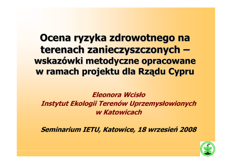 Ocena ryzyka zdrowotnego na terenach zanieczyszczonych – wskazówki metodyczne opracowane w ramach projektu dla Rządu Cypru Eleonora Wcisło Instytut Ekologii Terenów Uprzemysłowionych w Katowicach Seminarium IETU, Katowice, 18 wrzesień 2008 National Inventory of Potential Sources of Soil Contamination in Cyprus  Projekt realizowany na zlecenie rządu cypryjskiego w latach 2005-2007  Cel: Opracowanie systemu krajowej inwentaryzacji terenów zanieczyszczonych na Cyprze w ramach programu rządowego dla zarządzania terenami zanieczyszczonymi, w tym rekultywacji gleb Uczestnicy  Institute of Geology and Mineral Exploration, Ateny, Grecja (koordynator projektu A.Demetriades)  Instytut Ekologii Terenów Uprzemysłowionych, Katowice, Polska  Geoinvest Ltd, Nikozja, Cypr współpraca - Cyprus Geological Survey Department (Ministry of Agriculture Natural Resources and Environment) Raporty IETU  Part 5: Guidance on contaminated site risk assessment in Cyprus. 1. Site-specific human health risk assessment (HRA). 2. Risk-based guideline values for soil contaminants (RBSGVs) – E. Wcislo, M. Korcz  Part 7: Human health risk assessment on the Hellenic Chemical Industries Ltd. Property at Vassiliko, Cyprus - E. Wcislo, M. Korcz, J. Dlugosz  Part 10: Human health risk assessment for the Moni Industrial Area, Cyprus - E. Wcislo, M. Korcz, J. Dlugosz, I. Owczarska Wskazówki metodyczne do oceny ryzyka zdrowotnego na terenach zanieczyszczonych na Cyprze  sposób włączenia oceny ryzyka zdrowotnego do systemu badania, oceny i rekultywacji terenów zanieczyszczonych  metoda oceny ryzyka zdrowotnego  metoda wyznaczania dopuszczalnych wartości stężeń substancji zanieczyszczających w glebie  dopuszczalne wartości stężeń substancji zanieczyszczających w glebie dla różnych sposobów użytkowania terenu Cechy charakterystyczne oceny zanieczyszczenia gleb  dwu-etapowy proces oceny  receptory – ludzie; poziom ryzyka zdrowotnego głównym kryterium oceny terenów zanieczyszczonych  uwzględnia trzy sposoby użytkowania terenu – przemysłowy, mieszkaniowy, rekreacyjny  odnosi się do obecnego lub przyszłego sposobu użytkowania terenu  zaadaptowano podstawy metodologiczne US EPA (US EPA 1989, 1991, 1996, 2000, 2001, 2002, 2004) Dwu-etapowy proces oceny zanieczyszczenia gleb Etap 1: Wstępne badanie terenu Wstępna ocena terenu Czy stężenia substancji w glebie przekraczają wartości dopuszczalne dla danego sposobu użytkowania terenu? Tak Nie Koniec oceny Etap 2: Szczegółowa ocena ryzyka zdrowotnego Podstawowa ocena ryzyka zdrowotnego Opracowanie zestawu danych Ocena narażenia Scenariusze użytkowania terenu Ocena toksyczności (przemysłowy, mieszkaniowy, rekreacyjny) Charakterystyka ryzyka Czy ryzyko zdrowotne przekracza dopuszczalny poziom ryzyka? Nie Brak działań Tak Wyznaczenie lokalnych, bezpiecznych dla zdrowia zawartości substancji (RBRLs) Ocena alternatywnych sposobów rekultywacji Wybór optymalnego sposobu rekultywacji Opracowanie zestawu danych  wstępna identyfikacja szlaków narażenia ludzi (zgodnie z określonym sposobem użytkowania terenu)  zgromadzenie i ocena istniejących danych o zanieczyszczonym terenie (źródła i rodzaj zanieczyszczenia)  określenie brakujących danych; zaprojektowanie i przeprowadzenie badań uzupełniających  określenie wymagań analitycznych  zgromadzenie i ocena jakości nowych danych pomiarowych Opracowanie zestawu danych (c.d.)  pogrupowanie wartości stężeń według głębokości poboru próbek (w zależności od sposobu użytkowania terenu i rodzaju substancji chemicznych (substancje nielotne - warstwa wierzchnia; lotne – podglebie i ziemia)  wydzielenie podobszarów i pogrupowanie danych według tych podobszarów (przy znacznym zróżnicowaniu cech charakteryzujących dany teren)  zebranie aktualnych danych o właściwościach fizykochemicznych i toksykologicznych substancji  statystyczne opracowanie danych pomiarowych odnośnie każdej substancji zanieczyszczającej Ocena narażenia  identyfikacja potencjalnych receptorów (dzieci, dorośli) i rodzajów ich aktywności  identyfikacja szlaków narażenia  incydentalne pobranie cząstek zanieczyszczonej gleby i kurzu drogą pokarmową  kontakt z zanieczyszczoną glebą przez skórę  wdychanie cząstek gleby i kurzu  wdychanie par substancji lotnych zawartych w glebie  oszacowanie wielkości narażenia (dawek substancji chemicznych pobranych różnymi szlakami narażenia) Ocena narażenia (c.d.) Scenariusze narażenia  mieszkaniowy  przemysłowy/handlowy  rekreacyjny Ocena narażenia (c.d.) Obliczanie dawki pobranej CR × EF × ED 1 CDI = C × × BW AT CDI - dawka pobrana (mg/kg masy ciała/dzień) C - średnie stężenie substancji w glebie w okresie narażenia (mg/kg) CR - wskaźnik kontaktu; ilość zanieczyszczonej gleby w jednostce czasu (mg/dzień) EF - częstotliwość narażenia (dni/rok) ED - okres trwania narażenia (lata) BW - masa ciała; średnia masa ciała w okresie narażenia (kg) AT - czas uśredniania; czas dla którego narażenie jest uśredniane (dni); dla substancji niekancerogennych: AT = ED x 365 dni/rok, dla substancji kancerogennych: AT = 70 lat x 365 dni/rok Ocena toksyczności   ocena jakościowa miary toksyczności      dawki referencyjne - RfD (substancje niekancerogenne) współczynniki nachylenia – CSF (substancje kancerogenne) współczynniki absorpcji żołądkowo-jelitowej (ABSGI); współczynniki absorpcji dermalnej (ABSd,) klasy kancerogenności efekty krytyczne/narządy lub układy krytyczne (substancje o działaniu systemowym) Ocena toksyczności (c.d.) Źródła informacji  IRIS – Integrated Risk Information System (preferowane źródło informacji toksykologicznej)  US EPA, Region III – miary toksyczności substancji  RAIS – Risk Assessment Information System  ATSDR – Agency for Toxic Substances and Disease Registry (toksykologiczne charakterystyki substancji chemicznych) Charakterystyka ryzyka Ryzyko niekancerogenne  obliczanie
