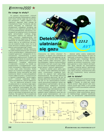 Do czego to służy? Po pipkach dręczycielach i różnych mniej lub bardziej interesujących zabaw− kach mamy zamiar zająć się czymś bar− dzo poważnym − walką z jednym z naj− większych zagrożeń, jakie czyhają na mieszkańców miast. To dziwne, ale sta− tystyki dowodzą, że większość nie− szczęśliwych wypadków przydarza się ludziom w ich własnych domach! Brzmi to trochę paradoksalnie, ale łatwiej o nie− szczęście we własnej kuchni niż podczas jazdy samochodem ruchliwą drogą. Tymczasem właśnie we własnych do− mach trzymamy niejednokrotnie coś w rodzaju bomby zegarowej. Bomby na− stawionej na nieznaną godzinę, o której wiemy tylko to, że wybuchnie, ale jesz− cze nie wiadomo kiedy. Autor ma tu na myśli domowe instalacje gazowe i urzą− dzenia wykorzystujące gaz miejski. Jedyną radykalną metodą zapewnie− nia sobie bezpieczeństwa jest usunięcie z domu przestarzałych i niebezpiecznych urządzeń gazowych i zastąpienie ich no− woczesnymi i komfortowymi w użyciu urządzeniami elektrycznymi. Problem nie polega jednak jedynie na wysokiej cenie kuchenek czy elektrycznych piecyków kąpielowych. Instalacje elektryczne w większości mieszkań nie zostały za− projektowane z uwzględnieniem możli− wości korzystania z odbiorników energii o mocy rzędu wielu kilowatów. Dobry piecyk czy kuchenka wymagają instalacji trójfazowej, której wykonanie jest dość kosztowne. Zatem w wielu przypadkach musimy dalej korzystać z umieszczonych w naszych mieszkaniach “bomb zegaro− wych”, z których najbardziej niebez− pieczne są piekarniki i piecyki kąpielowe. Czy my, elektronicy amatorzy może− my jakoś pomóc w usunięciu tego zagro− żenia? Wydaje się to być wątpliwe, prze− cież urządzenia wykrywające fakt ulat− niania się gazu muszą być niesłychanie skomplikowane i kosztowne i ich wyko− nanie w warunkach amatorskich jest nie− możliwe. Tak sądzicie? No to popatrzcie przez chwilę na wykaz elementów za− Detektor ulatniania się gazu 2212 mieszczony na końcu artykułu! To wszystko, co będzie nam potrzebne do wykonania czujnika ulatniającego się ga− zu! Dwa tanie, bardzo łatwo dostępne układy scalone, jeden tranzystor i gars− tka drobiazgów. Jedyny trochę droższym elementem jest sam czujnik typu AF50. Ale czy warto oszczędzać na bezpieczeń− stwie naszym i naszych najbliższych? Postawmy jednak jasno jedną spra− wę: żadne, nawet najbardziej skompliko− wane i nowoczesne urządzenie tech− niczne nie zapewni nam całkowitego bezpieczeństwa. Nie istnieją całkowicie pewne instalacje alarmowe, tak jak nie istnieją całkowicie niezawodne hamulce. Tak jak nic nie usprawiedliwia przekra− czania dozwolonej prędkości nawet naj− wspanialszym samochodem, tak też po− siadanie nawet najlepszych czujników elektronicznych nie może usprawiedli− wić nieostrożnego obchodzenia się z do− mową instalacją gazową. W wielu wy− padkach nasze urządzenie może nas ura− tować przed nieszczęściem, ale w in− nych, tak jak każde inne, może zawieść. Jeszcze jedna ważna wiadomość: proponowany układ reaguje nie tylko na obecność w powietrzu metanu, główne− go składnika gazu miejskiego. Równie skutecznie wykrywa on butan, którym zasilane są kuchenki turystyczne i insta− lacje gazowe w wielu małych domkach. Tam także zdarzały się nieszczęśliwe wypadki! O jeszcze jednym zastosowa− niu naszego czujnika wspomnimy w dal− szej części artykułu, przeznaczonej tylko dla tych Czytelników, którzy ukończyli już 18 lat. Jak to działa? Schemat elektryczny proponowanego urządzenia przedstawiony został na ry− sunku 1 1. Prawda, że układ jest niesły− chanie prosty? Jego sercem jest oczy− wiście czujnik typu AF50 i o nim przede wszystkim musimy powiedzieć sobie pa− rę słów. Do detekcji obecności gazu (metanu) w powietrzu układ wykorzystuje zjawis− ko katalitycznego spalania cząsteczek gazu na powierzchni półprzewodnika Rys. 1. Schemat ideowy detektora. 58 ELEKTRONIKA DLA WSZYSTKICH 6/97 specjalnego rodzaju. Spalający się gaz pochłania tlen zawarty w strukturze pół− przewodnika, powodując zmniejszenia się jego oporności. Z kolei jeżeli sensor zostanie umieszczony w atmosferze wolnej od gazu, rozpoczyna się pochła− nianie tlenu z powietrza i powrót senso− ra do normalnej oporności. Opisane zja− wiska mogą być wyraźnie zauważalne je− dynie w podwyższonej temperaturze i dlatego czujnik wyposażony jest w spe− cjalną grzałkę. Zapewnia ona podgrzanie struktury sensora do temperatury ponad 300oC i od stabilnej pracy tej grzałki zale− ży w dużym stopniu niezawodność całe− go urządzenia. Cały nasz układ zasilany jest stabilizowanym napięciem 9VDC, a do zasilania grzałki zastosowano jesz− cze dodatkowy stabilizator 5VDC, co za− pewnia bardzo stabilne warunki pracy czujnika. Sensor czujnika został włączony jako jeden z czterech rezystorów w mostku pomiarowym. Po jego nagrzaniu przez grzałkę warunki pracy ustalają się i mo− żemy za pomocą potencjometru monta− żowego PR1 ustawić na wejściu 3 wzmacniacza operacyjnego napięcie nieco niższe od napięcia na wejściu 2. W takiej sytuacji na wyjściu wzmacnia− cza pracującego jako komparator napię− cia występuje napięcie ok. 1,7V i tran− zystor T1 nie przewodzi. Jeżeli teraz w powietrzu znajdzie się domieszka ga− zu, to zgodnie z tym, co powiedzieliśmy wyżej rezystancja sensora zmniejszy się. Jeżeli na wejściu 2 wzmacniacza napię− cie stanie się mniejsze niż na wejściu 3, to na wyjściu wzmacniacza powstanie napięcie bliskie dodatniemu napięciu za− silania i tranzystor T1 zacznie przewo− dzić, włączając “piszczyk” − głośniczek piezo z wbudowanym generatorem. Stabilizator scalony U2 pełni w ukła− dzie bardzo ważną funkcję: dostarcza dobrze stabilizowanego napięcia +5VDC do zasila