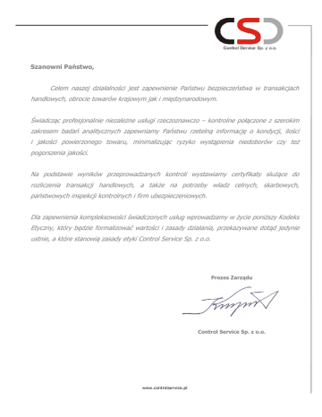 Szanowni Państwo, Celem naszej działalności jest zapewnienie Państwu bezpieczeństwa w transakcjach handlowych, obrocie towarów krajowym jak i międzynarodowym. Świadcząc profesjonalnie niezależne usługi rzeczoznawczo – kontrolne połączone z szerokim zakresem badań analitycznych zapewniamy Państwu rzetelną informację o kondycji, ilości i jakości powierzonego towaru, minimalizując ryzyko wystąpienia niedoborów czy też pogorszenia jakości. Na podstawie wyników przeprowadzanych kontroli wystawiamy certyfikaty służące do rozliczenia transakcji handlowych, a także na potrzeby władz celnych, skarbowych, państwowych inspekcji kontrolnych i firm ubezpieczeniowych. Dla zapewnienia kompleksowości świadczonych usług wprowadzamy w życie poniższy Kodeks Etyczny, który będzie formalizować wartości i zasady działania, przekazywane dotąd jedynie ustnie, a które stanowią zasady etyki Control Service Sp. z o.o. Prezes Zarządu Control Service Sp. z o.o. www.controlservice.pl Cel i zakres obowiązywania Kodeks Etyczny służy kompleksowemu przedstawieniu zasad wspólnych dla firmy Control Service, naszej kadry zarządzającej oraz dla naszych pracowników. Nasz Kodeks ma zapobiegać popełnianiu błędów i popierać omówione poniżej wartości i zasady, a także pomagać w sytuacjach dwuznacznych. Choć wytyczne, wskazówki, instrukcje oraz podręczniki przedsiębiorstw i obszarów działania firmy Control Service nie stanowią integralnej części Kodeksu Etycznego, to odzwierciedlają one wartości i zasady zawarte w tym dokumencie. Przestrzegania tych wartości i zasad oczekuje się zarówno od Członków Zarządu jak i od wszystkich pracowników. Zakres obowiązywania tych zasad rozciąga się zasadniczo na wszystkich pracowników i obszary działania firmy, o ile pozwalają na to obowiązujące w danym przypadku przepisy prawa. Stać na straży tych przepisów należy również do naszych obowiązków. Prawo i standardy postępowania Firma Control Service przestrzega wszelkich ustaw i innych miarodajnych przepisów obowiązujących w kraju i za granicą. Ponadto firma Control Service promuje i wspiera krzewienie zasad Kodeksu Postępowania Międzynarodowej Izby Handlowej ICC „Wytyczne postępowania w walce z korupcją w biznesie”. Kluczowe wartości pracowników firmy Control Service 1. Konsekwencja w dążeniu do celu • Sumiennie realizuję swoje zadania. • Z determinacją dążę do osiągnięcia celu. • Angażuję się w swoją pracę. • Pytam, gdy mam wątpliwości. 2. Współpraca • Współdziałam z innymi dla dobra firmy. • W sposób jasny komunikuję się z innymi. • Współpracując z innymi buduję zaufanie. • Sukces zespołu jest najważniejszy. www.controlservice.pl 3. Uczciwość • Postępuję uczciwie wobec siebie i innych. • Otwarcie wyrażam swoje zdanie. • Postępuję zgodnie z zasadami Kodeksu Etycznego. • Szanuję mienie firmy. 4. Profesjonalizm • Chcę być ekspertem w swojej dziedzinie. • Dążę do najwyższej jakości. • Odnoszę się z szacunkiem do klientów i pracowników, niezależnie od zajmowanego przez nich stanowiska. • Rozwijam swoje kompetencje. 5. Odpowiedzialność • Dotrzymuję danego słowa. • Biorę odpowiedzialność za swoje działania oraz za zespół, którym zarządzam. • Nie daję obietnic bez pokrycia. • Zawsze kończę rozpoczęte zadania. 6. Przedsiębiorczość • Identyfikuję się ze swoją pracą i firmą. • Chętnie podejmuję się nowych zadań. • Świadomie podejmuję ryzyko. • Dbam o koszty. • Do zmiany podchodzę elastycznie i kreatywnie. Ciągły rozwój Niniejszy Kodeks Etyczny nie stanowi wprawdzie dla firmy Control Service prawnie wiążących zobowiązań ani też nie upoważnia pracowników czy innych osób do jakichkolwiek roszczeń prawnych, jednak dokonując ciągłej rewizji tego Kodeksu oraz naszego dotychczasowego zachowania dokonujemy jednocześnie oceny naszych doświadczeń, aby móc stale dbać o coraz bardziej konsekwentne przestrzeganie zasad i wartości zawartych w tym Kodeksie. www.controlservice.pl Etyka zawodowa Kontroler podejmuje się tylko tych zadań, jakie leżą w zakresie jego wiedzy fachowej. W przypadku, gdy zadanie przekracza granice jego kompetencji zawodowych, powinien zwrócić się o współpracę do właściwych ekspertów. Kontroler jest odpowiedzialny za organizację i realizację swoich zadań. Musi uzyskać jasne sprecyzowanie usług, jakich się od niego oczekuje. Przy realizacji swoich zadań, podejmuje wszelkie niezbędne środki w celu przezwyciężenia występujących trudności, przy jednoczesnym zapewnieniu bezpieczeństwa ludzi oraz majątku. Kontroler dąży do wysokiego poziomu osiągnięć technicznych, w tym również stosowanych technologii, które przyczyniać się będą do zachowania zdrowego i przyjemnego środowiska życia. Etyka osobista Kontroler zobowiązany jest utrzymywać swoją wiedzę fachową na najwyższym poziomie, mając na uwadze dążenie do perfekcyjności świadczonych przez siebie usług, zgodnie z tym wszystkim, co uważane jest za dobrą praktykę w jego zawodzie, uwzględniając przy tym porządek prawny kraju, w którym pracuje. Jego integralność zawodowa oraz uczciwość intelektualna gwarantują obiektywność analiz, oceny, jak również podejmowanie konsekwentnych decyzji. Kontroler uważa się za związanego sumieniem przez jakąkolwiek poufną umowę biznesu, do której dobrowolnie przystąpił. Nie przyjmuje on innych form gratyfikacji poza uzgodnionymi ze swoim pracodawcą. Etyka społeczna Kontroler powinien: - respektować prawa osobiste swoich zwierzchników, kolegów i podwładnych poprzez wychodzenie naprzeciw ich potrzebom i aspiracjom, oczywiście pod warunkiem, iż są one zgodne z obowiązującym prawem oraz etyką ich zawodów, - nieprzerwanie mieć na względzie dobro otaczającej przyrody, środowiska, zdrowia i bezpieczeństwa oraz wykonywać swoj