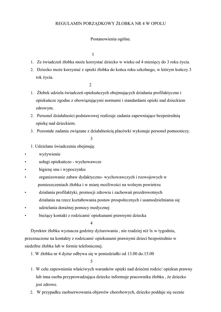 REGULAMIN PORZĄDKOWY ŻŁOBKA NR 4 W OPOLU Postanowienia ogólne. 1 1. Ze świadczeń żłobka może korzystać dziecko w wieku od 4 miesięcy do 3 roku życia. 2. Dziecko może korzystać z opieki żłobka do końca roku szkolnego, w którym kończy 3 rok życia. 2 1. Żłobek udziela świadczeń opiekuńczych obejmujących działania profilaktyczne i opiekuńcze zgodne z obowiązującymi normami i standardami opieki nad dzieckiem zdrowym. 2. Personel działalności podstawowej realizuje zadania zapewniające bezpośrednią opiekę nad dzieckiem. 3. Pozostałe zadania związane z działalnością placówki wykonuje personel pomocniczy. 3 1. Udzielane świadczenia obejmują: • wyżywienie • usługi opiekuńczo - wychowawcze • higienę snu i wypoczynku • organizowanie zabaw dydaktyczno- wychowawczych i rozwojowych w pomieszczeniach żłobka i w miarę możliwości na wolnym powietrzu • działania profilaktyki, promocji zdrowia i zachowań prozdrowotnych działania na rzecz kształtowania postaw prospołecznych i usamodzielniania się • udzielania doraźnej pomocy medycznej • bieżący kontakt z rodzicami/ opiekunami prawnymi dziecka 4 Dyrektor żłobka wyznacza godziny dyżurowania , nie rzadziej niż lx w tygodniu, przeznaczone na kontakty z rodzicami/ opiekunami prawnymi dzieci bezpośrednio w siedzibie żłobka lub w formie telefonicznej. 1. W żłobku nr 4 dyżur odbywa się w poniedziałki od 13.00 do.15.00 5 1. W celu zapewnienia właściwych warunków opieki nad dziećmi rodzic/ opiekun prawny lub inna osoba przyprowadzająca dziecko informuje pracownika żłobka , że dziecko jest zdrowe. 2. W przypadku zaobserwowania objawów chorobowych, dziecko poddaje się ocenie pielęgniarki lub opiekunki. Jeżeli stwierdzi się jakiekolwiek objawy chorobowe dziecko odsyła się wraz z rodzicem lub inną osoba upoważnioną do lekarza. 3. W przypadku stwierdzenia objawów chorobowych w trakcie pobytu dziecka w żłobku, pielęgniarka lub opiekunka natychmiast informuje rodzica telefonicznie o sytuacji. Rodzic jest zobowiązany w jak najkrótszym możliwym terminie odebrać dziecko z placówki i udać się z nim do lekarza. 4. W przypadku braku możliwości kontaktu z rodzicem ,pogarszania się stanu dziecka i nieobecności rodzica, pielęgniarka lub opiekunka ma obowiązek wezwać pogotowie ratunkowe i w miarę możliwości poinformować o tym fakcie rodziców. 6 1. Rodzice dzieci nie uczęszczających do żłobka z powodu choroby przed ponownym przyjściem muszą przedstawić zaświadczenie lekarza o dobrym stanie zdrowia po przebytej chorobie. 2. Rodzice obowiązani są informować personel żłobka^ każdym zachorowaniu lub innej przyczynie nieobecności dziecka w żłobku. Nieusprawiedliwiona nieobecność powyżej 7 dni może skutkować skreśleniem dziecka z listy dzieci uczęszczających do żłobka. 3. Rodzice na piśmie zostaną poinformowani o skreśleniu z listy. 7 Po przyjęciu dziecka do żłobka pozostaje ono pod stałą opieką fachowego personelu przez cały okres pobytu, aż do odebrania go przez rodzica lub inną upoważniona osobę. 8 1. Jeżeli dziecko ma inne niż rówieśnicy potrzeby jeżeli chodzi o dietę, higienę snu, warunki rozwoju psychomotorycznego lub emocjonalnego rodzice/ opiekunowie prawni winni są informować o tym fakcie personel, po to , aby w granicach możliwości żłobka zapewnić dziecku optymalne warunki rozwoju. 2. W przypadku konieczności stosowania specjalistycznej diety u dzieci z alergiami pokarmowymi konieczne jest poświadczenie przez lekarza wskazówek dotyczących żywienia dziecka. 9 1. Rodzice/ opiekunowie prawni dziecka informowani są przez personel żłobka o wszelkich niepokojących objawach chorobowych u dziecka , aby ograniczyć lub nie dopuścić do rozwoju choroby u dziecka a także u innych dzieci. 2. Personel jest obowiązany do informowania o stanie psychofizycznym, emocjonalnym dziecka, a także o odstępstwach od norm rozwojowych właściwych dla rówieśników. 3. Jeżeli zachowania dziecka wskazują na takie odstępstwa lub jeśli zachowania objawiają się nadmierną nadpobudliwością czy agresją zagrażającą bezpieczeństwu życia lub zdrowia samego dziecka lub innych dzieci i personelu żłobka personel informuje rodziców/opiekunów prawnych dziecka oraz dyrektora. Czynności te są dokumentowane w karcie zdrowia dziecka . Rodzic może być poproszony o osobistą obserwację dziecka w grupie, najlepiej w sposób zalecony przez psychologa/ pedagoga. Dyrektor może prosić o opinię psychologa wydana przez poradnię psychologiczno -pedagogiczną dla małych dzieci. Opinia może być podstawą do wnioskowania o zaprzestanie świadczenia usług przez żłobek. 4. Zaobserwowanie u dziecka sińców lub innych urazów poddaje się każdorazowo ocenie pielęgniarskiej. Jeżeli uzna ona, że urazy te mogą wskazywać na to, że są skutkiem stosowania wobec dziecka przemocy fizycznej ( bicia, molestowania) niezwłocznie powiadamia o tym fakcie dyrektora placówki oraz sporządza stosowną notatkę opatrzoną podpisem własnym i dyrektora. 5. O sporządzeniu notatki informuje się rodzica /opiekuna prawnego dziecka łub osobę upoważnioną. 6. Jeżeli urazy zostaną zaobserwowane ponownie , bądź jeśli urazy stwierdzone po raz pierwszy nie budzą u personelu żadnych wątpliwości, że są skutkiem stosowania przemocy fizycznej dyrektor żłobka jest zobowiązany skierować do najbliższej jednostki policji i prokuratury zawiadomienie o podejrzeniu popełnienia przestępstwa znęcania się nad dzieckiem. Do zawiadomienia dołącza się uwierzytelnione kserokopie dokumentacji sporządzonej przez pielęgniarkę i dyrektora placówki. 7. Jeżeli uraz wymaga natychmiastowej interwencji lekarza, dyrektor zobowiązany jest wezwać pogotowie ratunkowe, zawiadamiając jednocześnie policję i prokuraturę, a jeżeli to możliwe rodziców /opiekunów prawnych dziecka. 10 1. Dzieci mogą być odbierane tylko przez 