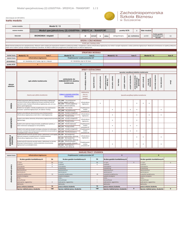 Moduł specjalnościowy (2) LOGISTYKA - SPEDYCJA - TRANSPORT 1/2 obowiązuje od: 2015/2016 karta modułu Moduł E/ 13 numer modułu Moduł specjalnościowy (2) LOGISTYKA - SPEDYCJA - TRANSPORT nazwa modułu EKONOMIA I stopień kierunek III rok 6 semestr punkty ECTS obligatoryjny status 8 lider modułu liczba godzin kontaktowych łącznie polski jęz. wykładowy 52 ISTOTA I CELE MODUŁU Krótki opis i katalog celów Moduł stanowi praktyczny kurs specjalnościowy. Głównym celem modułu jest wyposażenie studenta w praktyczną wiedzę i umiejętności z zakresu infrastruktury logistycznej oraz metod i narzędzi mapowania i analizy systemów logistycznych. Moduł jest zorientowany na aspekty praktyczne, dzięki czemu student uzyskuje niezbędne kompetencje zawodowe. W efekcie student jest przygotowany do podjęcia pracy w sektorze logistycznym. STRUKTURA MODUŁU numer kursu Moduł E/ 13 kurs 1 Moduł E/ 13 kurs 2 nazwa kursu Infrastruktura logistyczna Projektowanie i analiza procesów LST prowadzący dr I. Dembińska; dr B. Tundys, mgr inż. J. Myszak dr I. Dembińska; mgr inż. M. Sowa punkty ECTS 4 4 Moduł E/ 13 kurs 3 Moduł E/ 13 kurs 4 WIEDZA UMIEJĘTNOŚCI KOMPETENCJE SPOŁECZNE Student poprawnie definiuje składniki infrastruktury logistycznej, rozróżnia infrastrukturę logistyczną liniową i punktową, potrafi wymienić cechy i funkcje infrastruktury logistycznej, wie, co to są centra i parki logistyczne. Student zna narzędzia i metody projektowania oraz analizowania procesów i systemów logistycznych, ich zadania i funkcje. KE1_W02 Zna podstawowe procesy i pojęcia z zakresu KE1_W13 Posiada pogłębioną wiedzę w zakresie wybranej specjalności;Zna znametody podstawowe KE1_W10 uwagi inne aktywności case study zespołowo case study indywidualnie udział w dyskusji prezentacja zadania indywidualnego / grupowego projekt indywidualne projekt zespołowe Sposób weryfikacji efektu kształcenia Infrastruktura logistyczna statystyczne, oraz inne – w tym KE1_W09 Ma podstawową wiedzę o metodach i narzędziach Student umie dokonać ekonomicznej oceny funkcjonowania KE1_U14 Posiada umiejętności infrastruktury logistycznej w skali mikro i makrologistycznej. adekwatne do wybranej KE1_U15 Posiada wiedzę praktyczną, umożliwiającą podjęcie Student umie dobrać elementy infrastruktury logistycznej do procesu KE1_U14 Posiada umiejętności logistycznego. adekwatne do wybranej KE1_U15 Posiada wiedzę praktyczną, umożliwiającą podjęcie Student umie wykonać mapy procesów, projektować systemy, a KE1_U05 Potrafi analizować także analizować występujące w nich problemy. działania i procesy zachodzące w KE1_U15 Posiada wiedzę praktyczną, umożliwiającą podjęcie Student umie wykonać projekt oceniający sytuację oraz wskazujący KE1_U14 Posiada umiejętności warianty rozwiązań dla funkcjonowania systemów oraz procesów w adekwatne do wybranej KE1_U10 Potrafi pracować w przedsiębiorstwie i łańcuchu dostaw. zespole rozwiązującym konkretne Student potrafi krytycznie wyrażać opinie i dyskutować rozstrzygając KE1_K01 Ma świadomość dylematy związane z projektowaniem i funkcjonowaniem poziomu swojej wiedzy, dokonuje infrastruktury logistycznej w Polsce i na świecie. samoocenyMa własnych kompetencji, KE1_K01 świadomość poziomu swojej wiedzy, dokonuje Student potrafi krytycznie wyrażać opinie i dyskutować na tematy KE1_K04 Potrafi pracować i dotyczące funkcjonowania i analizy systemów oraz procesów współdziałać w grupie, aktywnie logistycznych w przedsiębiorstwie. uczestniczyMyśli w grupach, KE1_K03 logicznie i analitycznie, jest zdolny do samodzielnej pracy badawczej, test wiedzy Adekwatny kurs w ramach modułu ćwiczenia, zadania ZOBACZ LEGENDĘ EFEKTÓW KSZTAŁCENIA praca pisemna (esej, referat, itp.) Zwarty opis efektu kształcenia obszar efektów zaliczenie pisemne odniesienie do KIERUNKOWYCH efektów kształcenia sposoby weryfikacji efektów kształcenia egzamin pisemny opis efektu kształcenia kurs realizujący dany efekt EFEKTY KSZTAŁCENIA x x x x Projektowanie i analiza procesów LST x Infrastruktura logistyczna x x x Infrastruktura logistyczna x x x Projektowanie i analiza procesów LST Projektowanie i analiza procesów LST x x x x x x x x Infrastruktura logistyczna Projektowanie i analiza procesów LST x x x x x x x x x NAKŁAD PRACY STUDENTA nazwa kursu Infrastruktura logistyczna struktura nakładu pracy liczba godzin kontaktowych w tym: wykład ćwiczenia e-learning laboratorium seminarium warsztat praktyczny wizyta studyjna inne… konsultacje zaliczenia, egzaminy Projektowanie i analiza procesów LST 26 26 6 6 12 2 lektoraty praca własna studenta łączny nakład pracy studenta liczba godzin kontaktowych w tym: wykład ćwiczenia e-learning laboratorium seminarium warsztat praktyczny wizyta studyjna inne… konsultacje zaliczenia, egzaminy 0 26 liczba godzin kontaktowych 26 6 w tym: wykład ćwiczenia e-learning laboratorium seminarium warsztat praktyczny wizyta studyjna inne… konsultacje zaliczenia, egzaminy 18 1 1 lektoraty 74 100 praca własna studenta łączny nakład pracy studenta 0 liczba godzin kontaktowych 0 lektoraty 74 100 0 lektoraty praca własna studenta łączny nakład pracy studenta w tym: wykład ćwiczenia e-learning laboratorium seminarium warsztat praktyczny wizyta studyjna inne… konsultacje zaliczenia, egzaminy praca własna studenta 0 łączny nakład pracy studenta 0 Moduł specjalnościowy (2) LOGISTYKA - SPEDYCJA - TRANSPORT nazwa kursu Infrastruktura logistyczna 2/2 Projektowanie i analiza procesów LST 0 0 Adekwatne metody Adekwatne metody Które moduły/kursy powinien zaliczyć student przed rozpoczęciem kursu Które moduły/kursy powinien zaliczyć student przed rozpoczęciem kursu METODY DYDAKTYCZNE Adekwatne metody Adekwatne metody wykład prezentacja multimedialna film video dyskusja grupowa projekty indywidualne case study wykład prezentacja multimedialna ćwiczenia z wykorzystaniem 