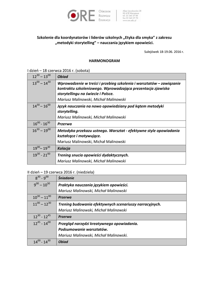 Szkolenie dla koordynatorów i liderów szkolnych „Etyka dla smyka” z zakresu „metodyki storytelling” – nauczania językiem opowieści. Sulejówek 18-19.06. 2016 r. HARMONOGRAM I dzień – 18 czerwca 2016 r. (sobota) 1230 – 1300 Obiad 1300 – 1430 Wprowadzenie w treści i przebieg szkolenia i warsztatów – zawiązanie kontraktu szkoleniowego. Wprowadzająca prezentacja zjawiska storytellingu na świecie i Polsce. Mariusz Malinowski, Michał Malinowski 1430 – 1600 Język nauczania na nowo opowiedziany pod kątem metodyki storytelling. Mariusz Malinowski, Michał Malinowski 1600 - 1630 Przerwa 30 16 – 19 00 1900– 1930 30 19 - 21 00 Metodyka przekazu ustnego. Warsztat - efektywne style opowiadania kształcące i motywujące. Mariusz Malinowski, Michał Malinowski Kolacja Trening snucia opowieści dydaktycznych. Mariusz Malinowski, Michał Malinowski II dzień – 19 czerwca 2016 r. (niedziela) Śniadanie 830 - 900 900 – 1030 Praktyka nauczania językiem opowieści. Mariusz Malinowski, Michał Malinowski 1030 – 1100 Przerwa 00 11 – 12 30 Trening budowania efektywnych scenariuszy narracyjnych. Mariusz Malinowski, Michał Malinowski 1230 - 1245 Przerwa 1245 - 1400 Przegląd narzędzi kreatywnego opowiadania. Podsumowanie warsztatów. Mariusz Malinowski, Michał Malinowski. 1400 - 1430 Obiad Mariusz Malinowski, Michał Malinowski Proponujemy cykl szkoleń warsztatowych dla realizatorów programu „Etyka dla smyka” – podejmujący temat praktyki nowych zjawisk z dziedziny efektywnych metod nauczania. Źródła inspiracji. W dziedzinie metodyki nauczania trwają nieustanne poszukiwania nowego instrumentarium dydaktycznego pozwalającego – według współczesnej tendencji – podnosić efektywność nauczania i uczenia się w edukacji szkolnej w tym w zakresie naucza etyki w szkole. W ramach nowych trendów metodycznych na rynku idei z rozmachem pojawiło się ekscytujące zjawisko najczęściej określane mianem „storytelling”, które można by określić mianem renesansu sztuki żywego słowa manifestującego się w postaci opowiadania historii i snucia różnorakich stylistycznie i treściowo formułowanych opowieści. Liczne odmiany tego nurtu podkreślają pierwotny charakter ustnego przekazu wiedzy, którego sugestywność głęboko zapada w umysły i pamięć odbiorców. Ten właśnie fakt szczególnie intryguje wszystkich zainteresowanych skutecznym nauczaniem, efektywnym kształceniem mającym za zadanie inicjować i motywować efektywne uczenie się uczących. Dominująca obecnie „piśmienna” kultura edukacyjna zaczęła na nowo odkrywać wszystkie faktyczne walory komunikacyjnego przekazu słowem mówionym, którego słowo pisane z „martwa” literą tekstu - nie zawsze i wszędzie - może w pełni zastąpić. Odwoływanie się na nowo do energii - jaką posiada tradycyjny słowny przekaz wiedzy w dużej mierze jest wynikiem upowszechnienia się ogromnych zmian w dziedzinie mediów komunikacyjnych - cyfrowej doby Internetu! Obecnie już swobodnie technologicznie dominuje przekaz multimedialny - integralnie wykorzystujący pismo, audio i wideo. Tego rodzaju zmiany, zdają się dopominać o doprecyzowania - a może również stworzenie nowych ujęć dydaktycznych służących edukacji XXI wieku. Naprzeciw tym oczekiwaniom wychodzi generowana w laboratoriach akademickich idea „pedagogiki komplementarnej” starająca się uchwycić zagadnienia w modele teoretyczne, ale również dostarczyć wskazówek praktycznej jak realizować zadania wzajemnego „uzupełniania się” i „wspomagania” zarówno – tradycyjnych, jak i nowoczesnych form oraz nośników używanego, na co dzień języka nauczania. W oferowanym cyklu warsztatów pragniemy: zreferować, skomentować i zapropagować oraz przećwiczyć warsztatowo fenomen zjawiska tradycyjnego „storytellling” opartego na formach przekazu ustnego - na nowo zinterpretowanego pod kątem edukacyjnym oraz ukazać jego najnowszą wersję - „digitalstorytelling” sięgającą po multimedialne środki przekazu cyfrowego audio-wideo emitowane za pośrednictwem Internetu. Cykl warsztatów Poniżej przedstawiamy tematy cyklu warsztatów stażowych podejmujących następującą tematykę szkoleniową: Cykl warsztatów stażu metodycznego pod ogólnym kryptonimem – „Storytelling – nauczanie językiem opowieści - wsparcie dla dydaktyki szczegółowej nauczania etyki. Warsztat wprowadzający - Storytelling – na nowo opowiedziany. Warsztat 1. Storytelling – renesans sztuki opowiadania. Warsztat 2. Storytelling – genom „homo narrans”. Warsztat 3. Storytelling – żywioły dobrego opowiadania. Warsztat 4. Storytelling – język nauczania pełen opowieści. Warsztat 5. Storytelling – metodyka przekazu ustnego. Warsztat 6. Storytelling – praktyka nauczania językiem opowieści.