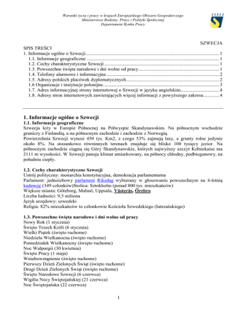 Warunki życia i pracy w krajach Europejskiego Obszaru Gospodarczego Ministerstwo Rodziny, Pracy i Polityki Społecznej Departament Rynku Pracy SZWECJA SPIS TREŚCI 1. Informacje ogólne o Szwecji............................................................................................................ 1 1.1. Informacje geograficzne ........................................................................................................... 1 1.2. Cechy charakterystyczne Szwecji ............................................................................................. 1 1.3. Powszechne święta narodowe i dni wolne od pracy ................................................................. 1 1.4. Telefony alarmowe i informacyjne ........................................................................................... 2 1.5. Adresy polskich placówek dyplomatycznych ........................................................................... 2 1.6 Organizacje i instytucje polonijne.............................................................................................. 3 1.7. Adres informacyjnej strony internetowej o Szwecji w języku angielskim ............................... 4 1.8. Adresy stron internetowych zawierających więcej informacji z powyższego zakresu............. 4 1. Informacje ogólne o Szwecji 1.1. Informacje geograficzne Szwecja leży w Europie Północnej na Półwyspie Skandynawskim. Na północnym wschodzie graniczy z Finlandią, a na północnym zachodzie i zachodzie z Norwegią. Powierzchnia Szwecji wynosi 450 tys. Km2, z czego 53% zajmują lasy, a grunty rolne jedynie około 8%. Na stosunkowo równinnych terenach znajduje się blisko 100 tysięcy jezior. Na północnym zachodzie ciągną się Góry Skandynawskie, których najwyższy szczyt Kebnekaise ma 2111 m wysokości. W Szwecji panuje klimat umiarkowany, na północy chłodny, podbiegunowy, na południu ciepły. 1.2. Cechy charakterystyczne Szwecji Ustrój polityczny: monarchia konstytucyjna, demokracja parlamentarna Parlament: jednoizbowy parlament Riksdag wybierany w głosowaniu powszechnym na 4-letnią kadencję (349 członków)Stolica: Sztokholm (ponad 800 tys. mieszkańców) Większe miasta: Göteborg, Malmö, Uppsala, Västerås, Örebro Liczba ludności: 9,5 miliona Język urzędowy: szwedzki Religia: 82% mieszkańców to członkowie Kościoła Szwedzkiego (luterańskiego) 1.3. Powszechne święta narodowe i dni wolne od pracy Nowy Rok (1 stycznia) Święto Trzech Króli (6 stycznia) Wielki Piątek (święto ruchome) Niedziela Wielkanocna (święto ruchome) Poniedziałek Wielkanocny (święto ruchome) Noc Walpurgii (30 kwietnia) Święto Pracy (1 maja) Wniebowstąpienie (święto ruchome) Pierwszy Dzień Zielonych Świąt (święto ruchome) Drugi Dzień Zielonych Świąt (święto ruchome) Święto Narodowe Szwecji (6 czerwca) Wigilia Nocy Świętojańskiej (21 czerwca) Noc Świętojańska (22 czerwca) 1 Warunki życia i pracy w krajach Europejskiego Obszaru Gospodarczego Ministerstwo Rodziny, Pracy i Polityki Społecznej Departament Rynku Pracy Wszystkich Świętych (2 listopada) Dzień św. Łucji (13 grudnia) Boże Narodzenie (25 grudnia) Drugi Dzień Bożego Narodzenia (26 grudnia) 1.4. Telefony alarmowe i informacyjne Telefon w razie nagłych wypadków (policja, straż pożarna, pogotowie) ma numer 112 i jest bezpłatny. Dzwoniąc do Szwecji, należy najpierw wykręcić numer kierunkowy kraju - 0046, następnie numer kierunkowy miasta (bez zera), a potem numer abonenta. 1.5. Adresy polskich placówek dyplomatycznych Ambasada Rzeczypospolitej Polskiej w Sztokholmie Wiesław Tarka- Ambasador Nadzwyczajny i Pełnomocny Adres: Karlavägen 35, 114 31 Stockholm Telefon: 0046 (0)8-50 57 50 00 Fax: 0046 (0)8-50 57 50 86 E-mail: [email protected] Ambasada czynna jest od poniedziałku do piątku w godzinach - od 08.00 do 16.00. WEB: http://sztokholm.msz.gov.pl/pl/ Wydział Konsularny Ambasady Polskiej w Sztokholmie Barbara Sośnicka - radca - minister – konsul RP, kierownik Wydziału Konsularnego Adres: Prästgårdsgatan 5, 172 32 Sundbyberg Telefon: 0046 (0)8 - 50575060 Fax: 0046 (0)8 - 50575074E-mail: [email protected] WEB: http://www.sztokholm.msz.gov.pl/pl/informacje_konsularne/ Dni i godziny przyjęć: poniedziałek, środa, czwartek i piątek: godz. 10.00-15.00, wtorek: godz.13.00-18.00 Informacja telefoniczna: poniedziałek, środa, czwartek i piątek: godz. 9.00-16.00, wtorek: godz.12.00-19.00 Tel. alarmowy do konsula dyżurnego funkcjonujący wyłącznie po godzinach pracy urzędu i w dni wolne od pracy w sprawach wymagających natychmiastowej interwencji konsularnej: 0046-(0)709220-892 Alarmowy adres mailowy czynny poza normalnymi godzinami urzędowania: [email protected] W celu podniesienia jakości obsługi interesantów z dniem 1 sierpnia 2013 r. wprowadzony został obowiązek umawiania wizyt w urzędzie w sprawach paszportowych, obywatelskich, prawnych oraz wizowych poprzez internetowy adres e-Konsulat : http://www.e-konsulat.gov.pl/ UWAGA: Z dniem 1 listopada 2015 r. weszła w życie ustawa z dnia 25 czerwca 2015 r. Prawo Konsularne (Dz.U. z 2015 r. poz. 1274): http://dziennikustaw.gov.pl/du/2015/1274 , która wprowadza między innymi tryb postępowania przed konsulem. 2 Warunki życia i pracy w krajach Europejskiego Obszaru Gospodarczego Ministerstwo Rodziny, Pracy i Polityki Społecznej Departament Rynku Pracy Istotną zmianą jest, iż wnioski o wszczęcie postępowania, zgodnie z art. 74 ustawy z dnia 25 czerwca 2015 r. Prawo Konsularne (Dz.U. z 2015 r. poz. 1274), składa się ustnie lub pisemnie. Oznacza to, że wnioski składa się osobiście w urzędzie lub pocztą. We wniosku zamieszcza się (art. 75 ustawy): żądanie, imię i nazwisko strony, jej podpis oraz adres zamieszkania. Jeżeli wniosek nie czyni zadość powyższym wymaganiom, pozostawia się go bez rozpoznania. KONSULAT HONOROWY RZECZYPOSPOLITEJ POLSKIEJ W HALMSTAD Adres Konsulatu: Brogatan 42 Adres pocztowy: Box 7