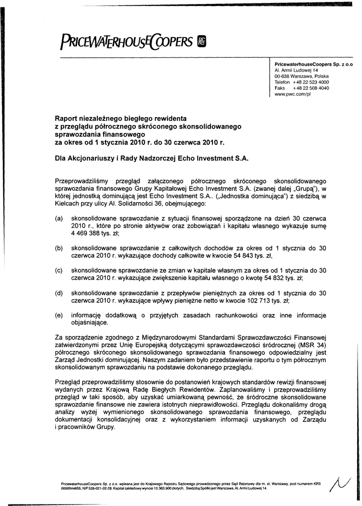 PrlcewaterhouseCoopers Sp. z o.o AL Armii Ludowej 14 00-638 Warszawa, Polska Telefon +48225234000 Faks +48 22 508 4040 www.pwc.com/pl Raport niezależnego biegłego rewidenta z przeglądu półrocznego skróconego skonsolidowanego sprawozdania finansowego za okres od 1 stycznia 2010 r. do 30 czerwca 2010 r. Dla Akcjonariuszy i Rady Nadzorczej Echo lnvestment S.A. Przeprowadziliśmy przegląd załączonego półrocznego skróconego skonsolidowanego sprawozdania finansowego Grupy Kapitałowej Echo lnvestment S.A. (zwanej dalej „Grupą"), w której jednostką dominującą jest Echo lnvestment SA. („Jednostka dominująca") z siedzibą w Kielcach przy ulicy Al. Solidarności 36, obejmującego: (a) skonsolidowane sprawozdanie z sytuacji finansowej sporządzone na dzień 30 czerwca 2010 r., które po stronie aktywów oraz zobowiązań i kapitału własnego wykazuje sumę 4 469 388 tyś. zł; (b) skonsolidowane sprawozdanie z całkowitych dochodów za okres od 1 stycznia do 30 czerwca 2010 r. wykazujące dochody całkowite w kwocie 54 843 tyś. zł, (c) skonsolidowane sprawozdanie ze zmian w kapitale własnym za okres od 1 stycznia do 30 czerwca 2010 r. wykazujące zwiększenie kapitału własnego o kwotę 54 832 tyś. zł; (d) skonsolidowane sprawozdanie z przepływów pieniężnych za okres od 1 stycznia do 30 czerwca 2010 r. wykazujące wpływy pieniężne netto w kwocie 102 713 tyś. zł; (e) informację dodatkową o przyjętych zasadach rachunkowości oraz inne informacje objaśniające. Za sporządzenie zgodnego z Międzynarodowymi Standardami Sprawozdawczości Finansowej zatwierdzonymi przez Unię Europejską dotyczącymi sprawozdawczości śródrocznej (MSR 34) półrocznego skróconego skonsolidowanego sprawozdania finansowego odpowiedzialny jest Zarząd Jednostki dominującej. Naszym zadaniem było przedstawienie raportu o tym półrocznym skonsolidowanym sprawozdaniu na podstawie dokonanego przeglądu. Przegląd przeprowadziliśmy stosownie do postanowień krajowych standardów rewizji finansowej wydanych przez Krajową Radę Biegłych Rewidentów. Zaplanowaliśmy i przeprowadziliśmy przegląd w taki sposób, aby uzyskać umiarkowaną pewność, że śródroczne skonsolidowane sprawozdanie finansowe nie zawiera istotnych nieprawidłowości. Przeglądu dokonaliśmy drogą analizy wyżej wymienionego skonsolidowanego sprawozdania finansowego, przeglądu dokumentacji konsolidacyjnej oraz z wykorzystaniem informacji uzyskanych od Zarządu i pracowników Grupy. PrtcewaterhouseCoopers Sp. z o.o. wpisana jest do Krajowego Rejestru Sądowego prowadzonego przez Sad Rejonowy dla m. st Warszawy, pod numerem KRS 0000044655, NIP 526-021 -02-28. Kapitał zakładowy wynosi 10.363.900 złotych. Siedzibą Spółki jest Warszawa, Al, Armii Ludowej 14. Zakres i metoda wykonanych prac były znacząco mniejsze od zakresu badania skonsolidowanego sprawozdania finansowego, ponieważ celem przeglądu nie było wyrażenie opinii o zgodności z wymagającymi zastosowania zasadami (polityką) rachunkowości oraz rzetelności i jasności półrocznego skróconego skonsolidowanego sprawozdania finansowego. Niniejszy raport nie stanowi opinii z badania skonsolidowanego sprawozdania finansowego w rozumieniu Ustawy o rachunkowości z dnia 29 września 1994 roku (Dz.U. z 2009r. Nr 152 póz. 1223 z późniejszymi zmianami). Na podstawie przeprowadzonego przeglądu nie zidentyfikowaliśmy niczego, co nie pozwoliłoby stwierdzić, że półroczne skrócone skonsolidowane sprawozdanie finansowe zostało przygotowane, we wszystkich istotnych aspektach, zgodnie z Międzynarodowym Standardem Rachunkowości 34 „Śródroczna sprawozdawczość finansowa". Przeprowadzający przegląd w imieniu PricewaterhouseCoopers Sp. z o.o., spółki wpisanej na listę podmiotów uprawnionych do badania sprawozdań finansowych pod numerem 144: Piotr Wyszogrodzki Kluczowy Biegły Rewident Numer ewidencyjny 90091 Warszawa, 27 sierpnia 2010 r.
