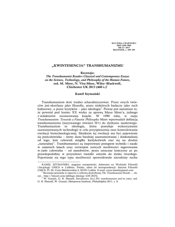 KULTURA I WARTOŚCI ISSN 2299-7806 NR 13/ 2015 RECENZJE, s. 189–199 „KWINTESENCJA” TRANSHUMANIZMU Recenzja: The Transhumanist Reader: Classical and Contemporary Essays on the Science, Technology, and Philosophy of the Human Future, red. M. More, N. Vita-More, Wiley–Blackwell, Chichester UK 2013 (460 s.)1 Kamil Szymański Transhumanizm dość trudno scharakteryzować. Przez swych twórców jest określany jako filozofia, przez niektórych badaczy jako ruch kulturowy, a przez krytyków – jako ideologia2. Pewne jest natomiast to, że powstał pod koniec XX wieku za sprawą Maxa More’a, jednego z redaktorów recenzowanej książki. W 1990 roku, w eseju Transhumanism: Towards a Futurist Philosophy More wprowadził definicję transhumanizmu (nazywanego również H+) do dyskursu naukowego. Transhumanizm to ideologia, która postuluje wykorzystanie zaawansowanych technologii w celu przyśpieszenia oraz kontrolowania ewolucji biotechnologicznej. Skutkiem tej ewolucji ma być pojawienie się postczłowieka – istoty dużo bardziej zaawansowanej i doskonalszej od tego, kim człowiek mógłby kiedykolwiek stać się na drodze „naturalnej”. Transhumanisci są inspirowani postępem techniki i nauki w ostatnich latach oraz rozwojem nowych możliwości ingerowania w ciało człowieka – od nanobotów, przez sztuczne kończyny aż po prawdopodobny w przyszłości transfer umysłu do dysku twardego. Pojawianie się tego typu możliwości spowodowało narodziny ruchu KAMIL SZYMAŃSKI, magister europeistyki, doktorant na Wydziale Filozofii i Socjologii UMCS w Lublinie, Polska; adres do korespondencji: Instytut Filozofii UMCS, Pl. M. Curie-Skłodowskiej 4, 20-031 Lublin. E-mail: [email protected] 1 Recenzja powstała w oparciu o cyfrową dystrybucję The Transhumanist Reader…, dz. cyt., http://tinyurl.com/p6r6qoc [dostęp: 4.05.2015]. 2 W. Grassie, G. R. Hansell, Introduction, [w:] H±: transhumanism and its critics, red. G. R. Hansell, W. Grassie, Metanexus Institute, Philadelphia 2011, s. 8. 190 Kamil Szymański, The Transhumanist Reader… transhumanistycznego, do którego należą najwięksi technoentuzjaści XXI wieku: od redaktorów książki, Natashy i Maxa More’ów, przez Adama Sandberga i Nicka Bostroma – pracujących na Uniwersytecie Oxfordzkim w Future of Humanity Institute, aż po Ray’a Kurzweila, futurologa z Singularity University w Dolinie Krzemowej w Kalifornii3. Od narodzin transhumanizmu do czasów ukazania się recenzowanej publikacji upłynęło ponad 20 lat. Myśl ta wciąż nie jest jednak szczególnie znana w większości kręgów akademickich, w szczególności poza kulturą anglosaską. W Polsce ukazało się do tej pory jedynie dziesięć pozycji związanych z tematyką transhumanizmu4. Dlatego recenzowana książka wydaje się dobrym wprowadzeniem do zagadnień związanych z transhumanizmem. Książka jest zbiorem najważniejszych tekstów dotyczących filozofii (ideologii) transhumanistycznej, opublikowanych na przestrzeni ostatnich 25 lat. Mimo że niektóre teksty już dawno były opublikowane w Internecie, to dopiero wydanie książki dało czytelnikowi możliwość całościowego zapoznania się z kluczowymi tekstami na temat transhumanizmu. Książka została podzielona na dziewięć części: I. Roots and Core Themes: Max More, The Philosophy of Transhumanism; Natasha Vita-More, Aesthetics; Nick Bostrom, Why I Want to be a Posthuman When I Grow Up; Alexander Sasha Chislenko, Anders Sandberg, Arjen Kamphuis, Bernie Staring, Bill Fantegrossi, Darren Reynolds, David Pearce, Den Otter, Doug Bailey, Eugene Leitl, Gustavo Alves, Holger Wagner, Kathryn Aegis, Keith Elis, Lee Daniel Crocker, Max More, Mikhail Sverdlov, Natasha Vita-More, Nick Bostrom, Ralf Fletcher, Shane Spaulding, T.O. Morrow, Thom Quinn, Transhumanist Declaration; Anders Sandberg , Morphological Freedom – Why We Not Just Want It, but Need It. II. Human Enhancement: The Somatic Sphere: Robert A. Freitas Jr., Welcome to the Future of Medicine; Natasha Vita-More, Life Expansion Media; Laura Beloff , The Hybronaut Affair; William Sims Bainbridge, Transavatars; Rachel Armstrong, Alternative Biologies. 3 Więcej informacji na temat transhumanizmu można znaleźć w artykule Transhumanizm, opublikowanym w aktualnym numerze „Kultury i Wartości” s. 133– 152. 4 Dane za: Biblioteka Narodowa, http://www.bn.org.pl/ [dostęp: 4.05.2015]. 191 Kamil Szymański, The Transhumanist Reader… III. Human Enhancement: The Cognitive Sphere: Andy Clark, ReInventing Ourselves; Ben Goertzel, Artificial General Intelligence and the Future of Humanity; Alexander “Sasha” Chislenko, Intelligent Information Filters and Enhanced Reality; Randal A. Koene, Uploading to Substrate-Independent Minds; Ralph C. Merkle – Uploading. IV. Core Technologies: Marvin Minsky, Why Freud Was the First Good AI Theorist; Hans Moravec, Pigs in Cyberspace, J. Storrs Hall, Nanocomputers; Michael R. Rose, Immortalist Fictions and Strategies; Dialogue between Ray Kurzweil and Eric Drexler. V. Engines of Life: Identity and Beyond Death: Aubrey de Grey, The Curate’s Egg of Anti-Anti-Aging Bioethics; Brian Wowk, Medical Time Travel; James Hughes, Transhumanism and Personal Identity; Giulio Prisco, Transcendent Engineering. VI. Enhanced Decision-Making: Robin Hanson, Idea Futures; Max More, The Proactionary Principle; Mark S. Miller, The Open Society and Its Media. VII. Biopolitics and Policy: An Interview with Professor Michael H. Shapiro Performance Enhancement and Legal Theory; Andy Miah, Justifying Human Enhancement; Gregory Stock, The Battle for the Future; Martine Rothblatt, Mind is Deeper Than Matter; Ronald Bailey, For Enhancing People; Patrick D. Hopkins, Is Enhancement Worthy of Being a Right?; Wrye Sententia, Freedom by Design. VIII. Future Trajectories: Singularity: Vernor Vinge, Technological Singularity; Anders Sandberg, An Overview of Models of Technological Singularity; David Brin, Damien Broderick, Nick Bostrom, 