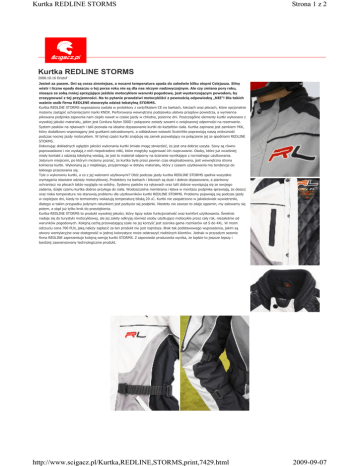 Kurtka REDLINE STORMS Strona 1 z 2 Kurtka REDLINE STORMS 2008.10.16 Eristof Jesień za pasem. Dni są coraz zimniejsze, a nocami temperatura spada do zaledwie kilku stopni Celsjusza. Silny wiatr i liczne opady deszczu o tej porze roku nie są dla nas niczym nadzwyczajnym. Ale czy zmiana pory roku, niosąca ze sobą mniej sprzyjające jeździe motocyklem warunki pogodowe, jest wystarczającym powodem, by zrezygnować z tej przyjemności. Na to pytanie prawdziwi motocykliści z pewnością odpowiedzą „NIE"! Dla takich waśnie osób firma REDLINE stworzyła odzieŜ tekstylną STORMS. Kurtka REDLINE STORMS wyposaŜona została w protektory z certyfikatem CE na barkach, łokciach oraz plecach, które opcjonalnie moŜemy zastąpić ochraniaczami marki KNOX. Perforowana wewnętrzna podszewka ułatwia przepływ powietrza, a wymienna pikowana podpinka zapewnia nam ciepło nawet w czasie jazdy w chłodne, jesienne dni. Poszczególne elementy kurtki wykonano z wysokiej jakości materiału, jakim jest Cordura Nylon 500D i połączone zostały szwami o zwiększonej odporności na rozerwanie. System pasków na rękawach i talii pozwala na idealne dopasowanie kurtki do kształtów ciała. Kurtka zapinana jest zamkiem YKK, który dodatkowo wspomagany jest guzikami zatrzaskowymi, a odblaskowe wstawki Scotchlite poprawiają naszą widoczność podczas nocnej jazdy motocyklem. W tylnej części kurtki znajduję się zamek pozwalający na połączenie jej ze spodniami REDLINE STORMS. Dokonując dokładnych oględzin jakości wykonania kurtki śmiało mogę stwierdzić, Ŝe jest ona dobrze uszyta. Szwy są równo poprowadzone i nie wystają z nich niepotrzebne nitki, które mogłyby sugerować ich rozpruwanie. Osoby, które juŜ wcześniej miały kontakt z odzieŜą tekstylną wiedzą, Ŝe jest to materiał odporny na ścieranie wynikające z normalnego uŜytkowania. Jedynym miejscem, po którym moŜemy poznać, Ŝe kurtka była przez pewien czas eksploatowana, jest wewnętrzna strona kołnierza kurtki. Wykonaną ją z miękkiego, przyjemnego w dotyku materiału, który z czasem uŜytkowania ma tendencje do lekkiego przecierania się. Tyle o wykonaniu kurtki, a co z jej walorami uŜytkowymi? OtóŜ podczas jazdy kurtka REDLINE STORMS spełnia wszystkie wymagania stawiane odzieŜy motocyklowej. Protektory na barkach i łokciach są duŜe i dobrze dopasowane, a piankowy ochraniacz na plecach takŜe wygląda na solidny. Systemy pasków na rękawach oraz talii dobrze wywiązują się ze swojego zadania, dzięki czemu kurtka dobrze przylega do ciała. Wodoszczelna membrana i łatwa w montaŜu podpinka sprawiają, Ŝe deszcz oraz niska temperatura nie stanowią problemu dla uŜytkowników kurtki REDLINE STORMS. Problemy pojawiają się podczas jazdy w cieplejsze dni, kiedy to termometry wskazują temperaturę bliską 20 oC. Kurtki nie zaopatrzono w jakiekolwiek wywietrzniki, dlatego w takim przypadku jedynym ratunkiem jest pozbycie się podpinki. Niestety nie zawsze to zdaje egzamin, my zalewamy się potem, a stąd juŜ tylko krok do przeziębienia. Kurtka REDLINE STORMS to produkt wysokiej jakości, który łączy sobie funkcjonalność oraz komfort uŜytkowania. Świetnie nadaje się do turystyki motocyklowej, ale jej zalety odkryją równieŜ osoby uŜytkujące motocykle przez cały rok, niezaleŜnie od warunków pogodowych. Kolejną cechą przewaŜającą szale na jej korzyść jest szeroka gama rozmiarów od S do 4XL. W moim odczuciu cena 700 PLN, jaką naleŜy zapłacić za ten produkt nie jest najniŜsza. Brak tak podstawowego wyposaŜenia, jakim są otwory wentylacyjne oraz dostępność w jednej kolorystyce moŜe odstraszyć niektórych klientów. Jednak w przyszłym sezonie firma REDLINE zaprezentuje kolejną wersję kurtki STORMS. Z zapowiedzi producenta wynika, Ŝe będzie to jeszcze lepszy i bardziej zaawansowany technologicznie produkt. http://www.scigacz.pl/Kurtka,REDLINE,STORMS,print,7429.html 2009-09-07 Kurtka REDLINE STORMS Strona 2 z 2 http://www.scigacz.pl/Kurtka,REDLINE,STORMS,print,7429.html 2009-09-07