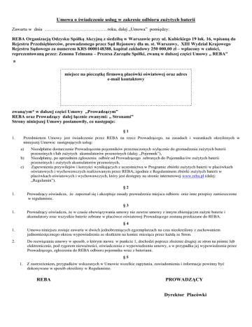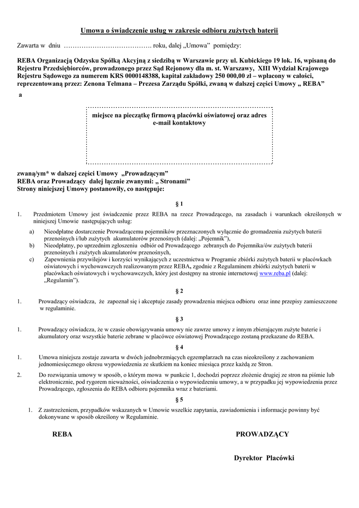 Umowa o świadczenie usług w zakresie odbioru zużytych baterii Zawarta w dniu …………………………………. roku, dalej „Umowa” pomiędzy: REBA Organizacją Odzysku Spółką Akcyjną z siedzibą w Warszawie przy ul. Kubickiego 19 lok. 16, wpisaną do Rejestru Przedsiębiorców, prowadzonego przez Sąd Rejonowy dla m. st. Warszawy, XIII Wydział Krajowego Rejestru Sądowego za numerem KRS 0000148388, kapitał zakładowy 250 000,00 zł – wpłacony w całości, reprezentowaną przez: Zenona Telmana – Prezesa Zarządu Spółki, zwaną w dalszej części Umowy „ REBA” a miejsce na pieczątkę firmową placówki oświatowej oraz adres e-mail kontaktowy zwaną/ym* w dalszej części Umowy „Prowadzącym” REBA oraz Prowadzący dalej łącznie zwanymi: „ Stronami” Strony niniejszej Umowy postanowiły, co następuje: §1 1. Przedmiotem Umowy jest świadczenie przez REBA na rzecz Prowadzącego, na zasadach i warunkach określonych w niniejszej Umowie następujących usług: a) b) c) Nieodpłatne dostarczenie Prowadzącemu pojemników przeznaczonych wyłącznie do gromadzenia zużytych baterii przenośnych i/lub zużytych akumulatorów przenośnych (dalej: „Pojemnik”), Nieodpłatny, po uprzednim zgłoszeniu odbiór od Prowadzącego zebranych do Pojemnika/ów zużytych baterii przenośnych i zużytych akumulatorów przenośnych, Zapewnienia przywilejów i korzyści wynikających z uczestnictwa w Programie zbiórki zużytych baterii w placówkach oświatowych i wychowawczych realizowanym przez REBA, zgodnie z Regulaminem zbiórki zużytych baterii w placówkach oświatowych i wychowawczych, który jest dostępny na stronie internetowej www.reba.pl (dalej: „Regulamin”). §2 1. Prowadzący oświadcza, że zapoznał się i akceptuje zasady prowadzenia miejsca odbioru oraz inne przepisy zamieszczone w regulaminie. §3 1. Prowadzący oświadcza, że w czasie obowiązywania umowy nie zawrze umowy z innym zbierającym zużyte baterie i akumulatory oraz wszystkie baterie zebrane w placówce oświatowej Prowadzącego zostaną przekazane do REBA. §4 1. Umowa niniejsza zostaje zawarta w dwóch jednobrzmiących egzemplarzach na czas nieokreślony z zachowaniem jednomiesięcznego okresu wypowiedzenia ze skutkiem na koniec miesiąca przez każdą ze Stron. 2. Do rozwiązania umowy w sposób, o którym mowa w punkcie 1, dochodzi poprzez złożenie drugiej ze stron na piśmie lub elektronicznie, pod rygorem nieważności, oświadczenia o wypowiedzeniu umowy, a w przypadku jej wypowiedzenia przez Prowadzącego, zgłoszenia do REBA odbioru pojemnika wraz z bateriami. §5 1. Z zastrzeżeniem, przypadków wskazanych w Umowie wszelkie zapytania, zawiadomienia i informacje powinny być dokonywane w sposób określony w Regulaminie. REBA PROWADZĄCY REBA Dyrektor Placówki REBA Dyrektor Placówki