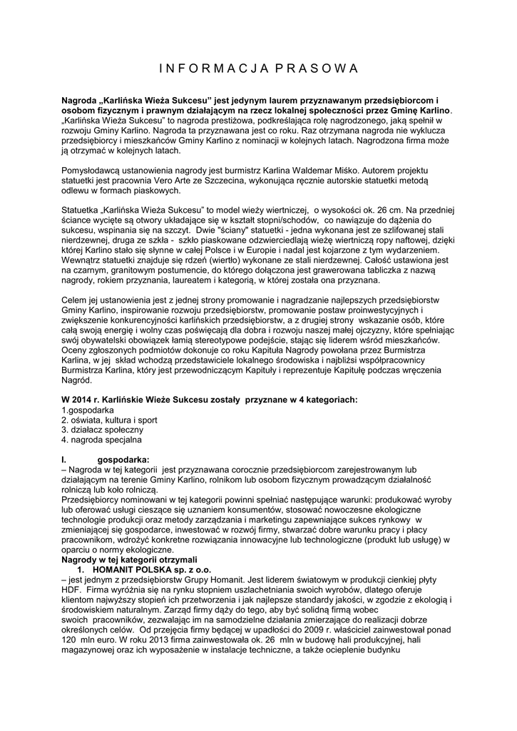 INFORMACJA PRASOWA Nagroda „Karlińska Wieża Sukcesu” jest jedynym laurem przyznawanym przedsiębiorcom i osobom fizycznym i prawnym działającym na rzecz lokalnej społeczności przez Gminę Karlino. „Karlińska Wieża Sukcesu” to nagroda prestiżowa, podkreślająca rolę nagrodzonego, jaką spełnił w rozwoju Gminy Karlino. Nagroda ta przyznawana jest co roku. Raz otrzymana nagroda nie wyklucza przedsiębiorcy i mieszkańców Gminy Karlino z nominacji w kolejnych latach. Nagrodzona firma może ją otrzymać w kolejnych latach. Pomysłodawcą ustanowienia nagrody jest burmistrz Karlina Waldemar Miśko. Autorem projektu statuetki jest pracownia Vero Arte ze Szczecina, wykonująca ręcznie autorskie statuetki metodą odlewu w formach piaskowych. Statuetka „Karlińska Wieża Sukcesu” to model wieży wiertniczej, o wysokości ok. 26 cm. Na przedniej ściance wycięte są otwory układające się w kształt stopni/schodów, co nawiązuje do dążenia do sukcesu, wspinania się na szczyt. Dwie "ściany" statuetki - jedna wykonana jest ze szlifowanej stali nierdzewnej, druga ze szkła - szkło piaskowane odzwierciedlają wieżę wiertniczą ropy naftowej, dzięki której Karlino stało się słynne w całej Polsce i w Europie i nadal jest kojarzone z tym wydarzeniem. Wewnątrz statuetki znajduje się rdzeń (wiertło) wykonane ze stali nierdzewnej. Całość ustawiona jest na czarnym, granitowym postumencie, do którego dołączona jest grawerowana tabliczka z nazwą nagrody, rokiem przyznania, laureatem i kategorią, w której została ona przyznana. Celem jej ustanowienia jest z jednej strony promowanie i nagradzanie najlepszych przedsiębiorstw Gminy Karlino, inspirowanie rozwoju przedsiębiorstw, promowanie postaw proinwestycyjnych i zwiększenie konkurencyjności karlińskich przedsiębiorstw, a z drugiej strony wskazanie osób, które całą swoją energię i wolny czas poświęcają dla dobra i rozwoju naszej małej ojczyzny, które spełniając swój obywatelski obowiązek łamią stereotypowe podejście, stając się liderem wśród mieszkańców. Oceny zgłoszonych podmiotów dokonuje co roku Kapituła Nagrody powołana przez Burmistrza Karlina, w jej skład wchodzą przedstawiciele lokalnego środowiska i najbliżsi współpracownicy Burmistrza Karlina, który jest przewodniczącym Kapituły i reprezentuje Kapitułę podczas wręczenia Nagród. W 2014 r. Karlińskie Wieże Sukcesu zostały przyznane w 4 kategoriach: 1.gospodarka 2. oświata, kultura i sport 3. działacz społeczny 4. nagroda specjalna I. gospodarka: – Nagroda w tej kategorii jest przyznawana corocznie przedsiębiorcom zarejestrowanym lub działającym na terenie Gminy Karlino, rolnikom lub osobom fizycznym prowadzącym działalność rolniczą lub koło rolniczą. Przedsiębiorcy nominowani w tej kategorii powinni spełniać następujące warunki: produkować wyroby lub oferować usługi cieszące się uznaniem konsumentów, stosować nowoczesne ekologiczne technologie produkcji oraz metody zarządzania i marketingu zapewniające sukces rynkowy w zmieniającej się gospodarce, inwestować w rozwój firmy, stwarzać dobre warunku pracy i płacy pracownikom, wdrożyć konkretne rozwiązania innowacyjne lub technologiczne (produkt lub usługę) w oparciu o normy ekologiczne. Nagrody w tej kategorii otrzymali 1. HOMANIT POLSKA sp. z o.o. – jest jednym z przedsiębiorstw Grupy Homanit. Jest liderem światowym w produkcji cienkiej płyty HDF. Firma wyróżnia się na rynku stopniem uszlachetniania swoich wyrobów, dlatego oferuje klientom najwyższy stopień ich przetworzenia i jak najlepsze standardy jakości, w zgodzie z ekologią i środowiskiem naturalnym. Zarząd firmy dąży do tego, aby być solidną firmą wobec swoich pracowników, zezwalając im na samodzielne działania zmierzające do realizacji dobrze określonych celów. Od przejęcia firmy będącej w upadłości do 2009 r. właściciel zainwestował ponad 120 mln euro. W roku 2013 firma zainwestowała ok. 26 mln w budowę hali produkcyjnej, hali magazynowej oraz ich wyposażenie w instalacje techniczne, a także ocieplenie budynku administracyjnego. Firma zakupiła również linię do oklejania płyt i piłę do rozkroju płyt. Zmodernizowana została również kuchnia klejowa MDF i zakupiono dodatkowe obrabiarki do drewna Od 2005r. firma stale zwiększa zatrudnienie. W chwili obecnej jest to ok. 512 osób w trzech firmach, dzięki czemu jest to największy pracodawca w regionie. Rozwój firmy pozytywnie wpływa na pozostałe sfery działalności lokalnej. Firma identyfikuje się z Gminą Karlino, promuje region oraz prowadzi prospołeczną działalność wspierając finansowo działania prowadzone przez Gminę. W 2014 roku firma planuje dalsze inwestycje i zwiększanie zatrudnienia. Przykład firmy Homanit Polska to przykład firmy odpowiedzialnej społecznie, która dobrowolnie uwzględniania w swojej działalności komercyjnej problematykę społeczną i środowiskową. Pan Fritz Homann w 2013 roku zdecydował, iż w kolejnych 8 latach firma przekaże na rzecz Gminy Karlino łącznie 4 mln złotych, tj. 500 tys. rocznie, z przeznaczeniem na dofinansowanie budowy mieszkań komunalnych – 450 tys. i na działalność sportową gminy – 50 tys. zł 2. Gospodarstwo Rolnicze Abbas Krystyna Arabska – Abbas prowadzi wraz z rodziną gospodarstwo rolne w miejscowości Karścino. Powierzchnia gospodarstwa to 580 ha i zwiększa się z roku na rok. Gospodarstwo specjalizuje się w produkcji roślinnej i zwierzęcej. Osiągając bardzo wysokie plony zbóż i wysoką wydajność mleka. Produkty odznaczają się najwyższymi parametrami konsumpcyjnymi. W gospodarstwie od wielu lat stosowane są najnowocześniejsze metody agrotechniczne i nowoczesny, bardzo wysokiej klasy sprzęt rolniczy. Gospodarstwo jest ciągle modernizowane i spełnia wszelkie normy w zakresie wzajemnej zgodności. Stosowany jest kwalifikowany materiał siewny i właściwe 