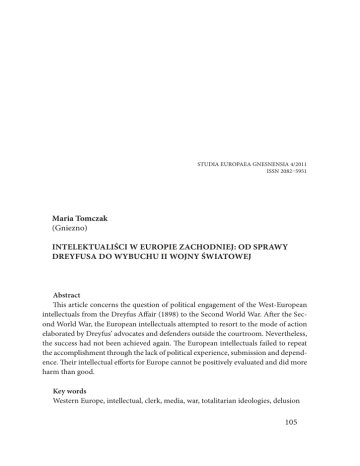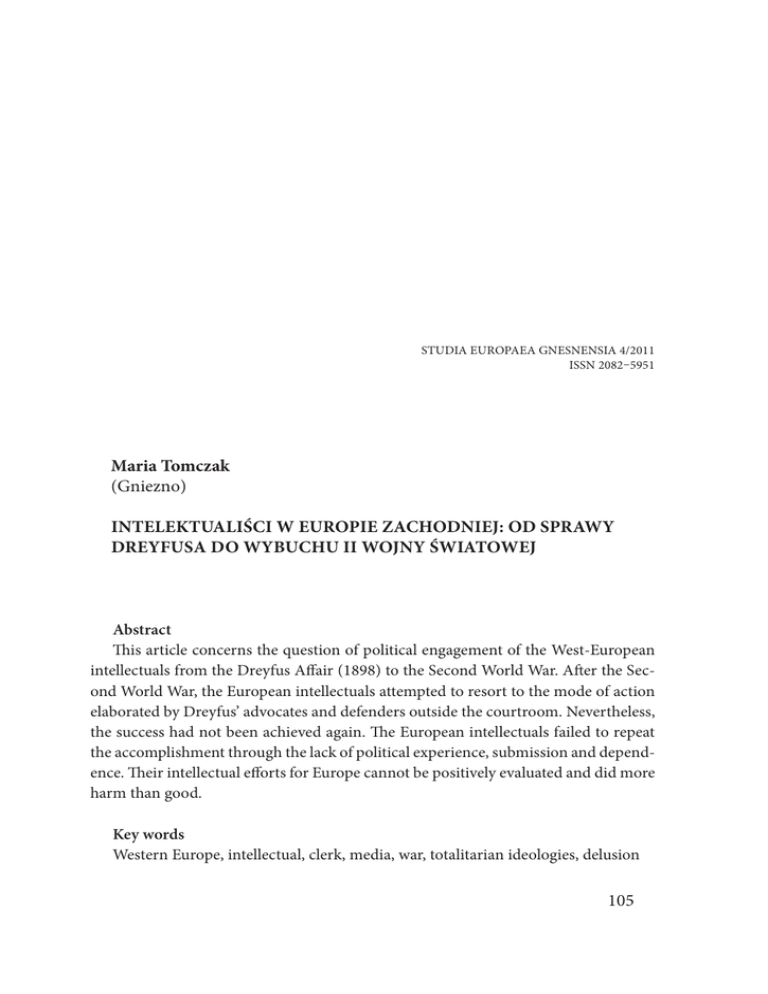 MARIA TOMCZAK, INTELEKTUALIŚCI W EUROPIE ZACHODNIEJ: OD SPRAWY DREYFUSA… STUDIA EUROPAEA GNESNENSIA 4/2011 ISSN 2082–5951 Maria Tomczak (Gniezno) INTELEKTUALIŚCI W EUROPIE ZACHODNIEJ: OD SPRAWY DREYFUSA DO WYBUCHU II WOJNY ŚWIATOWEJ Abstract This article concerns the question of political engagement of the West-European intellectuals from the Dreyfus Affair (1898) to the Second World War. After the Second World War, the European intellectuals attempted to resort to the mode of action elaborated by Dreyfus’ advocates and defenders outside the courtroom. Nevertheless, the success had not been achieved again. The European intellectuals failed to repeat the accomplishment through the lack of political experience, submission and dependence. Their intellectual efforts for Europe cannot be positively evaluated and did more harm than good. Key words Western Europe, intellectual, clerk, media, war, totalitarian ideologies, delusion 105 STUDIA EUROPAEA GNESNENSIA 4/2011 · IDEE O intelektualistach napisano już wiele. Tematem tym zajmowały się całe rzesze naukowców, w tym także najwybitniejsze umysły. Sformułowano setki, jeśli nie tysiące definicji, napisano równie dużo uczonych rozpraw. Mimo to nie zdołano — jak dotąd — ustalić jednoznacznie ani kim właściwie są, ani też jaką pełnią rolę w społeczeństwie. Największe kontrowersje wzbudza ich ocena, pytanie, czy są uzurpatorami, sięgającymi po nienależne im uprawnienia, czy wręcz przeciwnie, stanowią — jak to ujął Ralf Dahrendorf „system immunologiczny wolnych społeczeństw”? Trudności terminologiczne wiążą się z kilkoma czynnikami. Na jeden z nich, który można by określić jako brak obiektywizmu, wskazał Zygmunt Baumann. Wynika on z faktu, że kimkolwiek są intelektualiści, to oni właśnie tworzą te definicje i oni też je kwestionują. Sprawia to, że „każda próba zdefiniowania pojęcia «intelektualista» jest próbą samookreślenia się; każda próba uzgodnienia lub zanegowania statusu intelektualisty jest próbą autodestrukcji. Definiowanie i spory w kwestii definicji są jądrem autoprodukcji i autoreprodukcji”1. Istnieją też inne, bardziej obiektywne przyczyny kłopotów z intelektualistami. Jedną z nich jest zmienność tej specyficznej grupy społecznej. Rola, charakter, a nawet skład społeczny grupy intelektualistów ulegały zmianom, w zależności od warunków, w jakich przychodziło im funkcjonować, od systemu społeczno-politycznego, tradycji, kultury politycznej społeczeństwa itp. Ta swoista mimikra sprawiła przy tym, że nawet w ramach Europy pojęcie to ma wiele znaczeń. Linie podziału przebiegają pomiędzy różnymi kręgami kulturowymi i krajami, a także między zwolennikami różnych kierunków i nurtów politycznych. Celem opracowania jest ukazanie zmieniających się form zaangażowania politycznego europejskich intelektualistów. Jest to też próba udzielenia odpowiedzi na pytanie, jaką rolę odegrali oni w ciągu pierwszych czterech dziesięcioleci XX wieku. Czy, kierując się wzorem francuskich obrońców Dreyfusa, sprostali niełatwym wyzwaniom, czy przeciwnie, dali się bezwolnie ponieść historii? Rzecz jasna ramy artykułu nie pozwalają na analizę dogłębną, ujmującą wszystkie formy działalności i stosunek do wszystkich problemów we wszystkich krajach zachodniej części kontynentu. Jest to jedynie próba ukazania pewnych, najbardziej ogólnych tendencji i najczęstszych zachowań wobec wyzwań 1 Z. Baumann, Miłość wbrew przeciwnościom. Intelektualiści a państwo, Teksty Drugie 4, 1992, s. 7. 106 MARIA TOMCZAK, INTELEKTUALIŚCI W EUROPIE ZACHODNIEJ: OD SPRAWY DREYFUSA… dotyczących całej Europy Zachodniej, na przykładzie wybranych intelektualistów francuskich, niemieckich, angielskich, włoskich, a także polskich. SPRAWA DREYFUSA Słowo intelektualista wywodzi się z łacińskiego intellectualis i znaczy tyle, co umysłowy. Termin ten, w swym obecnym znaczeniu narodził się we Francji, a jego geneza wiąże się z tzw. sprawą Dreyfusa, czyli oskarżeniem wywodzącego się z zamożnej alzackiej rodziny żydowskiej kapitana armii francuskiej Alfreda Dreyfusa o zdradę tajemnic wojskowych. Do dziś nie wiadomo, czy była to zwykła pomyłka sądowa, czy też działanie świadome o charakterze antysemickim. Faktem jest, że niesłusznie aresztowany Dreyfus został skazany na dożywotnią deportację na Wyspy Diabelskie, a kampanię o rewizję procesu rozpoczął znany i dość ostentacyjnie apolityczny pisarz Emil Zola. Napisał list otwarty w obronie Dreyfusa, ujawniający kulisy jego oskarżenia, pod którym podpisy złożyło około 3 tys. osób, wśród nich postacie tak znane jak choćby Anatol France czy Marcel Proust. List został zamieszczony 13 stycznia 1898 r. w piśmie „L’Aurore”, wydawanym przez George’a Clemenceau, pod tytułem „J’Accuse” (Oskarżam) i nazwany został „Manifeste les Intellectuels”2. List piętnował antysemityzm francuskiego dowództwa wojskowego i stronniczość sądu. Także przeciwnicy niesłusznie skazanego Dreyfusa, na których czele stali Maurice Barrès i Édouard Drumont, używali terminu intellectuels, jednak miał on w ich interpretacji całkiem inne, zdecydowanie negatywne znaczenie. W swych enuncjacjach abstrahowali oni od problemu winy czy niewinności Dreyfusa, koncentrując się na rzekomo żydowskim charakterze republiki francuskiej (ulubionym hasłem było republique juive)3. Po długich sporach zwycięzcami zostali zwolennicy Dreyfusa, czyli intelektualiści. W 1899 r. doszło do rewizji procesu i uchylenia wyroku. Wkrótce potem Dreyfus został ułaskawiony przez prezydenta, a w 1906 r. uniewinniony i zrehabilitowany4. 2 H. Harth, Les Intellectuels. Zur Rollendefinition eines modernen Sozialtypus, [w:] J. Stieß (red.), Widerstand, Flucht, Kollaboration. Literarische Intelligenz und politik in Frankreich, Frankfurt a.M. – New York 1984, s. 202.