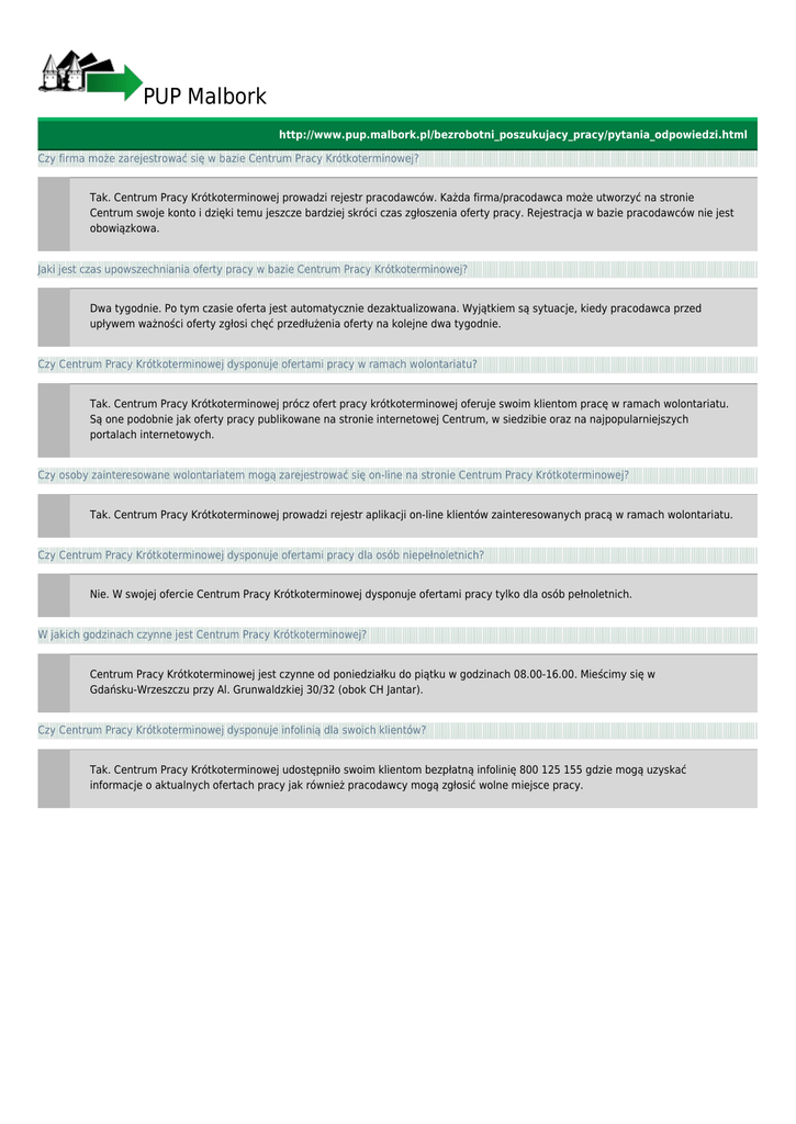 PUP Malbork http://www.pup.malbork.pl/bezrobotni_poszukujacy_pracy/pytania_odpowiedzi.html Czy firma może zarejestrować się w bazie Centrum Pracy Krótkoterminowej? Tak. Centrum Pracy Krótkoterminowej prowadzi rejestr pracodawców. Każda firma/pracodawca może utworzyć na stronie Centrum swoje konto i dzięki temu jeszcze bardziej skróci czas zgłoszenia oferty pracy. Rejestracja w bazie pracodawców nie jest obowiązkowa. Jaki jest czas upowszechniania oferty pracy w bazie Centrum Pracy Krótkoterminowej? Dwa tygodnie. Po tym czasie oferta jest automatycznie dezaktualizowana. Wyjątkiem są sytuacje, kiedy pracodawca przed upływem ważności oferty zgłosi chęć przedłużenia oferty na kolejne dwa tygodnie. Czy Centrum Pracy Krótkoterminowej dysponuje ofertami pracy w ramach wolontariatu? Tak. Centrum Pracy Krótkoterminowej prócz ofert pracy krótkoterminowej oferuje swoim klientom pracę w ramach wolontariatu. Są one podobnie jak oferty pracy publikowane na stronie internetowej Centrum, w siedzibie oraz na najpopularniejszych portalach internetowych. Czy osoby zainteresowane wolontariatem mogą zarejestrować się on-line na stronie Centrum Pracy Krótkoterminowej? Tak. Centrum Pracy Krótkoterminowej prowadzi rejestr aplikacji on-line klientów zainteresowanych pracą w ramach wolontariatu. Czy Centrum Pracy Krótkoterminowej dysponuje ofertami pracy dla osób niepełnoletnich? Nie. W swojej ofercie Centrum Pracy Krótkoterminowej dysponuje ofertami pracy tylko dla osób pełnoletnich. W jakich godzinach czynne jest Centrum Pracy Krótkoterminowej? Centrum Pracy Krótkoterminowej jest czynne od poniedziałku do piątku w godzinach 08.00-16.00. Mieścimy się w Gdańsku-Wrzeszczu przy Al. Grunwaldzkiej 30/32 (obok CH Jantar). Czy Centrum Pracy Krótkoterminowej dysponuje infolinią dla swoich klientów? Tak. Centrum Pracy Krótkoterminowej udostępniło swoim klientom bezpłatną infolinię 800 125 155 gdzie mogą uzyskać informacje o aktualnych ofertach pracy jak również pracodawcy mogą zgłosić wolne miejsce pracy.