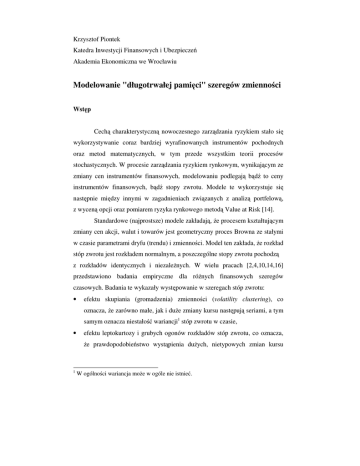 Krzysztof Piontek Katedra Inwestycji Finansowych i Ubezpiecze Akademia Ekonomiczna we Wrocławiu Modelowanie "długotrwałej pami ci" szeregów zmienno ci Wst p Cech charakterystyczn nowoczesnego zarz dzania ryzykiem stało si wykorzystywanie coraz bardziej wyrafinowanych instrumentów pochodnych oraz metod matematycznych, w tym przede wszystkim teorii procesów stochastycznych. W procesie zarz dzania ryzykiem rynkowym, wynikaj cym ze zmiany cen instrumentów finansowych, modelowaniu podlegaj b d to ceny instrumentów finansowych, b d stopy zwrotu. Modele te wykorzystuje si nast pnie mi dzy innymi w zagadnieniach zwi zanych z analiz portfelow , z wycen opcji oraz pomiarem ryzyka rynkowego metod Value at Risk [14]. Standardowe (najprostsze) modele zakładaj , e procesem kształtuj cym zmiany cen akcji, walut i towarów jest geometryczny proces Browna ze stałymi w czasie parametrami dryfu (trendu) i zmienno ci. Model ten zakłada, e rozkład stóp zwrotu jest rozkładem normalnym, a poszczególne stopy zwrotu pochodz z rozkładów identycznych i niezale nych. W wielu pracach [2,4,10,14,16] przedstawiono badania empiryczne dla ró nych finansowych szeregów czasowych. Badania te wykazały wyst powanie w szeregach stóp zwrotu: • efektu skupiania (gromadzenia) zmienno ci (volatility clustering), co oznacza, e zarówno małe, jak i du e zmiany kursu nast puj seriami, a tym samym oznacza niestało • wariancji1 stóp zwrotu w czasie, efektu leptokurtozy i grubych ogonów rozkładów stóp zwrotu, co oznacza, e prawdopodobie stwo wyst pienia du ych, nietypowych zmian kursu 1 W ogólno ci wariancja mo e w ogóle nie istnie . (du e co do warto ci bezwzgl dnej stopy zwrotu) jest wi ksze ni gdyby stopy zwrotu pochodziły z rozkładu normalnego, • efektu sko no ci rozkładów stóp zwrotu (najcz ciej obserwuje si rozkłady prawostronnie sko ne, lecz nie jest to reguł ), • efektu autokorelacji stóp zwrotu, szczególnie w okresach o małej zmienno ci, • "efektu d wigni" - efektu ujemnego skorelowania poziomu kursów i poziomu zmienno ci stóp zwrotu, czyli asymetrycznego wpływu informacji pozytywnych i negatywnych na poziom przyszłej wariancji, • efektu "długotrwałej pami ci" w szeregach zmienno ci (wariancji), czyli istotnie znacz cych współczynników wysokich rz dów autokorelacji kwadratów stóp zwrotu. Rysunki 1-4 prezentuj niektóre opisywane własno ci na podstawie szeregu dziennych, prostych stóp zwrotu z indeksu WIG z okresu od 03-10-1994 (dzie wprowadzenie pi ciosesyjnego tygodnia na GPW w Warszawie) do 19-03-2003. Niezb dne skomplikowanych ni stało si wi c poszukiwanie modeli bardziej model geometrycznego ruchu Browna, które lepiej opisywałyby własno ci szeregów stóp zwrotu (uwzgl dniałyby przynajmniej niektóre z wymienionych powy ej efektów). Najwi ksz popularno zyskały w tym obszarze modele z warunkow warto ci oczekiwan procesu opisywan przez modele z klasy ARMA [4,14] oraz z warunkow wariancj opisywan przez modele z klasy ARCH [10]. Rozwa a si równie modele z ró nymi postaciami rozkładów g sto ci reszt modelu [14]. Wszystkie modele klasy ARCH umo liwiaj opis grubych ogonów oraz efektu skupiania zmienno ci [2,10]. Stosunkowo szeroko znane s równie modele opisuj ce asymetryczn reakcj na pojawianie si informacji dobrych i złych, umo liwiaj ce modelowanie efektu "d wigni" (GJR-GARCH, EGARCH, TARCH) [14,16]. Najmniej znane s nadal modele opisuj ce "długotrwał pami " (istotne autokorelacje wysokich rz dów kwadratów stóp zwrotu) w szeregach zmienno ci. Najpopularniejszy taki model (FIGARCH) stanie si obiektem analizy w niniejszej pracy. Rys. 1. przedstawia efekt gromadzenia Rys. 2. przedstawia efekt grubych zmienno ci dla indeksu WIG ogonów rozkładu stóp zwrotu indeksu WIG Rys. 3. przedstawia autokorelacj stóp Rys. 4. przedstawia autokorelacj zwrotu dla indeksu WIG kwadratów stóp zwrotu dla indeksu WIG ródło - obliczenia własne. Rozpatrywany w dalszej cz ci pracy model w czasie dyskretnym opisuj cy szereg czasowy prostych stóp zwrotu dany jest równaniem [14]: rt = X t − X t −1 = µt + ε t = µt + ht zt , X t −1 (1) gdzie: X t - cena w chwili t, µt - warunkowa warto oczekiwana stopy zwrotu w chwili t, ht - warunkowa wariancja stopy zwrotu w chwili t, zt - niezale ne reszty modelu o zerowej redniej i jednostkowej wariancji. W dalszej cz ci pracy przyjmuje si najprostsze i najbardziej popularne rozwi zanie, e bł d modelu zt ma rozkład normalny. Mo liwe jest oczywi cie zastosowanie rozkładów o grubszych ogonach [14]. W pracach [14] i [15] udowodniono wyst powanie istotnej autokorelacji rz du pierwszego w szeregu stóp zwrotu z indeksu WIG. Efekt ten opisuje si najcz ciej poprzez zastosowanie modeli autoregresyjnych. W tym przypadku wystarczaj ce okazuje si wybranie modelu autoregresji rz du pierwszego - AR(1), co skutkuje przyj ciem modelu: µt = µ + ϕ rt −1 . Udowodniono równie (2) wyst powanie w szeregu stóp zwrotu efektu heteroskedastyczno ci, a dokładniej efektu ARCH [14,15]. Na tym poziomie rozwa a pomini to opis "efektu d wigni". Mo liwe rozwi zania wraz z wynikami bada empirycznych odno nie indeksu WIG znale mo na w pracy [14]. Podstawowe rozwi zania w zakresie modelowanie efektu gromadzenia zmienno ci i "długotrwałej pami ci" szeregu zmienno ci przedstawiono w dalszej cz ci pracy. Wcze niej niezb dnym jest zdefiniowanie poj cia "pami ci modelu". Pami modelu Samo poj cie "pami ci modelu" nie jest jednoznaczne, szczególnie w odniesieniu do modeli warunkowej wariancji. Poj cia "pami modelu" u ywa si b d to kontek cie funkcji autokorelacji kwadratów reszt modelu ( ε t2 ), b d w kontek cie wpływu zaburzenia z chwili t na prognozy warunkowej wariancji w chwilach kolejnych [3,6,8,9,16]. Podej cia te bywaj rozbie ne i model o "krótkotrwałej pami ci" w stosunku do autokorelacji kwadratów reszt modelu mo e by modelem o "długotrwałej", a wr cz niesko czonej "pami ci" w kontek cie wpływu zaburzenia na prognoz dowolno o