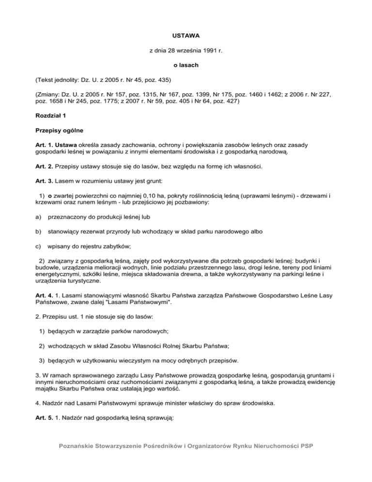 USTAWA z dnia 28 września 1991 r. o lasach (Tekst jednolity: Dz. U. z 2005 r. Nr 45, poz. 435) (Zmiany: Dz. U. z 2005 r. Nr 157, poz. 1315, Nr 167, poz. 1399, Nr 175, poz. 1460 i 1462; z 2006 r. Nr 227, poz. 1658 i Nr 245, poz. 1775; z 2007 r. Nr 59, poz. 405 i Nr 64, poz. 427) Rozdział 1 Przepisy ogólne Art. 1. Ustawa określa zasady zachowania, ochrony i powiększania zasobów leśnych oraz zasady gospodarki leśnej w powiązaniu z innymi elementami środowiska i z gospodarką narodową. Art. 2. Przepisy ustawy stosuje się do lasów, bez względu na formę ich własności. Art. 3. Lasem w rozumieniu ustawy jest grunt: 1) o zwartej powierzchni co najmniej 0,10 ha, pokryty roślinnością leśną (uprawami leśnymi) - drzewami i krzewami oraz runem leśnym - lub przejściowo jej pozbawiony: a) przeznaczony do produkcji leśnej lub b) stanowiący rezerwat przyrody lub wchodzący w skład parku narodowego albo c) wpisany do rejestru zabytków; 2) związany z gospodarką leśną, zajęty pod wykorzystywane dla potrzeb gospodarki leśnej: budynki i budowle, urządzenia melioracji wodnych, linie podziału przestrzennego lasu, drogi leśne, tereny pod liniami energetycznymi, szkółki leśne, miejsca składowania drewna, a także wykorzystywany na parkingi leśne i urządzenia turystyczne. Art. 4. 1. Lasami stanowiącymi własność Skarbu Państwa zarządza Państwowe Gospodarstwo Leśne Lasy Państwowe, zwane dalej "Lasami Państwowymi". 2. Przepisu ust. 1 nie stosuje się do lasów: 1) będących w zarządzie parków narodowych; 2) wchodzących w skład Zasobu Własności Rolnej Skarbu Państwa; 3) będących w użytkowaniu wieczystym na mocy odrębnych przepisów. 3. W ramach sprawowanego zarządu Lasy Państwowe prowadzą gospodarkę leśną, gospodarują gruntami i innymi nieruchomościami oraz ruchomościami związanymi z gospodarką leśną, a także prowadzą ewidencję majątku Skarbu Państwa oraz ustalają jego wartość. 4. Nadzór nad Lasami Państwowymi sprawuje minister właściwy do spraw środowiska. Art. 5. 1. Nadzór nad gospodarką leśną sprawują: Poznańskie Stowarzyszenie Pośredników i Organizatorów Rynku Nieruchomości PSP 1) minister właściwy do spraw środowiska - w lasach stanowiących własność Skarbu Państwa; 2) (1) starosta - w lasach niestanowiących własności Skarbu Państwa. 1a. (uchylony). 2. (2) W przypadku lasu, który obejmuje obszar więcej niż jednego powiatu, właściwy miejscowo jest starosta powiatu, na którego terenie znajduje się większa część tego lasu. Starosta ten może powierzyć, w drodze porozumienia, prowadzenie w jego imieniu spraw z zakresu nadzoru, o którym mowa w ust. 1 pkt 2, w tym wydawanie decyzji administracyjnych w pierwszej instancji, dyrektorowi regionalnej dyrekcji Lasów Państwowych. 3. (3) W przypadku lasów, które znajdują się na terenie powiatu, starosta może powierzyć, w drodze porozumienia, prowadzenie w jego imieniu spraw z zakresu nadzoru, o którym mowa w ust. 1 pkt 2, w tym wydawanie decyzji administracyjnych w pierwszej instancji, nadleśniczemu Lasów Państwowych, zwanemu dalej "nadleśniczym". 3a. W przypadku powierzenia zadania, o którym mowa w ust. 1 pkt 2, starosta przekazuje środki na realizację tego zadania. 4. (4) Dyrektor regionalnej dyrekcji Lasów Państwowych i nadleśniczy prowadzą powierzone przez starostę sprawy, o których mowa w ust. 2 i 3, po zapewnieniu przez powierzającego środków finansowych na te cele. 5. (5) Zadania starosty, o których mowa w art. 13 ust. 3 pkt 2, art. 16 ust. 1a, art. 22 ust. 2 i art. 38a ust. 2, są zadaniami z zakresu administracji rządowej. Art. 5a. Minister właściwy do spraw środowiska może powierzyć, w drodze decyzji administracyjnej, dyrektorowi regionalnej dyrekcji Lasów Państwowych wykonywanie zadań poza terenami jego działania w zakresie związanym z funkcjonowaniem i ochroną obszarów Natura 2000. Art. 6. 1. Użyte w ustawie określenia oznaczają: 1) gospodarka leśna - działalność leśną w zakresie urządzania, ochrony i zagospodarowania lasu, utrzymania i powiększania zasobów i upraw leśnych, gospodarowania zwierzyną, pozyskiwania - z wyjątkiem skupu - drewna, żywicy, choinek, karpiny, kory, igliwia, zwierzyny oraz płodów runa leśnego, a także sprzedaż tych produktów oraz realizację pozaprodukcyjnych funkcji lasu; 1a) trwale zrównoważona gospodarka leśna - działalność zmierzającą do ukształtowania struktury lasów i ich wykorzystania w sposób i tempie zapewniającym trwałe zachowanie ich bogactwa biologicznego, wysokiej produkcyjności oraz potencjału regeneracyjnego, żywotności i zdolności do wypełniania, teraz i w przyszłości, wszystkich ważnych ochronnych, gospodarczych i socjalnych funkcji na poziomie lokalnym, narodowym i globalnym, bez szkody dla innych ekosystemów; 2) klasa bonitacji drzewostanu - wskaźnik możliwości produkcyjnej siedliska leśnego i drzewostanu; 3) właściciel lasu - osobę fizyczną lub prawną będącą właścicielem albo użytkownikiem wieczystym lasu oraz osobę fizyczną, osobę prawną lub jednostkę organizacyjną nieposiadającą osobowości prawnej będącą posiadaczem samoistnym, użytkownikiem, zarządcą lub dzierżawcą lasu; 4) zagrożenie trwałości - stan lasu wywołany czynnikami zewnętrznymi lub nieprawidłową gospodarką leśną, wymagający zabiegów zwalczających i ochronnych albo jego przebudowy; 5) (uchylony); 6) plan urządzenia lasu - podstawowy dokument gospodarki leśnej opracowywany dla określonego obiektu, zawierający opis i ocenę stanu lasu oraz cele, zadania i sposoby prowadzenia gospodarki leśnej; Poznańskie Stowarzyszenie Pośredników i Organizatorów Rynku Nieruchomości PSP 7) uproszczony plan urządzenia lasu - plan opracowywany dla lasu o obszarze co najmniej 10 ha, stanowiącego zwarty kompleks leśny, zawierający skrócony opis lasu i gruntów przeznaczonych do zalesienia oraz podstawowe zadania dotyc