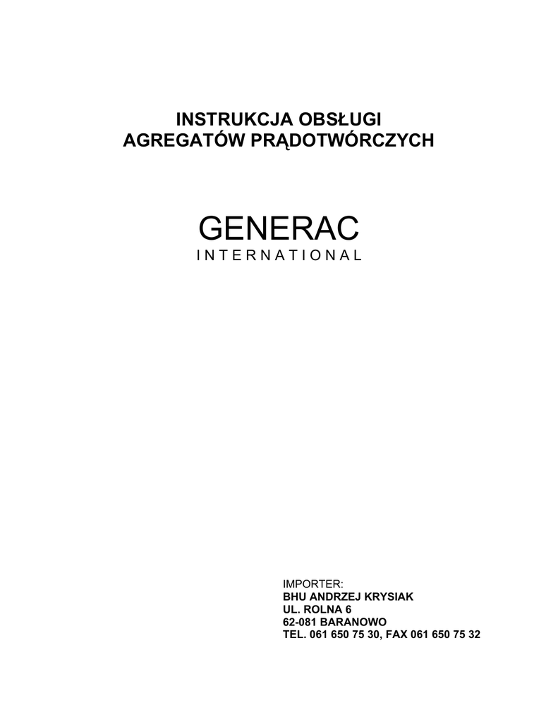 INSTRUKCJA OBSŁUGI AGREGATÓW PRĄDOTWÓRCZYCH GENERAC INTERNATIONAL IMPORTER: BHU ANDRZEJ KRYSIAK UL. ROLNA 6 62-081 BARANOWO TEL. 061 650 75 30, FAX 061 650 75 32 WYPOSAŻENIE I ZASTOSOWANIE W agregatach prądotwórczych GENERAC silnik spalinowy napędza generator prądu zmiennego. Wartość znamionowa obrotów wynosi 3000 obrotów na minutę. Generatory zaprojektowane są do zasilania odbiorników elektrycznych prądu zmiennego o częstotliwości 50 Hz. Najczęściej generatory są wyposażone w gniazda jednofazowe, ale w ofercie firmy GENERAC znajdują się generatory przystosowane do zasilania trójfazowych urządzeń elektrycznych, czy zasilania urządzeń zasilanych stałym napięciem 12V (Patrz. Tabela danych technicznych). UWAGA! NIE WOLNO PRZEKRACZAĆ MOCY WYJŚCIOWEJ GENERATORA OBCIĄŻAJĄC AGREGAT URZĄDZENIAMI ELEKTRYCZNYMI O ZBYT DUŻEJ MOCY ZNAMIONOWEJ. W TAKIM WYPADKU MOŻE DOJŚĆ DO USZKODZENIA GENERATORA LUB ZASILANYCH URZĄDZEŃ. W PRZYPADKU WIĘKSZEJ ILOŚCI GNIAZD PRZY AGREGACIE I JEDNOCZESNYM ZASILANIU KILKU URZĄDZEŃ NALEŻY ZSUMOWAĆ MOC ZNAMIONOWĄ ODBIORNIKÓW. ŁĄCZNA MOC NIE MOŻE PRZEKROCZYĆ MOCY ZNAMIONOWEJ OBCIĄŻENIOWEJ GENERATORA. UWAGA! SILNIKI NAPĘDZAJĄCE AGREGAT MAJĄ USTALONĄ PRĘDKOŚĆ OBROTOWĄ, KTÓREJ NIE WOLNO ZMIENIAĆ. ZMIANA USTALONEJ PRĘDKOŚCI MOŻE DOPROWADZIĆ DO USZKODZENIA AGREGATU, URZĄDZEŃ NAPĘDZANYCH I SAMEGO SILNIKA. Należy również pamiętać, że niektóre urządzenia elektryczne pobierają przy rozruchu tzw. prąd udarowy, tzn. że do rozruchu wymagana jest większa moc niż podana na tabliczce znamionowej odbiornika. Dotyczy to np. silników elektrycznych, czy urzadzeń napędzanych silnikami elektrycznymi; w przypadku np. pomp czy sprężarek wymagana moc to nawet od 3 do 5 razy więcej niż podano na tabliczce znamionowej. Dobierając agregat do zasilania takich urządzeń należy przyjmować taki zapas mocy potrzebny do ich uruchomienia. Odpowiedni zapas mocy dotyczy również lamp rtęciowych, sodowych i fluoroscencyjnych wymagają do 2 x więcej mocy do rozruchu. Narzędzia elektryczne do 3 razy więcej mocy. UWAGA! Jeżeli urządzenie napędzane silnikiem elektrycznym nie osiąga pełnych obrotów w ciągu kilku sekund po włączeniu należy je wyłączyć dla uniknięcia uszkodzenia. Należy pamiętać, że podczas eksploatacji agregatu w warunkach podwyższonej temperatury spada moc wyjściowa generatora: - Przy każdym wzroście temperatury otoczenia o 5°C ponad 40°C moc wyjściowa spada o ok. 3%. Podobne obniżenie mocy wyjściowej generatora dotyczy pracy na dużych wysokościach: - Przy każdym wzroście wysokości o 500 m ponad 1000m moc generatora zmniejsza się ok. 3%. Przy zastosowaniu przedłużaczy do zasilania odbiorników należy pamiętać, że długi przedłużacz jest powodem obniżenia napięcia zasilającego odbiornik. Na każdym odcinku przedłużacza następuje spadek napięcia tym większy im dłuższy i cieńszy jest przedłużacz. Rezultatem zasilania zbyt niskim napięciem jest nieprawidłowa praca zasilanego urządzenia prowadząca do przegrzania, a nawet uszkodzenia odbiornika ze względu na wymuszenie przepływu prądu wyższej wartości. UWAGA! NALEŻY PAMIĘTAĆ, ŻE GENERATOR NIE POWINIEN PRACOWAĆ BEZ OBCIĄŻENIA. PO WŁĄCZENIU AGREGATU I USTABILIZOWANIU OBROTÓW NALEŻY NIEZWŁOCZNIE PODŁĄCZYĆ ODBIORNIKI, KTÓRYCH MINIMALNA MOC POWINNA WYNOSIĆ OD 5 DO 10% MOCY OBCIĄŻENIOWEJ GENERATORA. UŻYWANIE GENERATORA ASYNCHRONICZNEGO BEZ OBCIĄŻENIA POWODUJE USZKODZENIA KONDENSATORA Tabela 1. Minimalne przekroje przedłużaczy Napięcie (V) 230V Prąd znamionowy (A) 2 4 6 8 10 15 20 25 30 Długość przedłużacza (m) 0-30 30-60 Przekrój poprzeczny przewodu w mm kw. 0,75 1,5 1,5 2,5 1,5 4 2,5 4 2,5 6 4 10 6 10 6 16 10 16 PRZEPISY BEZPIECZEŃSTWA PRZED URUCHOMIENIEM ZAPOZNAĆ SIĘ Z INSTRUKCJĄ AGREGATU ORAZ Z ZAŁĄCZONĄ INSTRUKCJĄ OBSŁUGI SILNIKA NAPĘDZAJĄCEGO. NALEŻY STOSOWAĆ SIĘ DO ZAWARTYCH W OBU INSTRUKCJACH ZALECEŃ I OSTRZEŻEŃ. UWAGA! Nieprawidłowa obsługa czy konserwacja może spowodować zagrożenie życia obsługującego lub doprowadzić do uszkodzenia agregatu lub urządzenia zasilanego, nie podlegającego gwarancji. 1. Nie należy uruchamiać agregatu w pomieszczeniach: gazy spalinowe zawierają tlenek węgla, są toksyczne, mogą doprowadzić do zatrucia, a nawet śmierci. 2. Nie wolno uruchamiać generatora w pobliżu materiałów łatwopalnych, np. paliwa, farb, których opary moga być przyczyną wybuchu. 3. Zwracaj uwagę na nalepki ostrzegawcze na generatorze, nie dotykaj go podczas pracy mokrymi rękoma ze względu na możliwość porażenia, zwracaj uwagę na elementy nagrzewające się podczas pracy np. tłumik czy korpus cylindra, nie dotykaj ich ze względu na niebezpieczeństwo poparzenia. 4. Należy pamiętać, że obsługujący jest odpowiedzialny za ewentualne szkody wyrządzone osobom trzecim. Szczególną uwagę należy zwracać na dzieci lub zwierzęta, które mogłyby się znaleźć w pobliżu pracującego agregatu. 5. Nie wolno przykrywać ani osłaniać generatora w czasie pracy lub krótko po wyłączeniu, kiedy jest nagrzany. 6. Nie używaj generatora podczas deszczu lub w warunkach nadmiernej wilgotności. 7. Nie wolno uruchamiać generatora stojacego w wodzie lub na śniegu. 8. Stosuj tylko sprawne, nieuszkodzone przewody elektryczne - nie wolno układać przewodów pod agregatem, ani układać ich na agregacie. Niezastosowanie się do tych zaleceń może doprowadzić do porażenia lub do uszkodzenia urządzenia. 9. Nie wolno podłączać generatora do instalacji elektrycznych zasilanych z innego źródła. Może to doprowadzić do porażenia prądem obsługującego lub innych osób. Z tego względu nie podłączaj pod żadnym pozorem agregatu do instalacji domowej. 10. Generator ustawiaj w odległości minimum 1 m od konstrukcji stalowych czy innych urządzeń. 11. Generatora nie należy przechylać nawet podczas transportu,