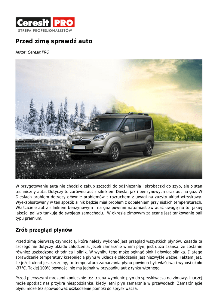 Przed zimą sprawdź auto Autor: Ceresit PRO W przygotowaniu auta nie chodzi o zakup szczotki do odśnieżania i skrobaczki do szyb, ale o stan techniczny auta. Dotyczy to zarówno aut z silnikiem Diesla, jak i benzynowych oraz aut na gaz. W Dieslach problem dotyczy głównie problemów z rozruchem z uwagi na zużyty układ wtryskowy. Wyeksploatowany w ten sposób silnik będzie miał problem z odpaleniem przy niskich temperaturach. Właściciele aut z silnikiem benzynowym i na gaz powinni natomiast zwracać uwagę na to, jakiej jakości paliwo tankują do swojego samochodu. W okresie zimowym zalecane jest tankowanie pali typu premium. Zrób przegląd płynów Przed zimą pierwszą czynnością, która należy wykonać jest przegląd wszystkich płynów. Zasada ta szczególnie dotyczy układu chłodzenia. Jeżeli zamarznie w nim płyn, jest duża szansa, że zostanie również uszkodzona chłodnica i silnik. W wyniku tego może pęknąć blok i głowica silnika. Dlatego sprawdzenie temperatury krzepnięcia płynu w układzie chłodzenia jest niezwykle ważne. Faktem jest, że jeżeli układ jest szczelny, to temperatura zamarzania płynu powinna być właściwa i wynosi około -37°C. Takiej 100% pewności nie ma jednak w przypadku aut z rynku wtórnego. Przed pierwszymi mrozami koniecznie tez trzeba wymienić płyn do spryskiwacza na zimowy. Inaczej może spotkać nas przykra niespodzianka, kiedy letni płyn zamarznie w przewodach. Zamarźnięcie płynu może tez spowodować uszkodzenie pompki do spryskiwacza. Wymień opony Każdego roku, po pierwszych opadach śniegu, mówi się, że zima znowu zaskoczyła kierowców, którzy nie wymienili opon na zimowe. Niestety mimo corocznych alarmów na ten temat, wielu kierowców na czas nie wymienia opon. A przecież opony zimowe zapewniają większą przyczepność na drodze, a tym samym większe bezpieczeństwo. Prze wymianą opon sprawdź czy po poprzednim sezonie opony nadają się jeszcze do użytku i czy maja odpowiednio głęboki bieżnik. Powinien mieć głębokość minimum 4 mm. Sprawdź akumulator Kolejna czynnością do wykonania jest sprawdzenie stanu akumulatora i napięcia ładowania. Warto skorzystać z usług specjalisty od elektryki samochodowej i wykonać u niego pomiar tych parametrów. Badanie pozwala ocenić sprawność instalacji pod obciążeniem. Pozwoli też przewidzieć, czy instalacja zadziała też podczas dużych mrozów. Za rozładowujący się akumulator winę ponosi układ ładowania. Łatwo zmierzyć ten parametr samodzielnie, mierząc napięcie na zaciskach akumulatora podczas pracy silnika. Przy napięciu niższym niż 13,7 V lub wyższym niż 14,5 V, z dużą dozą prawdopodobieństwa, naprawy wymaga alternator. Kup odmrażacz Jeśli nie zostawiasz samochodu w garażu, to licz się z tym , że po nocy pod chmurką twój samochód będzie wymagał odśnieżania lub skrobania szyb. O tym wie każdy kierowca, okazuje się jednak, że wielu z nich nie ma nawet szczotki, którą szybko odśnieży auto. Dlatego przed sezonem mrozów warto zaopatrzyć się w takie akcesoria, jak zmiotka, skrobaczka i odmrażacz do szyb oraz preparat do odmrażania zamków. Nie można stosować za to preparatów takich jak na przykład WD40 do smarowania uszczelek w drzwiach i zamkach. Efekt będzie dokładnie odwrotny od zamierzonego. Bardziej zapobiegliwi kierowcy mogą też zaopatrzyć się w przewody zapłonowe, linkę holowniczą i trapy do podkładania pod kola ułatwiające wyjazd ze śniegu. Zadbaj o nadwozie Podczas zimy do odśnieżania na drogach stosuje się preparaty chemiczne, które niszczą nadwozie. Przed zimą zabezpiecz miejsca, w których może pojawić się rdza, czyli wszelkie odpryski i rysy na lakierze. Zabezpieczane miejsca musza być dokładnie osuszone i ogrzane. Dobrze też jeśli dokładnie umyjesz i nawoskujesz auto, co zabezpieczy auto przed działaniem szkodliwych odczynników chemicznych. Woskowanie spowoduje też, że samochód dłużej pozostanie czysty. Uszczelki przy drzwiach można zabezpieczyć specjalnymi preparatami na bazie silikonu. Dzieki temu drzwi nie będą tak łatwo przymarzać do uszczelek. Zapraszamy na strony: https://profiauto.pl/ https://profiauto.pl/blog/ oraz https://www.facebook.com/profiauto © 2013 Henkel Polska sp. z o.o.