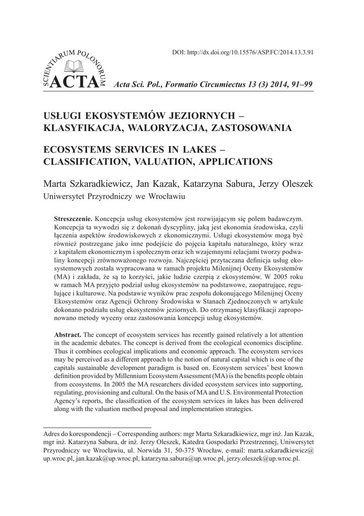 DOI: http://dx.doi.org/10.15576/ASP.FC/2014.13.3.91 Acta Sci. Pol., Formatio Circumiectus 13 (3) 2014, 91–99 USŁUGI EKOSYSTEMÓW JEZIORNYCH – KLASYFIKACJA, WALORYZACJA, ZASTOSOWANIA ECOSYSTEMS SERVICES IN LAKES – CLASSIFICATION, VALUATION, APPLICATIONS Marta Szkaradkiewicz, Jan Kazak, Katarzyna Sabura, Jerzy Oleszek Uniwersytet Przyrodniczy we Wrocławiu Streszczenie. Koncepcja usług ekosystemów jest rozwijającym się polem badawczym. Koncepcja ta wywodzi się z dokonań dyscypliny, jaką jest ekonomia środowiska, czyli łączenia aspektów środowiskowych z ekonomicznymi. Usługi ekosystemów mogą być również postrzegane jako inne podejście do pojęcia kapitału naturalnego, który wraz z kapitałem ekonomicznym i społecznym oraz ich wzajemnymi relacjami tworzy podwaliny koncepcji zrównoważonego rozwoju. Najczęściej przytaczana definicja usług ekosystemowych została wypracowana w ramach projektu Milenijnej Oceny Ekosystemów (MA) i zakłada, że są to korzyści, jakie ludzie czerpią z ekosystemów. W 2005 roku w ramach MA przyjęto podział usług ekosystemów na podstawowe, zaopatrujące, regulujące i kulturowe. Na podstawie wyników prac zespołu dokonującego Milenijnej Oceny Ekosystemów oraz Agencji Ochrony Środowiska w Stanach Zjednoczonych w artykule dokonano podziału usług ekosystemów jeziornych. Do otrzymanej klasyfikacji zaproponowano metody wyceny oraz zastosowania koncepcji usług ekosystemów. Abstract. The concept of ecosystem services has recently gained relatively a lot attention in the academic debates. The concept is derived from the ecological economics discipline. Thus it combines ecological implications and economic approach. The ecosystem services may be perceived as a different approach to the notion of natural capital which is one of the capitals sustainable development paradigm is based on. Ecosystem services’ best known definition provided by Millennium Ecosystem Assessment (MA) is the benefits people obtain from ecosystems. In 2005 the MA researchers divided ecosystem services into supporting, regulating, provisioning and cultural. On the basis of MA and U.S. Environmental Protection Agency’s reports, the classification of the ecosystem services in lakes has been delivered along with the valuation method proposal and implementation strategies. Adres do korespondencji – Corresponding authors: mgr Marta Szkaradkiewicz, mgr inż. Jan Kazak, mgr inż. Katarzyna Sabura, dr inż. Jerzy Oleszek, Katedra Gospodarki Przestrzennej, Uniwersytet Przyrodniczy we Wrocławiu, ul. Norwida 31, 50-375 Wrocław, e-mail: marta.szkaradkiewicz@ up.wroc.pl, [email protected], [email protected], [email protected]. 92 M. Szkaradkiewicz, J. Kazak, K. Sabura, J. Oleszek Słowa kluczowe: usługi ekosystemów, ekosystemy słodkowodne, wycena usług ekosystemów Key words: ecosystem services, freshwater ecosystem, ecosystem services valuation WSTĘP Działalność gospodarcza człowieka jest dodatnio skorelowana z dewastacją środowiska naturalnego oraz zmniejszaniem się bioróżnorodności. Od czasów największego skoku cywilizacyjnego w sferze przemysłowej notuje się największe zubożenie przyrodnicze na Ziemi. Jednocześnie należy wspomnieć, że wraz z rozwojem przemysłowym wzrastała jakość życia człowieka. Wspomniane trzy aspekty: społeczny, ekonomiczny i przyrodniczy, są podstawowymi elementami koncepcji zrównoważonego rozwoju, która zakłada, iż dalszy rozwój jest możliwy tylko przy równoważeniu wymienionych aspektów, bo jedynie wtedy da się zachować możliwość zaspokajania potrzeb przyszłych pokoleń [Rogall 2010]. W opracowaniach różnych autorów [Costanza i Daly 1992] można znaleźć odniesienia do rozumienia wymienionych elementów jako kapitałów w znaczeniu pieniężnym i niepieniężnym. Kapitał naturalny to całość zasobów naturalnych wraz z procesami przyrodniczymi zachodzącymi w ich obrębie. Waluacja środowiska naturalnego ma na celu podniesienie świadomości człowieka co do stanu zasobów przyrodniczych i ich ochrony. Jest to istotne ze względu na fakt, iż na postawę człowieka obecnie najsilniej wpływają argumenty ekonomiczne [Mizgajski 2010]. Ponadto kondycja wód słodkich stanowi szczególnie ważny aspekt w kontekście ekosystemów Polski. W artykule przedstawiono koncepcję usług ekosystemowych ze szczególnym uwzględnieniem usług ekosystemów jeziornych. Celem artykułu jest dokonanie klasyfikacji i analizy możliwości waloryzacji ekonomicznej wybranych usług ekosystemów jeziornych. USŁUGI EKOSYSTEMÓW Termin ecosystem services [Braat i de Groot 2012] jest w Polsce tłumaczony różnorako: świadczenia ekosystemów [Mizgajski 2010], usługi ekosystemów [Żylicz 2010] czy usługi ekosystemowe. W niniejszej pracy zdecydowano się na stosowanie określenia usługi ekosystemów ze względu na to, iż najlepiej oddaje ono aspekt ekonomiczny usług ekosystemowych. Koncepcja usług ekosystemów rozwinęła się wraz ze zwiększeniem znaczenia aspektu ekonomicznego w zarządzaniu środowiskiem. Koncepcja ta zakłada nowe spojrzenie na procesy i produkty przyrodnicze. W największym opracowaniu systematyzującym osiągnięcia w tej dziedzinie, jakim jest Millenium Ecosystem Assessment, usługi ekosystemów rozumiane są jako korzyści jakie czerpie człowiek z występowania określonych procesów przyrodniczych [MA 2005]. W świetle tej definicji można wnioskować za Farleyem [2012], że usługi ekosystemów to pośrednie lub bezpośrednie przyczynianie się środowiska naturalnego do podnoszenia jakości życia człowieka. Pośrednim celem zastosowania tej koncepcji jest to, że pozwala ona w lepszy sposób uzmysłowić społeczeństwu wartość usług ekosystemów, a przez to przyczynić się do podnoszenia Acta Sci. Pol. Formatio Circumiectus 13 (3) 2014 Źródło: Kronenberg 2012, na podstawie MA 2005, s. 50 Source: Kronenberg 2012, based on MA 2005, p. 50 Podstawowe Supportinng 