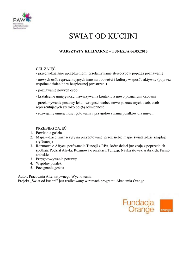 ŚWIAT OD KUCHNI WARSZTATY KULINARNE – TUNEZJA 06.05.2013 CEL ZAJĘĆ: - przeciwdziałanie uprzedzeniom, przełamywanie stereotypów poprzez poznawanie - nowych osób reprezentujących inne narodowości i kultury w sposób aktywny (poprzez wspólne działanie i w bezpiecznej przestrzeni) - poznawanie nowych osób - kształcenie umiejętności nawiązywania kontaktu z nowo poznanymi osobami - przełamywanie postawy lęku i wrogości wobec nowo poznawanych osób, osób reprezentujących szeroko pojętą odmienność - rozwijanie umiejętności gotowania i przygotowywania posiłków dla innych PRZEBIEG ZAJĘĆ: 1. Powitanie gościa 2. Mapa – dzieci zaznaczyły na przygotowanej przez siebie mapie świata gdzie znajduje się Tunezja 3. Rozmowa o Afryce, porównanie Tunezji z RPA, które dzieci już znają z poprzednich spotkań. Podział Afryki. Rozmowa o językach Tunezji. Nauka słówek arabskich. Pismo arabskie. 3. Przygotowywanie potrawy 4. Wspólny posiłek 5. Pożegnanie gościa Autor: Pracownia Alternatywnego Wychowania Projekt „Świat od kuchni” jest realizowany w ramach programu Akademia Orange LISTA UCZESTNIKÓW: 1.Aleksandra Cymer 2.Maciej Kozłowski 3.Paulina Ziółkowska 4.Marta Ziółkowska 5.Bartek Sobuń 6.Marcin Chojnacki 7.Grzegorz Pasikowski 8.Justyna Różalska 9.Paulina Rymkiewicz 10. Franciszek Charliński 11. Aleksandra Zawadowska 12. Paulina Milczarek 13. Ewelina Wieczorek 14. Patrycja Siekiera 15. Karina Lubczyńska 16. Patrycja Kozanecka 17. Hanna Janczak 18. Oliwia Szambelan 19. Julia Szambelan 20. Martyna Milczarek 21. Dawid Nowak 22. Jakub Pilarz 23. Andrzej Kozłowski 24. Ganda Reszka 25.Oliwia Jukiel 26. Dawid Jukiel 27. Gabrysia Budzyńska 28. Miłosz Szambelan 29. Hubert Pilarz 30. Franciszek Janczak 31.Mikołaj Sobuń