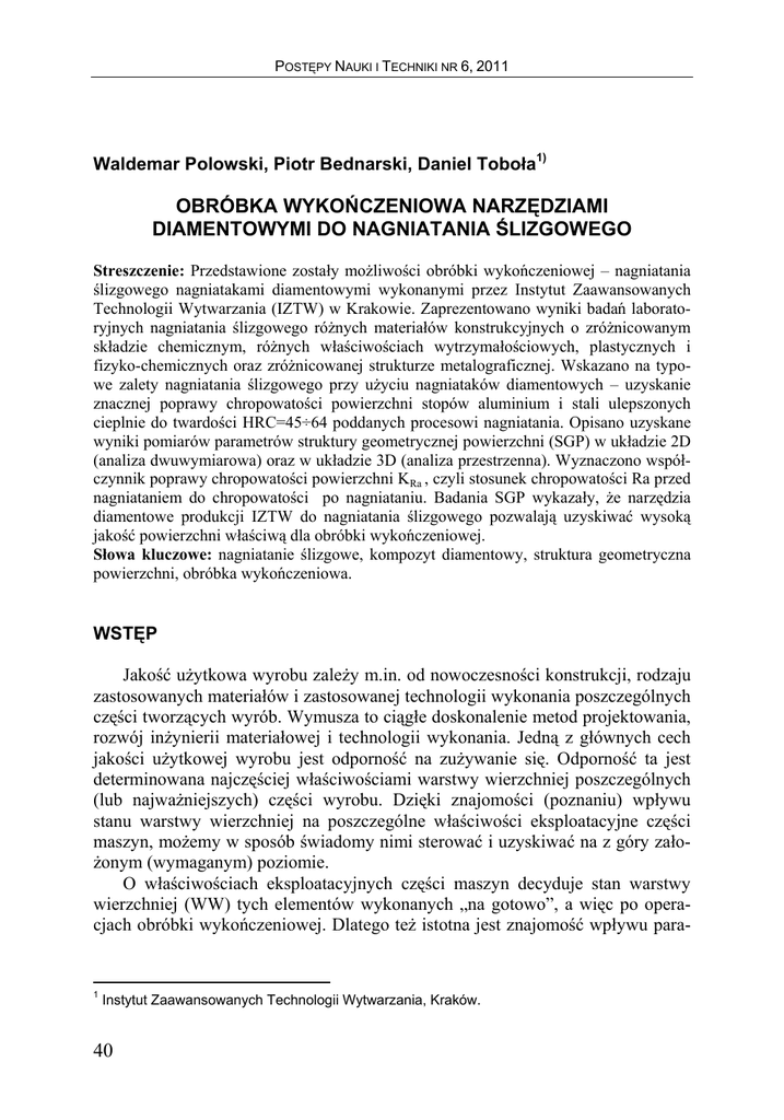 POSTĘPY NAUKI I TECHNIKI NR 6, 2011 Waldemar Polowski, Piotr Bednarski, Daniel Toboła1) OBRÓBKA WYKOŃCZENIOWA NARZĘDZIAMI DIAMENTOWYMI DO NAGNIATANIA ŚLIZGOWEGO Streszczenie: Przedstawione zostały możliwości obróbki wykończeniowej – nagniatania ślizgowego nagniatakami diamentowymi wykonanymi przez Instytut Zaawansowanych Technologii Wytwarzania (IZTW) w Krakowie. Zaprezentowano wyniki badań laboratoryjnych nagniatania ślizgowego różnych materiałów konstrukcyjnych o zróżnicowanym składzie chemicznym, różnych właściwościach wytrzymałościowych, plastycznych i fizyko-chemicznych oraz zróżnicowanej strukturze metalograficznej. Wskazano na typowe zalety nagniatania ślizgowego przy użyciu nagniataków diamentowych – uzyskanie znacznej poprawy chropowatości powierzchni stopów aluminium i stali ulepszonych cieplnie do twardości HRC=45÷64 poddanych procesowi nagniatania. Opisano uzyskane wyniki pomiarów parametrów struktury geometrycznej powierzchni (SGP) w układzie 2D (analiza dwuwymiarowa) oraz w układzie 3D (analiza przestrzenna). Wyznaczono współczynnik poprawy chropowatości powierzchni KRa , czyli stosunek chropowatości Ra przed nagniataniem do chropowatości po nagniataniu. Badania SGP wykazały, że narzędzia diamentowe produkcji IZTW do nagniatania ślizgowego pozwalają uzyskiwać wysoką jakość powierzchni właściwą dla obróbki wykończeniowej. Słowa kluczowe: nagniatanie ślizgowe, kompozyt diamentowy, struktura geometryczna powierzchni, obróbka wykończeniowa. WSTĘP Jakość użytkowa wyrobu zależy m.in. od nowoczesności konstrukcji, rodzaju zastosowanych materiałów i zastosowanej technologii wykonania poszczególnych części tworzących wyrób. Wymusza to ciągłe doskonalenie metod projektowania, rozwój inżynierii materiałowej i technologii wykonania. Jedną z głównych cech jakości użytkowej wyrobu jest odporność na zużywanie się. Odporność ta jest determinowana najczęściej właściwościami warstwy wierzchniej poszczególnych (lub najważniejszych) części wyrobu. Dzięki znajomości (poznaniu) wpływu stanu warstwy wierzchniej na poszczególne właściwości eksploatacyjne części maszyn, możemy w sposób świadomy nimi sterować i uzyskiwać na z góry założonym (wymaganym) poziomie. O właściwościach eksploatacyjnych części maszyn decyduje stan warstwy wierzchniej (WW) tych elementów wykonanych „na gotowo”, a więc po operacjach obróbki wykończeniowej. Dlatego też istotna jest znajomość wpływu para- 1 Instytut Zaawansowanych Technologii Wytwarzania, Kraków. 40 POSTĘPY NAUKI I TECHNIKI NR 6, 2011 metrów technologicznych obróbki wykończeniowej powierzchni części maszyn na stan warstwy wierzchniej (a więc i właściwości eksploatacyjne części). Do tradycyjnych metod obróbki wykończeniowej zalicza się toczenie wykończeniowe, rozwiercanie, szlifowanie, docieranie, gładzenie, polerowanie. Do nowoczesnych metod obróbki wykończeniowej należy zaliczyć tzw. obróbkę gładkościową lub gładkościowo-umacniającą za pomocą zgniotu powierzchniowego na zimno, tzw. nagniatania. Zasadność zastosowania jednej z ww. metod obróbki musi być starannie rozpatrzona w każdym przypadku. Podstawową cechą wyróżniającą nagniatanie spośród różnych metod obróbki wykończeniowej metali jest wykorzystywanie zjawiska powierzchniowego odkształcenia materiału, dzięki czemu nadaje się warstwie wierzchniej przedmiotów obrabianych pewne cechy, które wpływają korzystnie na właściwości eksploatacyjne wyrobów. Przez zastosowanie obróbki nagniataniem można podwyższyć twardość WW, uzyskać wysoką gładkość powierzchni, wytworzyć w WW naprężenia ściskające, uzyskać topografię powierzchni o założonych wymaganiach, uzyskać powierzchnię wolną od pozostałości ziaren ściernych, narostu itp., powierzchnie o bardzo dobrej przyczepności powłok galwanicznych, dużym udziale nośnym i refleksywności. Większość z ww. cech warstwy wierzchniej jest uznawana przez teoretyków i praktyków tribologii za korzystnie wpływające na szereg właściwości użytkowych, a szczególnie na wytrzymałość zmęczeniową i odporność na zużycie. W obróbce nagniataniem wyróżnia się ponad 20 odmian, w tym nagniatanie ślizgowe narzędziem diamentowym. CHARAKTERYSTYKA METODY Nagniatanie ślizgowe jest zaliczane do grupy metod statycznych, w których kontakt narzędzia (elementu nagniatającego) z materiałem obrabianym jest ciągły, a siła nagniatająca ma stałą wartość. Nagniatanie ślizgowe jest powierzchniową obróbką plastyczną, której zalety są typowe dla tych metod obróbki. Jednocześnie metoda ta zapewnia gładkość i dokładność wymiarową właściwą dla wykończeniowej obróbki mechanicznej. Podczas nagniatania ślizgowego twardy i gładki element nagniatający jest dociskany do powierzchni obrabianej z ustaloną siłą. Nagniatak przemieszczając się po obrabianej powierzchni powoduje jej wygładzenie. W przypadku materiałów, w których występuje zjawisko umocnienia plastycznego, nagniataniu towarzyszy powstawanie naprężeń ściskających w warstwie wierzchniej oraz wzrost twardości. W przypadku nagniatania gładkościowego stopień zgniotu i głębokość umocnienia mają dużo mniejsze znaczenie aniżeli poprawa gładkości. Istotną zaletą nagniatania ślizgowego (wygładzania ślizgowego) jest nie tylko samo wygładzanie powierzchni (zmniejszenie chropowatości), ale również uzyskanie korzystnej z punktu widzenia tribologii struktury geometrycznej powierzchni nagniatanej (SGP). Nagniatanie ślizgowe daje w efekcie nie tylko małą chropowatość powierzchni, ale również duże promienie zaokrągleń wierzchołków 41 POSTĘPY NAUKI I TECHNIKI NR 6, 2011 i wrębów nierówności oraz mały kąt ich pochylenia. Wspólnie z wytworzonym zgniotem, wewnętrznymi naprężeniami ściskającymi i zwiększeniem twardości powoduje to zwi
