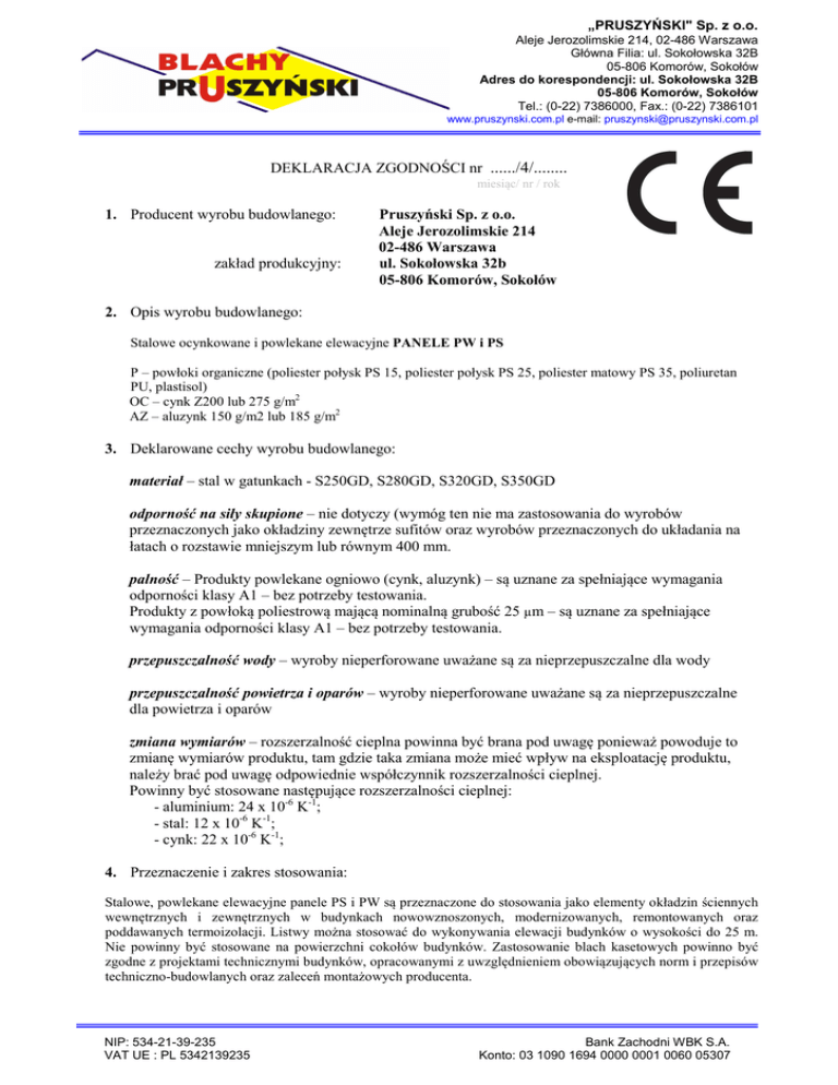 „PRUSZYŃSKI" Sp. z o.o. Aleje Jerozolimskie 214, 02-486 Warszawa Główna Filia: ul. Sokołowska 32B 05-806 Komorów, Sokołów Adres do korespondencji: ul. Sokołowska 32B 05-806 Komorów, Sokołów Tel.: (0-22) 7386000, Fax.: (0-22) 7386101 www.pruszynski.com.pl e-mail: [email protected] DEKLARACJA ZGODNOŚCI nr ....../4/........ miesiąc/ nr / rok 1. Producent wyrobu budowlanego: zakład produkcyjny: Pruszyński Sp. z o.o. Aleje Jerozolimskie 214 02-486 Warszawa ul. Sokołowska 32b 05-806 Komorów, Sokołów 2. Opis wyrobu budowlanego: Stalowe ocynkowane i powlekane elewacyjne PANELE PW i PS P – powłoki organiczne (poliester połysk PS 15, poliester połysk PS 25, poliester matowy PS 35, poliuretan PU, plastisol) OC – cynk Z200 lub 275 g/m2 AZ – aluzynk 150 g/m2 lub 185 g/m2 3. Deklarowane cechy wyrobu budowlanego: materiał – stal w gatunkach - S250GD, S280GD, S320GD, S350GD odporność na siły skupione – nie dotyczy (wymóg ten nie ma zastosowania do wyrobów przeznaczonych jako okładziny zewnętrze sufitów oraz wyrobów przeznaczonych do układania na łatach o rozstawie mniejszym lub równym 400 mm. palność – Produkty powlekane ogniowo (cynk, aluzynk) – są uznane za spełniające wymagania odporności klasy A1 – bez potrzeby testowania. Produkty z powłoką poliestrową mającą nominalną grubość 25 µ m – są uznane za spełniające wymagania odporności klasy A1 – bez potrzeby testowania. przepuszczalność wody – wyroby nieperforowane uważane są za nieprzepuszczalne dla wody przepuszczalność powietrza i oparów – wyroby nieperforowane uważane są za nieprzepuszczalne dla powietrza i oparów zmiana wymiarów – rozszerzalność cieplna powinna być brana pod uwagę ponieważ powoduje to zmianę wymiarów produktu, tam gdzie taka zmiana może mieć wpływ na eksploatację produktu, należy brać pod uwagę odpowiednie współczynnik rozszerzalności cieplnej. Powinny być stosowane następujące rozszerzalności cieplnej: - aluminium: 24 x 10-6 K-1; - stal: 12 x 10-6 K-1; - cynk: 22 x 10-6 K-1; 4. Przeznaczenie i zakres stosowania: Stalowe, powlekane elewacyjne panele PS i PW są przeznaczone do stosowania jako elementy okładzin ściennych wewnętrznych i zewnętrznych w budynkach nowowznoszonych, modernizowanych, remontowanych oraz poddawanych termoizolacji. Listwy można stosować do wykonywania elewacji budynków o wysokości do 25 m. Nie powinny być stosowane na powierzchni cokołów budynków. Zastosowanie blach kasetowych powinno być zgodne z projektami technicznymi budynków, opracowanymi z uwzględnieniem obowiązujących norm i przepisów techniczno-budowlanych oraz zaleceń montażowych producenta. NIP: 534-21-39-235 VAT UE : PL 5342139235 Bank Zachodni WBK S.A. Konto: 03 1090 1694 0000 0001 0060 05307 „PRUSZYŃSKI" Sp. z o.o. Aleje Jerozolimskie 214, 02-486 Warszawa Główna Filia: ul. Sokołowska 32B 05-806 Komorów, Sokołów Adres do korespondencji: ul. Sokołowska 32B 05-806 Komorów, Sokołów Tel.: (0-22) 7386000, Fax.: (0-22) 7386101 www.pruszynski.com.pl e-mail: [email protected] Ze względu na wymagania ochrony przed korozją blachy w zależności od rodzaju powłok mogą być stosowane: a) listwy okładzinowe z powłoką cynkową o masie 200 lub 275 g/m2 lub z powłoką aluzynkową o masie 150 g/m2 lub 185 g/m2 i powłokami poliestrowymi o grubości 25 µm lub powłoką poliuretanową o grubości 50 µm – w środowiskach o kategorii korozyjności C1, C2 i C3 wg PN-EN ISO 12944-2:2001, b) listwy okładzinowe z powłoką cynkową o masie 200 lub 275 g/m2 lub z powłoką aluzynkową o masie 150 g/m2 lub 185 g/m2i powłokami poliestrowymi o grubości 15 µm – w środowiskach o kategorii korozyjności atmosfery C1, C2 wg PN-EN ISO 12944-2:2001 c) listwy okładzinowe z powłoką cynkową o masie 200 lub 275 g/m2 lub z powłoką aluzynkową o masie 150 g/m2 lub 185 g/m2, bez powłok organicznych – w pomieszczeniach zamkniętych w środowiskach o kategorii korozyjności atmosfery C1, C2 wg PN-EN ISO 12944-2:2001, d) listwy okładzinowe z powłoką cynkową o masie 200 lub 275 g/m2 lub z powłoką aluzynkową o masie 150 g/m2 lub 185 g/m2i powłokami malarskimi dopuszczonymi do obrotu i stosowania – zgodnie z zakresem stosowania powłok malarskich, określonych w Polskich Normach lub aprobatach technicznych. 5. Specyfikacja techniczna: PN-EN 14782:2008 6. Numer i nazwa akredytowanej jednostki certyfikującej lub laboratorium oraz numer certyfikatu lub numer raportu z badań typu, jeżeli taka jednostka brała udział w zastosowanym systemie oceny zgodności wyrobu budowlanego: nie dotyczy Deklaruję z pełną odpowiedzialnością, że wyrób budowlany jest zgodny ze specyfikacją techniczną w pkt 5. Sokołów, ---------------------------------------(miejsce i data wystawienia) NIP: 534-21-39-235 VAT UE : PL 5342139235 --------------------------------------------------------------(imię, nazwisko i podpis osoby upoważnionej) Bank Zachodni WBK S.A. Konto: 03 1090 1694 0000 0001 0060 05307