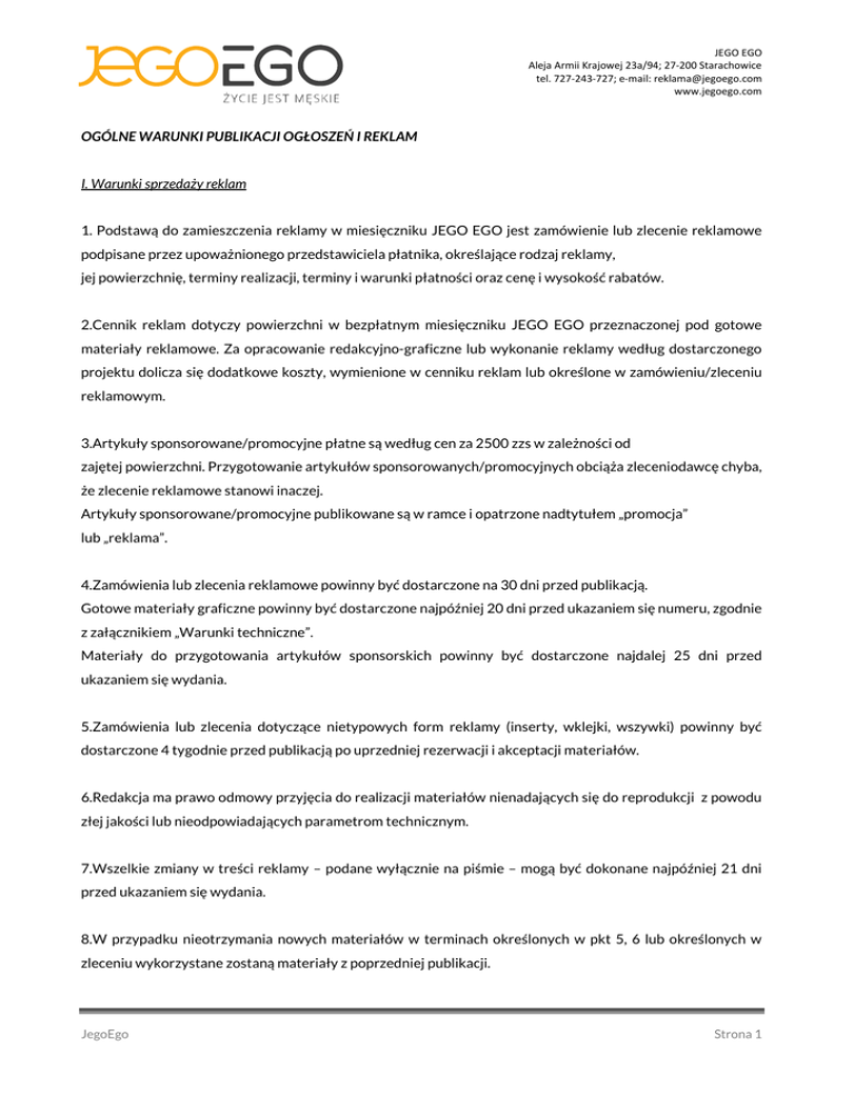 JEGO EGO Aleja Armii Krajowej 23a/94; 27-200 Starachowice tel. 727-243-727; e-mail: [email protected] www.jegoego.com OGÓLNE WARUNKI PUBLIKACJI OGŁOSZEŃ I REKLAM I. Warunki sprzedaży reklam 1. Podstawą do zamieszczenia reklamy w miesięczniku JEGO EGO jest zamówienie lub zlecenie reklamowe podpisane przez upoważnionego przedstawiciela płatnika, określające rodzaj reklamy, jej powierzchnię, terminy realizacji, terminy i warunki płatności oraz cenę i wysokość rabatów. 2.Cennik reklam dotyczy powierzchni w bezpłatnym miesięczniku JEGO EGO przeznaczonej pod gotowe materiały reklamowe. Za opracowanie redakcyjno-graficzne lub wykonanie reklamy według dostarczonego projektu dolicza się dodatkowe koszty, wymienione w cenniku reklam lub określone w zamówieniu/zleceniu reklamowym. 3.Artykuły sponsorowane/promocyjne płatne są według cen za 2500 zzs w zależności od zajętej powierzchni. Przygotowanie artykułów sponsorowanych/promocyjnych obciąża zleceniodawcę chyba, że zlecenie reklamowe stanowi inaczej. Artykuły sponsorowane/promocyjne publikowane są w ramce i opatrzone nadtytułem „promocja” lub „reklama”. 4.Zamówienia lub zlecenia reklamowe powinny być dostarczone na 30 dni przed publikacją. Gotowe materiały graficzne powinny być dostarczone najpóźniej 20 dni przed ukazaniem się numeru, zgodnie z załącznikiem „Warunki techniczne”. Materiały do przygotowania artykułów sponsorskich powinny być dostarczone najdalej 25 dni przed ukazaniem się wydania. 5.Zamówienia lub zlecenia dotyczące nietypowych form reklamy (inserty, wklejki, wszywki) powinny być dostarczone 4 tygodnie przed publikacją po uprzedniej rezerwacji i akceptacji materiałów. 6.Redakcja ma prawo odmowy przyjęcia do realizacji materiałów nienadających się do reprodukcji z powodu złej jakości lub nieodpowiadających parametrom technicznym. 7.Wszelkie zmiany w treści reklamy – podane wyłącznie na piśmie – mogą być dokonane najpóźniej 21 dni przed ukazaniem się wydania. 8.W przypadku nieotrzymania nowych materiałów w terminach określonych w pkt 5, 6 lub określonych w zleceniu wykorzystane zostaną materiały z poprzedniej publikacji. JegoEgo Strona 1 JEGO EGO Aleja Armii Krajowej 23a/94; 27-200 Starachowice tel. 727-243-727; e-mail: [email protected] www.jegoego.com 9. W przypadku wycofania zlecenia/zamówienia w terminie 30 dni przed ukazaniem się wydania zleceniodawca ponosi koszty w wysokości 50%. Wycofanie zamówienia lub zlecenia reklamowego w terminie 21 dni lub krótszym przed ukazaniem się wydania uprawnia redakcję do obciążenia zleceniodawcy równowartością 100% uzgodnionej wartości reklamy. 10. Jeżeli materiały graficzne dostarczone do reprodukcji mają być zwrócone zleceniodawcy, należy to wyraźnie zaznaczyć na zleceniu/zamówieniu. 11.Redakcja nie ponosi odpowiedzialności za treść zamieszczanych reklam oraz może odmówić zamieszczenia reklamy, insertu, jeśli ich treść lub forma pozostają w sprzeczności z prawem, linią programową i charakterem pisma oraz zasadami publikacji reklam. 12. Reklama wydrukowana może różnić się kolorystycznie od dołączonej próby kolorów o +/- 3%. 13. Redakcja nie ponosi odpowiedzialności za ewentualne szkody wynikłe na skutek sił wyższych, które zakłóciły częściowo lub całkowicie produkcję lub dystrybucję miesięcznika. II. Reklamacje 1. Ewentualne reklamacje – wyłącznie na piśmie i z egzemplarzem dowodowym – przyjmowane są w ciągu 10 dni od daty ukazania się reklamy. Liczy się dzień dostarczenia reklamacji do Wydawnictwa. 2.Reklamacji nie podlegają reklamy, których projekty nie spełniają wszystkich wymogów technicznych. 3.Reklamacje złożone po terminie lub bez egzemplarzy dowodowych nie będą rozpatrywane. 4.W przypadku uznania reklamacji strony zgodnie ustalą drogą negocjacji uzasadnioną wielkość i formę zadośćuczynienia w zależności od stopnia błędu lub wielkości błędnie wydrukowanego nakładu. III. Warunki płatności 1. Płatność za druk ogłoszeń i reklam dokonywana jest na konto podane na zleceniu i fakturze. 2.Ustaloną kwotę należy wpłacić w terminie określonym w zleceniu/zamówieniu. 3.Warunki i terminy płatności w wyjątkowych przypadkach mogą być ustalane indywidualnie ze zleceniodawcą. JegoEgo Strona 2 JEGO EGO Aleja Armii Krajowej 23a/94; 27-200 Starachowice tel. 727-243-727; e-mail: [email protected] www.jegoego.com 4.W przypadku opóźnienia płatności w terminie ustalonym zgodnie z ustępem III pkt 2 zleceniodawca zostanie obciążony odsetkami zgodnie z obowiązującymi przepisami prawnymi. 5.Redakcja zastrzega sobie prawo wstrzymania druku zamówionych ogłoszeń i reklam, jeśli poprzednie nie zostały opłacone. 6.W przypadku niewywiązania się z podpisanego zamówienia przez klienta i rezygnacji z części zamówionych reklam/ogłoszeń Wydawnictwo może wystawić fakturę korygującą dotychczasowe opłaty za reklamy/ogłoszenia do wysokości rabatów należnych. 7.Kosztami windykacji zaległych należności jest obciążany dłużnik. IV. Postanowienia końcowe 1. W razie zaistnienia sporów dotyczących publikacji reklam będą one rozstrzygane przez sąd powszechny właściwy dla siedziby Wydawcy. 2. Niniejsze ogólne warunki publikacji ogłoszeń i reklam w miesięczniku JEGO EGO wchodzą w życie z dniem 1 września 2015 roku …............................... …..................................................... (data i podpis zleceniodawcy) JegoEgo Strona 3