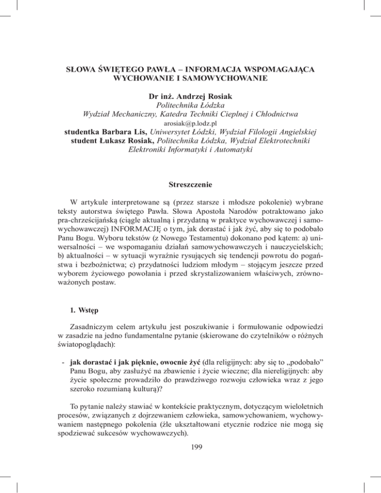 SŁOWA ŚWIĘTEGO PAWŁA – INFORMACJA WSPOMAGAJĄCA WYCHOWANIE I SAMOWYCHOWANIE Dr inż. Andrzej Rosiak Politechnika Łódzka Wydział Mechaniczny, Katedra Techniki Cieplnej i Chłodnictwa [email protected] studentka Barbara Lis, Uniwersytet Łódzki, Wydział Filologii Angielskiej student Łukasz Rosiak, Politechnika Łódzka, Wydział Elektrotechniki Elektroniki Informatyki i Automatyki Streszczenie W artykule interpretowane są (przez starsze i młodsze pokolenie) wybrane teksty autorstwa świętego Pawła. Słowa Apostoła Narodów potraktowano jako pra-chrześcijańską (ciągle aktualną i przydatną w praktyce wychowawczej i samowychowawczej) INFORMACJĘ o tym, jak dorastać i jak żyć, aby się to podobało Panu Bogu. Wyboru tekstów (z Nowego Testamentu) dokonano pod kątem: a) uniwersalności – we wspomaganiu działań samowychowawczych i nauczycielskich; b) aktualności – w sytuacji wyraźnie rysujących się tendencji powrotu do pogaństwa i bezbożnictwa; c) przydatności ludziom młodym – stojącym jeszcze przed wyborem życiowego powołania i przed skrystalizowaniem właściwych, zrównoważonych postaw. 1. Wstęp Zasadniczym celem artykułu jest poszukiwanie i formułowanie odpowiedzi w zasadzie na jedno fundamentalne pytanie (skierowane do czytelników o różnych światopoglądach): - jak dorastać i jak pięknie, owocnie żyć (dla religijnych: aby się to „podobało” Panu Bogu, aby zasłużyć na zbawienie i życie wieczne; dla niereligijnych: aby życie społeczne prowadziło do prawdziwego rozwoju człowieka wraz z jego szeroko rozumianą kulturą)? To pytanie należy stawiać w kontekście praktycznym, dotyczącym wieloletnich procesów, związanych z dojrzewaniem człowieka, samowychowaniem, wychowywaniem następnego pokolenia (źle ukształtowani etycznie rodzice nie mogą się spodziewać sukcesów wychowawczych). 199 Jak zatem uwrażliwiać swoje sumienie (głos rozumu), jak wychowywać siebie, dzieci, młodzież, ludzi ze swojego otoczenia, aby to skutkowało zrównoważonym (duchowo-materialnym) rozwojem cywilizacji (nie tylko postępu technicznego)? Jakie powinny być zasady i praktyka postępowania jednostek i społeczeństw, aby: - ograniczyć tak groźne zjawiska, jak polityczny i obyczajowy terroryzm (zrodzony zwykle na gruncie wynaturzeń ideowo-religijnych) albo korupcja (zrodzona zwykle w moralnej próżni, powstającej w warunkach postaw antyreligijnych, np. skrajnego materializmu), - zwyciężała prawda, dobro i piękno, - wśród nas mniej było złoczyńców: zbrodniarzy, gwałcicieli, złodziei, alkoholików, narkomanów, kłamców, łobuzów...? Osoba religijna odpowie prosto: żyj według bożych przykazań i realizuj, przeznaczony stricte dla Ciebie, boży plan zbawienia. Osoba niereligijna powie: żyj tak, aby nie przekraczać prawa, a jednocześnie nie przekraczać sfery wolności drugiego człowieka. Historia pokazuje, że w dynamicznym procesie życia nawet niewielkie (czasem trudno dostrzegalne, czasami bagatelizowane) odstępstwa od proponowanych praw i zasad (np. Wielkich Religii oraz parlamentów) prowadzą do olbrzymich napięć i katastrofalnych skutków (fizyk oceni to zjawisko jako niestabilność układu). Przejawem tych napięć w skali makro są wojny, a w mniejszej skali – cała lawina różnego rodzaju wynaturzeń. Oczywiste jest, że na postawione pytanie, jak dorastać i jak pięknie, owocnie żyć, nie ma jednej ani nie ma „jedynie słusznej” odpowiedzi. Nie ma instytucji czy osoby, która mogłaby odpowiedzieć „wiem, jestem najbardziej kompetentny (– a) w tych kwestiach”. Tego rodzaju pytanie powinien sobie zadawać każdy, choćby z powodu istnienia pojęcia SENSU istnienia. Zdajemy sobie sprawę z ograniczoności zarówno umysłów, jak i nawet bardzo przemyślanych (pojedynczych, grupowych, instytucjonalnych) działań w kwestiach wychowania i samowychowania. Jesteśmy natomiast przeświadczeni, że „klucz” dla pozytywnej przyszłości tkwi w zrównoważonym, harmonijnym rozwoju duchowo-materialnym, szczególnie młodego i dorastającego człowieka. Rozwijanie zrównoważonej osobowości jest trudne dziś, w czasach pluralizmu (wielości światopoglądów albo raczej tzw. materializmu praktycznego, z jego ułomną, bo jednostronną hierarchią wartości), może nawet trudniejsze niż w minionych czasach materializmu ideologicznego, który nie chciał „widzieć” duchowych wymiarów rzeczywistości i kreował „dogmat” o ziemskim „raju” bez Boga. Szczególna trudność dotyczy rozwoju młodego człowieka – nastolatka, którego delikatna „tkanka osobowościowa” jest narażona na działanie wielu przeciwstawnych, często destrukcyjnych sił. Postawione pytania są wystarczającym powodem, aby odwoływać się do autorytetów. Takim najwyższej miary Autorytetem, Misjonarzem (a więc specjalistąpraktykiem od życia społeczności w harmonii z Bogiem) jest Apostoł Narodów 200 – św. Paweł. Jego listy okazywały się niezwykle ważnym elementem w tworzeniu i rozwoju ówczesnych gmin chrześcijańskich – wspólnot Nowego Przymierza z Trój-Jedynym Bogiem – Zbawicielem. Wierzymy, że św. Paweł jest przekaźnikiem informacji pochodzącej od samego Stwórcy. Wiemy, że jego listy przyczyniły się do rozwoju: myśli teologicznej i chrześcijańskiej nauki społecznej. Zachęcamy do wczytywania się w listy Apostoła [1]. Jego słowa, także dziś pomagają: - zgłębiać tajemnicę Ewangelii Jezusa Chrystusa (wskazania Ewangelii to dla nas panaceum na teraźniejszość i przyszłość człowieka); - diagnozować przyczyny i skutki grzesznych, nagannych postaw, utrudniających współdziałanie z Bogiem dla osiągania pozytywnych efektów w teraźniejszości, zbawienia i życia wiecznego w przyszłości. 2. Jak dorastać – diagnozy i porady świętego Pawła (i nasze) Święty Paweł otrzymał od Pana Boga dar nazywania „rzeczy” po imieniu, bez „owijania w bawełn