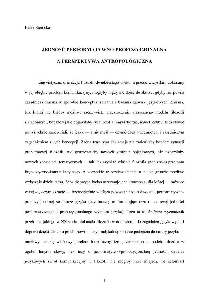 Beata Sierocka JEDNOŚĆ PERFORMATYWNO-PROPOZYCJONALNA A PERSPEKTYWA ANTROPOLOGICZNA Lingwistyczna orientacja filozofii dwudziestego wieku, a przede wszystkim dokonany w jej obrębie przełom komunikacyjny, mogłyby nigdy nie dojść do skutku, gdyby nie pewna zasadnicza zmiana w sposobie konceptualizowania i badania zjawisk językowych. Zmiana, bez której nie byłoby możliwe rzeczywiste przekroczenie klasycznego modelu filozofii świadomości, bez której nie pojawiłaby się filozofia lingwistyczna, nawet jeśliby filozofowie po tysiąckroć zapewniali, że język — a nie myśl — czynić chcą przedmiotem i zasadniczym zagadnieniem swych koncepcji. Żadna tego typu deklaracja nie zmieniłaby bowiem sytuacji problemowej filozofii, nie generowałaby nowych struktur pojęciowych, nie tworzyłaby nowych konstelacji tematycznych — tak, jak czyni to właśnie filozofia spod znaku przełomu lingwistyczno-komunikacyjnego. A wszystkie te przekształcenia są na jej gruncie możliwe wyłącznie dzięki temu, że w tle swych badań utrzymuje ona koncepcję, dla której — mówiąc w największym skrócie — bezwzględnie wiążąca pozostaje teza o dwoistej, performatywnopropozycjonalnej strukturze języka (czy inaczej to formułując: teza o istotowej jedności performatywnego i propozycjonalnego wymiaru języka). Teza ta to de facto wyznacznik przełomu, jakiego w XX wieku dokonała filozofia w odniesieniu do zagadnień językowych. I dopiero dzięki takiemu przełomowi — czyli radykalnej zmianie podejścia do natury języka — możliwy stał się właściwy przełom filozoficzny, tzn. przekształcenie modelu filozofii w ogóle. Innymi słowy, bez tezy o performatywno-propozycjonalnej jedności struktur językowych zwrot komunikacyjny w filozofii nie mógłby mieć miejsca. Te natomiast 1 przekształcenia, jakie — za Richardem Rortym — określane są jako zwrot lingwistyczny, mogłyby w takich warunkach zaowocować co najwyżej „okrojeniem” dziedziny badań, ale nie jej przekształceniem. Lub mówiąc w konwencji, jaką zaproponował John Searle, pozwoliłyby na rozwinięcie — być może nawet bardzo znaczące — filozofii języka (w ekstremalnych przypadkach do niej właśnie ograniczając całą pracę filozoficzną), natomiast nie dałyby żadnych podstaw do ufundowania filozofii lingwistycznej. A tylko w jej obrębie badania filozoficzne przyjmują taką postać, która implikuje kolejną przełomową fazę, tzn. właśnie zwrot komunikacyjny. Jego ranga — tak dla filozofii, jak i dla innych dyscyplin humanistycznych — nie ulega dziś żadnej wątpliwości. Poświadcza to wystarczająco długa już lista znamienitych teoretycznych prac. Jednak nie oznacza to, by filozofia miała jasność co do zasadniczych na jego temat ustaleń. W żadnym razie nie jest jeszcze oczywiste, jakie są tego przełomu faktyczne konsekwencje; brak zgodności co do tego, czym określa się jego specyfika, a nawet co do tego, skąd czerpie on swe teoretyczne źródła i podstawy. Co do pierwszej kwestii — wiadomo — rzecz pozostaje in statu nascendi. Rozstrzygnięcie drugiej z nich to sprawa zawisła w dużej mierze od rangi filozoficznych argumentów (a więc od spójności struktury teoretycznej, w obrębie której argumentację taką będzie się budowało)1. Najbardziej jednoznaczna i niekontrowersyjna wydaje się kwestia trzecia, a więc pytanie o teoretyczne zaplecze, które zwrot ten uczyniło możliwym. Odpowiedź na to pytanie — a z nią związana jest problematyka niniejszego artykułu — ma o tyle wagę szczególną, iż jest istotnie wiążąca dla obu wcześniejszych kwestii. Jest bowiem 1 Analizy transcendentalno-pragmatycznego podejścia do tych zagadnień prezentowałam w: Beata Sierocka, Krytyka i dyskurs. O transcendentalno-pragmatycznym uprawomocnieniu krytyki filozoficznej, Aureus, Kraków 2003. 2 oczywiste, że teoretyczne źródła i podstawy każdej sytuacji problemowej modelują jej zasadniczy kształt i wyznaczają zasięg możliwych filozoficznych konsekwencji. W odniesieniu do problematyki, o której tutaj mowa, odpowiedź na tego typu pytanie dałaby się streścić w dwu zwięzłych punktach. (1) Teoretyczną podstawę przełomu komunikacyjnego w filozofii stanowi koncepcja języka fundowana na idei jedności performatywno-propozycjonalnej. (2) Źródłem tej koncepcji — a więc i źródłem zasadniczej dla niej idei — jest podejście badawcze, którego specyfika pozwala na określenie go mianem „podejścia antropologicznego” bądź „perspektywy antropologicznej”2. Charakterystyczne jest przy tym, że o okolicznościach sugerowanych w obu tych punktach — a zwłaszcza o immanentnym związku, jaki zachodzi pomiędzy koncepcjami spod znaku przełomu lingwistyczno-komunikacyjnego a perspektywą antropologiczną — nie rozstrzygają w istocie literalnie formułowane w tych koncepcjach deklaracje, lecz rzeczywisty profil przedsiębranych przez nie badań filozoficznych (a niekiedy tylko pewne pojedyncze decyzje teoretyczne, nie zawsze zresztą zdradzające swe powinowactwo z podejściem antropologicznym). Toteż w uzupełnieniu dwóch wskazanych powyżej punktów należałoby jeszcze zasugerować, że (3) immanentną obecność perspektywy antropologicznej w dwudziestowiecznej filozofii lingwistycznej ujawniają dopiero zewnętrzne teoretyczne analizy i interpretacje poszczególnych jej projektów, a (4) najbardziej wartościowy i pouczający w z orzec takiej interpretacji — określający zarówno ogólny jej kierunek, jak też liczne jej niuanse — ukształtowany został 2 p o z a f i l o z o f i ą. Bowiem z istoty Uprzedzając późniejsze uwagi, należałoby już w tym miejscu podkreślić, że stosowanie tutaj terminu „perspektywa antropologiczna” nie ma odsyłać ani do antropologii filozoficznej, ani do antropologii fizycznej, lecz wyłącznie do antropologii społecznej (lub kulturowej), i to jedynie z uwagi na to, że właści