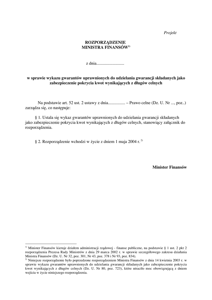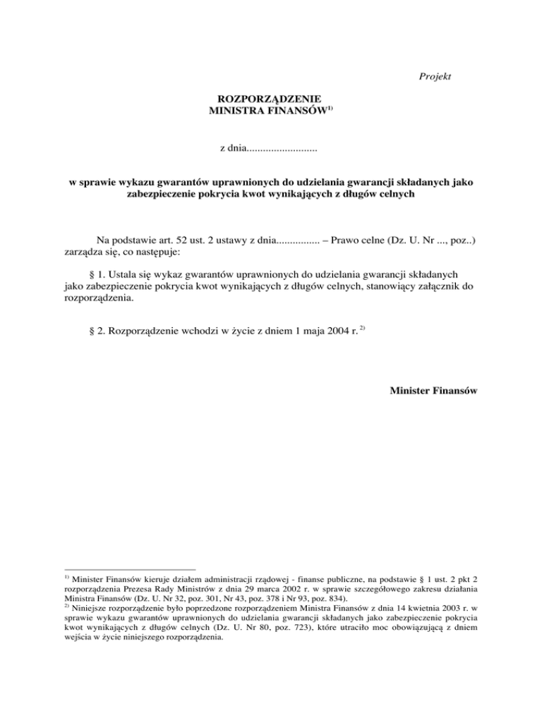 Projekt ROZPORZĄDZENIE MINISTRA FINANSÓW1) z dnia.......................... w sprawie wykazu gwarantów uprawnionych do udzielania gwarancji składanych jako zabezpieczenie pokrycia kwot wynikających z długów celnych Na podstawie art. 52 ust. 2 ustawy z dnia................ – Prawo celne (Dz. U. Nr ..., poz..) zarządza się, co następuje: § 1. Ustala się wykaz gwarantów uprawnionych do udzielania gwarancji składanych jako zabezpieczenie pokrycia kwot wynikających z długów celnych, stanowiący załącznik do rozporządzenia. § 2. Rozporządzenie wchodzi w życie z dniem 1 maja 2004 r. 2) Minister Finansów 1) Minister Finansów kieruje działem administracji rządowej - finanse publiczne, na podstawie § 1 ust. 2 pkt 2 rozporządzenia Prezesa Rady Ministrów z dnia 29 marca 2002 r. w sprawie szczegółowego zakresu działania Ministra Finansów (Dz. U. Nr 32, poz. 301, Nr 43, poz. 378 i Nr 93, poz. 834). 2) Niniejsze rozporządzenie było poprzedzone rozporządzeniem Ministra Finansów z dnia 14 kwietnia 2003 r. w sprawie wykazu gwarantów uprawnionych do udzielania gwarancji składanych jako zabezpieczenie pokrycia kwot wynikających z długów celnych (Dz. U. Nr 80, poz. 723), które utraciło moc obowiązującą z dniem wejścia w życie niniejszego rozporządzenia. Załącznik do rozporządzenia Ministra Finansów z dnia ............................................. WYKAZ GWARANTÓW UPRAWNIONYCH DO UDZIELANIA GWARANCJI SKŁADANYCH JAKO ZABEZPIECZENIE POKRYCIA KWOT WYNIKAJĄCYCH Z DŁUGÓW CELNYCH I. Banki: 1. 2. 3. 4. 5. 6. 7. 8. 9. 10. 11. 12. 13. 14. 15. 16. 17. 18. 19. 20. 21. 22. 23. 24. 25. 26. 27. 28. 29. 30. 31. 32. 33. 34. 35. 36. ABN AMRO Bank (Polska) S.A. AIG Bank Polska S.A. Bank Gospodarki Żywnościowej S.A. Bank Gospodarstwa Krajowego Bank Handlowy w Warszawie S.A. Bank Inicjatyw Społeczno-Ekonomicznych S.A. Bank Millennium S.A. Bank Ochrony Środowiska S.A. Bank of Tokyo-Mitsubishi (Polska) S.A. Bank Pocztowy S.A. Bank Polska Kasa Opieki S.A. Bank Polskiej Spółdzielczości S.A. Bank Przemysłowo-Handlowy PBK S.A. Bank Przemysłowy S.A. Bank Svenska Handelsbanken (Polska) S.A. Bank Współpracy Europejskiej S.A. Bank Zachodni WBK S.A. Bankgesellschaft Berlin (Polska) S.A. BNP Paribas Bank Polska S.A. BRE Bank S.A. CC-Bank S.A. Credit Lyonnais Bank Polska S.A DaimlerChrysler Services Bank Polska S.A. Danske Bank Polska S.A. Deutsche Bank PBC S.A. Deutsche Bank Polska S.A. Dominet Bank S.A. Dresdner Bank Polska S.A. DZ Bank Polska S.A. Euro Bank S.A. FCE Bank Polska S.A. Fiat Bank Polska S.A. FORTIS Bank Polska S.A. GE Bank Mieszkaniowy S.A. GE Capital Bank S.A. GMAC Bank Polska S.A. 2 37. 38. 39. 40. 41. 42. 43. 44. 45. 46. 47. 48. 49. 50. 51. 52. Gospodarczy Bank Wielkopolski S.A. Górnośląski Bank Gospodarczy S.A. ING Bank Śląski S.A. Inwest-Bank S.A. Kredyt Bank S.A. Lukas Bank S.A. Mazowiecki Bank Regionalny S.A. Nord/LB Bank Polska Norddeutsche Landesbank S.A. Nordea Bank Polska S.A. Powszechna Kasa Oszczędności Bank Polski S.A. Rabobank Polska S.A. Raiffeisen Bank Polska S.A. Société Générale S.A. Oddział w Polsce Volkswagen Bank Polska S.A. WestLB Bank Polska S.A. Wschodni Bank Cukrownictwa S.A. II. Zakłady ubezpieczeń: 1. AIG Polska Towarzystwo Ubezpieczeń S.A. w Warszawie 2. Commercial Union Polska – Towarzystwo Ubezpieczeń Ogólnych S.A. w Warszawie 3. ”Concordia Wielkopolska” Towarzystwo Ubezpieczeń Wzajemnych w Poznaniu 4. Euler Hermes S.A. w Warszawie 5. Fiat Ubezpieczenia Majątkowe S.A. w Warszawie 6. Generali Towarzystwo Ubezpieczeń S.A. w Warszawie 7. "Gerling Polska" Towarzystwo Ubezpieczeń S.A. w Warszawie 8. Korporacja Ubezpieczeniowa Filar S.A. w Szczecinie 9. Korporacja Ubezpieczeń Kredytów Eksportowych S.A. w Warszawie 10. Pocztowe Towarzystwo Ubezpieczeń Wzajemnych w Warszawie 11. Polskie Towarzystwo Ubezpieczeń S.A. w Warszawie 12. Powszechny Zakład Ubezpieczeń S.A. w Warszawie 13. Sampo Towarzystwo Ubezpieczeń S.A. w Warszawie (IF TU S.A.) 14. Sopockie Towarzystwo Ubezpieczeniowe Ergo Hestia S.A. w Sopocie 15. Towarzystwo Ubezpieczeniowe Allianz Polska S.A. w Warszawie 16. Towarzystwo Ubezpieczeniowe Compensa S.A. w Warszawie 17. Towarzystwo Ubezpieczeniowe Europa S.A. we Wrocławiu 18. Towarzystwo Ubezpieczeniowe Inter-Polska S.A. w Warszawie 19. Towarzystwo Ubezpieczeniowe Winterthur S.A. w Warszawie 20. Towarzystwo Ubezpieczeń i Reasekuracji CIGNA - STU S.A. w Warszawie 21. Towarzystwo Ubezpieczeń i Reasekuracji Partner S.A. w Warszawie 22. Towarzystwo Ubezpieczeń i Reasekuracji Warta S.A. w Warszawie 23. Towarzystwo Ubezpieczeń w Rolnictwie i Gospodarce Żywnościowej Agropoplisa S.A. w Warszawie 24. Tryg Polska Towarzystwo Ubezpieczeń S.A. w Radomiu 25. UNIQA Towarzystwo Ubezpieczeń S.A. w Łodzi 26. Zurich Towarzystwo Ubezpieczeń S.A. w Warszawie 3
