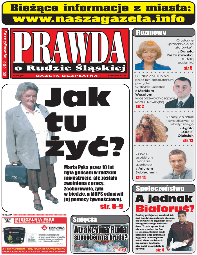 Rozmowy O ustawie „przedszkole za złotówkę”, z Danutą Pietraszewską, rudzką posłanką str. 5 Nr 06 (16) czerwiec 2013r. Jak tu żyć? Maria Pyka przez 10 lat była gońcem w rudzkim magistracie, ale została zwolniona z pracy. Zachorowała, żyła w biedzie, a MOPS odmówił jej pomocy żywnościowej. str. 8-9 REKLAMA IIIIIIIIIIIIIIIIIIIIIIIIIIIIIIIIIIIIIIIIIIIIIIIIIIIIIIIIIIIIIIIIIIIIIIIIIIIIIIIIIIIIIIIIII Spięcia Atrakcyjna Ruda sposobem na bruda? str. 4 O udzieleniu lub nie przez RM absolutorium prezydent Grażynie Dziedzic z Markiem Wesołym wiceprzewodniczącym Komisji Rewizyjnej str. 2 O pasji do sztuki i szydełkowania artystycznego z agatą „olek” Oleksiak str. 13 O życiu osobistym i karierze sportowej z arturem Sobiechem str. 14 Społeczeństwo A jednak Białoruś? Rudzcy policjanci, zamiast ścigać bandytów, zajmują się przesłuchiwaniem organizatorów ubiegłorocznego referendum. Z tych spraw i tak nic nie wynika, bo Sąd je umarza. Rudzki magistrat nie daje jednak za wygraną. Nieoficjalnie mówi się o naciskach na organy ścigania, aby dalej prowadziły te sprawy. str. 4 2 Aktualności PRAWDA O RUDZIE ŚLĄSKIEJ maj 2013r. Komisja Rewizyjna Rady Miasta zarekomendowała radnym nieudzielenie prezydent Grażynie Dziedzic absolutorium. Jest wielce prawdopodobne, że taki właśnie będzie scenariusz najbliższej sesji Rady Miasta. To będzie najważniejsza i najciekawsza sesja w tym roku. C oś się w nas buntuje, kiedy słyszymy takie historie, jak opisane przez nas życiowe zmagania Marii Pyki. Wiemy, że tak nie powinno być. Ale jesteśmy bezsilni, kiedy na naszych oczach takie rzeczy się dzieją. Kto potrafi logicznie wytłumaczyć sytuację, kiedy kobieta po 32 latach uczciwej pracy zostaje nagle bez środków do życia. ZUS przez wszystkie te lata ściągał z jej pensji składki ubezpieczeniowe i zdrowotne. Ale kiedy Pani Maria upomniała się o swoje, ZUS pokazał figę z makiem i ugiął się dopiero przed wyrokiem Sądu. Jak wyjaśnić postawę rudzkiego MOPS, który schorowanej, znerwicowanej i biednej kobiecie, żyjącej na łasce matki i brata, nie dał złotówki zapomogi, a nawet odmówił prawa do skorzystania z rządowego programu dożywiania najuboższych. I takie rzeczy dzieją się w Rudzie Śląskiej, gdzie pomoc społeczna jest podobno oczkiem w głowie najwyższych władz. Zresztą wystarczy popatrzeć na konstrukcję budżetu naszego miasta, aby zorientować się, że w wydatkach na instytucje pomocowe nie mamy sobie równych. Można jedynie zapytać, o sposób dystrybucji tych pieniądzy, skoro uczciwa i porządna kobieta, która znalazła się na życiowym zakręcie, a raczej nad przepaścią, nie ma prawa do pomocy. Historia Marii Pyki jest pouczająca z jeszcze jednego powodu. Była kiedyś pracownikiem Urzędu Miasta, ale straciła etat w wyniku zwolnień grupowych. Wszyscy pamiętamy zapewnienia, że redukcje etatów zostaną przeprowadzone tak, aby zwalnianym pracownikom nie działa się krzywda. Pani Marii nie stała się krzywda. Ona przeżyła koszmar. „Żółta kartka” dla prezydent Grażyny Dziedzic Rozmowa z Markiem Wesołym, przewodniczącym Komisji Budżetu i Przedsiębiorczości oraz wiceprzewodniczącym Komisji Rewizyjnej Rady Miasta - Dlaczego Komisja Rewizyjna chce radnym rekomendować nieudzielenie absolutorium Grażynie Dziedzic? - Komisja rewizyjna Rady Miasta składa się z przewodniczącego i sześciu członków komisji, a więc siedmiu osób. W trakcie dyskusji nad absolutorium dla Pani prezydent rozgorzała dyskusja. Różnimy się w swoich ocenach co do udzielenia bądź nieudzielenia absolutorium. Jak wszyscy wiedzą w takich sytuacjach, w demokracji rozstrzyga głosowanie. W głosowaniu okazało się, że jednak więcej głosów było za wnioskiem o nieudzielenie absolutorium. Jako ciekawostkę powiem tylko, że komisja obradowała na swym ostatnim posiedzeniu aż sześć godzin. - Jakie czynniki braliście pod uwagę? Nieracjonalność wydatków? Niejasność w dokumentowaniu wydatkowania? - Panie redaktorze, braliśmy pod uwagę wiele czynników. Nieprawdą jest, że komisja rewizyjna, a nawet cała Rada Miasta ocenia tylko matematyczne wykonanie budżetu, bo przecież tu prawie zawsze wszystko się zgadza i dzieje się tak również za sprawą Rady Miasta, która głosuje zmiany w ciągu roku, jak i porządkuje budżet na swoim posiedzeniu pod koniec grudnia. A więc ocenialiśmy również wykonanie uchwał, zarządzanie jednostkami i spółkami miejskimi, rzetelność w zarządzaniu majątkiem JST, ocenialiśmy także celowość wydatkowanych środków i sprawozdawczość. Najwięcej zastrzeżeń komisja miała właśnie do celowości wydawania publicznych pieniędzy, rozumiem argumentację części radnych, że zarządzenia finansowe leżą w gestii Prezydenta, ale nie oznacza to, że może on wydawać na co chce i że nikt tego nie może kontrolować ani oceniać. Pamiętajmy, że prezydent jest tylko dysponentem środków publicznych, czyli wszystkich Rudzian. - Zakładając, że absolutorium nie zostanie udzielone, jak ta sytuacja wpłynie na rządzenie miastem? - Jeśli prezydent nie otrzyma absolutorium powinien uderzyć się w pierś, i starać się poprawić w tych polach swojej władzy, w których nie uzyskał poparcia większości. Nie zapominajmy, że prezydent owszem odpowiada przed mieszkańcami, ale radni są ich przedstawicielami wybranymi tak, jak prezydent w demokratycznych wyborach. Retoryka, która sugeruje, że radny, który nie zgadza się z działaniami Prezydenta uprawia partyjniactwo czy politykierstwo, to próba wykrzywienia osądu opinii publicznej, a myślę, że przede wszystkim wyraz pogardy i braku szacunku dla demokracji. REKLAMA IIIIIIIIIIIIIIIIIIIIIIIIIIIIIIIIIIIIIIIIIIIIIIIIIIIIIIIIIIIIIIIIIIIIIIIIIIIIIIIIIIIIIIIIIIIIIIIIIIIIIIIIIIIIIIIIIIIIIIIIIIIIIIIIIIIIIIIIIIIIIIIIIIIIIIIIIIIIIIIIIIIIIIIIIIIIII Fish Park Rybołówka w Mikołowie - Paniowy zatrudni mężczyzn