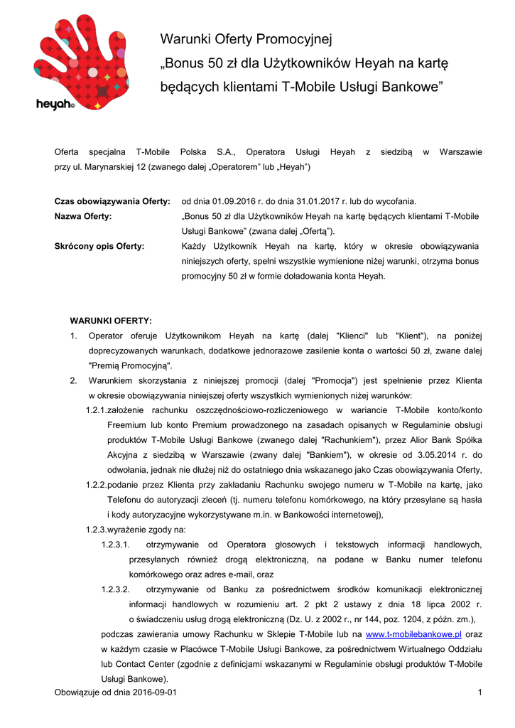 Warunki Oferty Promocyjnej „Bonus 50 zł dla Użytkowników Heyah na kartę będących klientami T-Mobile Usługi Bankowe” Oferta specjalna T-Mobile Polska S.A., Operatora Usługi Heyah z siedzibą w Warszawie przy ul. Marynarskiej 12 (zwanego dalej „Operatorem” lub „Heyah”) Czas obowiązywania Oferty: od dnia 01.09.2016 r. do dnia 31.01.2017 r. lub do wycofania. Nazwa Oferty: „Bonus 50 zł dla Użytkowników Heyah na kartę będących klientami T-Mobile Usługi Bankowe” (zwana dalej „Ofertą”). Skrócony opis Oferty: Każdy Użytkownik Heyah na kartę, który w okresie obowiązywania niniejszych oferty, spełni wszystkie wymienione niżej warunki, otrzyma bonus promocyjny 50 zł w formie doładowania konta Heyah. WARUNKI OFERTY: 1. Operator oferuje Użytkownikom Heyah na kartę (dalej "Klienci" lub "Klient"), na poniżej doprecyzowanych warunkach, dodatkowe jednorazowe zasilenie konta o wartości 50 zł, zwane dalej "Premią Promocyjną". 2. Warunkiem skorzystania z niniejszej promocji (dalej "Promocja") jest spełnienie przez Klienta w okresie obowiązywania niniejszej oferty wszystkich wymienionych niżej warunków: 1.2.1.założenie rachunku oszczędnościowo-rozliczeniowego w wariancie T-Mobile konto/konto Freemium lub konto Premium prowadzonego na zasadach opisanych w Regulaminie obsługi produktów T-Mobile Usługi Bankowe (zwanego dalej "Rachunkiem"), przez Alior Bank Spółka Akcyjna z siedzibą w Warszawie (zwany dalej "Bankiem"), w okresie od 3.05.2014 r. do odwołania, jednak nie dłużej niż do ostatniego dnia wskazanego jako Czas obowiązywania Oferty, 1.2.2.podanie przez Klienta przy zakładaniu Rachunku swojego numeru w T-Mobile na kartę, jako Telefonu do autoryzacji zleceń (tj. numeru telefonu komórkowego, na który przesyłane są hasła i kody autoryzacyjne wykorzystywane m.in. w Bankowości internetowej), 1.2.3.wyrażenie zgody na: 1.2.3.1. otrzymywanie od Operatora głosowych i tekstowych informacji handlowych, przesyłanych również drogą elektroniczną, na podane w Banku numer telefonu komórkowego oraz adres e-mail, oraz 1.2.3.2. otrzymywanie od Banku za pośrednictwem środków komunikacji elektronicznej informacji handlowych w rozumieniu art. 2 pkt 2 ustawy z dnia 18 lipca 2002 r. o świadczeniu usług drogą elektroniczną (Dz. U. z 2002 r., nr 144, poz. 1204, z późn. zm.), podczas zawierania umowy Rachunku w Sklepie T-Mobile lub na www.t-mobilebankowe.pl oraz w każdym czasie w Placówce T-Mobile Usługi Bankowe, za pośrednictwem Wirtualnego Oddziału lub Contact Center (zgodnie z definicjami wskazanymi w Regulaminie obsługi produktów T-Mobile Usługi Bankowe). Obowiązuje od dnia 2016-09-01 1 1.2.4.zgłoszenie udziału w Promocji oraz wyrażenie zgody na pobieranie przez Operatora z Banku informacji o: 1.2.4.1. fakcie zawarcia z Bankiem umowy Rachunku oraz 1.2.4.2. fakcie zasilenia Rachunku jednorazowo kwotą co najmniej 50 zł, poprzez wskazanie opcji "Wyrażam zgodę" na ekranie dotyczącym zgody na udział w promocji dostępnym po zalogowaniu do Bankowości Internetowej. Przy czym ekran do wyrażania zgody nie zostanie wyświetlony jeżeli Klient nie wyrazi zgód, o których mowa w pkt. 1.2.3. 1.2.5.zapewnienie w okresie do 60 dni od dnia założenia Rachunku jednorazowego wpływu na Rachunek w wysokości co najmniej 50 zł (decyduje data zaksięgowania wpływu na Rachunku). 3. Numer telefonu, o którym mowa w pkt. 1.2.2 może być powiązany z tylko jednym klientem Banku. W przypadku, gdy ten sam numer telefonu podany został przez więcej niż jednego klienta Banku, w Promocji bierze udział Klient, który najwcześniej zawarł umowę Rachunku. 4. Z udziału w Promocji wyłączeni są Klienci będący w dniu 2.05.2014 r. stroną obowiązującej umowy Rachunku, jako jego posiadacze lub współposiadacze. 5. Na potrzeby niniejszego Regulaminu z a dzień założenia Rachunku przyjmuje się: 1.5.1.w przypadku umów Rachunku zawieranych za pośrednictwem kuriera, decydująca jest data złożenia wniosku, 1.5.2.w przypadku umów Rachunku zawieranych w trybie "Potwierdzenie umowy przelewem", decydujący jest dzień przesłania przez Bank potwierdzenia zawarcia umowy zgodnie z Regulaminem obsługi produktów T-Mobile Usługi Bankowe. 6. Premia Promocyjna w wysokości 50 zł zostanie dodana do konta telefonicznego numeru, o którym mowa w pkt. 1.2.2 w ciągu maksymalnie 30 dni od spełnienia ostatniego ze wskazanych warunków jej otrzymania, z zastrzeżeniem zdania kolejnego. Premia Promocyjna zostanie dodana tylko w przypadku, gdy konto telefoniczne jest aktywne na połączenia wychodzące. 7. W czasie obowiązywania niniejszej oferty Klient może otrzymać Premię Promocyjną, jednorazowo bez względu na liczbę posiadanych Rachunków, na których zostały spełnione warunki uprawniające do otrzymania Premii Promocyjnej. 8. Dodanie do konta Klienta kwoty Premii Promocyjnej zostanie potwierdzone SMS-em wysłanym na numer, którego dotyczy premia. 9. Środki przyznane w ramach Premii Promocyjnej: 1.9.1.są sumowane z kwotą środków (złotych polskich) na koncie. 1.9.2.nie realizują zobowiązań w innych ofertach aktywnych na koncie Klienta. 1.9.3.nie przedłużają ważności konta na połączenia wychodzące. 10. Warunkiem korzystania ze środków przyznanych w ramach Premii Promocyjnej jest posiadanie ważnego konta na połączenia wychodzące. 11. Nie ma możliwości rezygnacji z przyznanej Premii Promocyjnej, ani jej wymiany na gotówkę. 12. Premia Promocyjna nie zostanie przyznana w sytuacji, gdy podany przez Klienta Numer Telefonu do autoryzacji zleceń: 1.12.1. został przez Klienta zmieniony na inny niż podany w trakcie zakładania Rachunku, 1.12.2. w chwili zlecenia przez Operatora przyznania nagrody okaże się numerem spoza oferty Heyah na kartę, 1.12.3. w chwili zlecenia przez Operatora przyznania nagrody, będzie nieaktywny na połączenia wychodzące (upłynął termin ważności konta). Obowiązuje od dnia 2016
