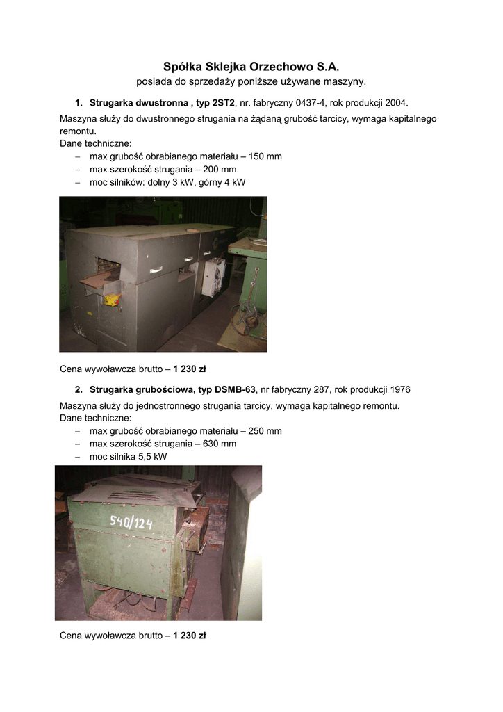 Spółka Sklejka Orzechowo S.A. posiada do sprzedaży poniższe używane maszyny. 1. Strugarka dwustronna , typ 2ST2, nr. fabryczny 0437-4, rok produkcji 2004. Maszyna służy do dwustronnego strugania na żądaną grubość tarcicy, wymaga kapitalnego remontu. Dane techniczne: − max grubość obrabianego materiału – 150 mm − max szerokość strugania – 200 mm − moc silników: dolny 3 kW, górny 4 kW Cena wywoławcza brutto – 1 230 zł 2. Strugarka grubościowa, typ DSMB-63, nr fabryczny 287, rok produkcji 1976 Maszyna służy do jednostronnego strugania tarcicy, wymaga kapitalnego remontu. Dane techniczne: − max grubość obrabianego materiału – 250 mm − max szerokość strugania – 630 mm − moc silnika 5,5 kW − Cena wywoławcza brutto – 1 230 zł 3. Strugarka wyrówniarka, typ GOEDE, nr fabryczny – brak, rok produkcji - brak Maszyna służy do wyrównywania i wygładzania powierzchni elementów z litego drewna, wymaga kompletacji i remontu. Dane techniczne: − max szerokość strugania – 500 mm − długość stołu - 2500 mm − moc silnika 4 kW Cena wywoławcza brutto – 1 230 zł 4. Frezarka dolnowrzecionowa, typ KSMB-57, nr. fab. 69881, rok produkcji 1956. Maszyna służy do frezowania różnego rodzaju profili zależnie od zastosowanych frezów, wymaga kapitalnego remontu. Dane techniczne: − wymiary stołu – 900 x 1020 mm − podnoszenie stołu ręczne − moc silnika - 4,5 kW Cena wywoławcza brutto – 984 zł 5. Frezarko szlifierka, typ DCYF 85, nr. fab. 1, rok produkcji 2003. Maszyna służy do precyzyjnego dwustronnego frezowania i szlifowania boków listew z automatycznym podajnikiem obrabianego materiału, wymaga kompletacji i remontu. Dane techniczne: − długość obrabianego materiału – 315-2250 mm − szerokość obrabianego materiału – 35-85 mm − max grubość materiału – 50 mm − 2 agregaty frezujące i 2 szlifujące Cena wywoławcza brutto – 4 920 zł 6. Wielopiła PAUL, typ KZF-1200, nr. fab. 010302303, rok produkcji 1969 Maszyna służy do cięcia wzdłużnego tarcicy na listwy, wymaga remontu. Dane techniczne: − maksymalna wysokość cięcia - 120 mm − moc silnika – 30 kW Cena wywoławcza brutto – 1 599 zł 7. Piła formatyzerka, typ FU-320, nr. fab. 4966-01, rok produkcji 1985 Maszyna służy do automatycznego rozkrajania płyt, wymaga remontu. Dane techniczne: − długość cięcia – 3 200 mm − moc silnika 11 kW Cena wywoławcza brutto – 2 952 zł 8. Wózek widłowy spalinowy, typ DV1792.3320, nr. fab. 38808205558, rok produkcji 1988. Wózek produkcji bułgarskiej, wymaga kapitalnego remontu, wymiany baterii i ogumienia. Dane techniczne: − udźwig – 3,5 t − wysokość podnoszenia 3 300 mm − silnik perkins − rodzaj paliwa – diesel ON Cena wywoławcza brutto – 3 813 zł
