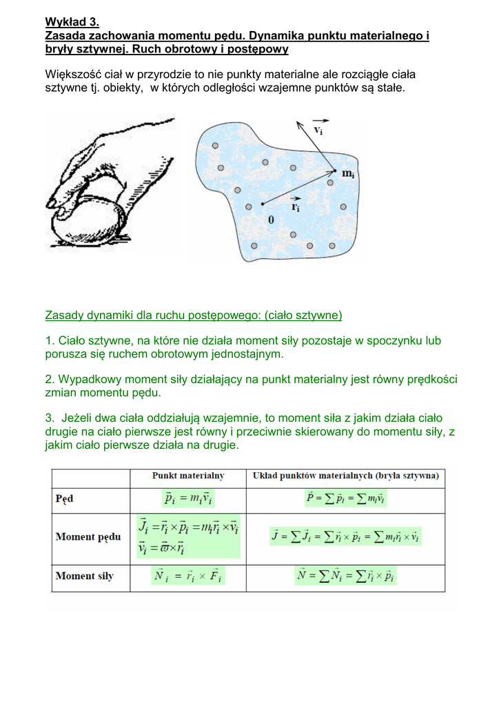 Wykład 3. Zasada zachowania momentu pędu. Dynamika punktu materialnego i bryły sztywnej. Ruch obrotowy i postępowy Większość ciał w przyrodzie to nie punkty materialne ale rozciągłe ciała sztywne tj. obiekty, w których odległości wzajemne punktów są stałe. Zasady dynamiki dla ruchu postępowego: (ciało sztywne) 1. Ciało sztywne, na które nie działa moment siły pozostaje w spoczynku lub porusza się ruchem obrotowym jednostajnym. 2. Wypadkowy moment siły działający na punkt materialny jest równy prędkości zmian momentu pędu. 3. Jeżeli dwa ciała oddziałują wzajemnie, to moment siła z jakim działa ciało drugie na ciało pierwsze jest równy i przeciwnie skierowany do momentu siły, z jakim ciało pierwsze działa na drugie. Kinematyka ruchu obrotowego Ruch postępowy i obrotowy bryły sztywnej Ruch postępowy -Ruch prostoliniowy dowolna prosta przeprowadzona przez bryłę sztywną przesuwa się równolegle do samej siebie, wektory prędkości wszystkich punktów bryły sztywnej są w danej chwili jednakowe. przesunięcie prędkości liniowa przyspieszenie liniowe Ruch obrotowy wszystkie punkty bryły sztywnej poruszają się po okręgach, których środki leżą na jednej wspólnej prostej zwanej chwilową osią obrotu. przesunięcie kątowe φ prędkość kątowa ω przyspieszenie kątowe α Kąt φ określa położenie (kątowe) punktu P względem układu odniesienia. Zakł: Punkt P obracającego się ciała zatacza łuk o długości s Miara łukowa kąta φ: φ = s/R gdzie s- drogą liniową, φ -przesunięcie kątowe W ruchu obrotowym wielkością analogiczną chwilowej prędkości liniowej v jest chwilowa prędkość kątowa ω W ruchu obrotowym podobnie jak w ruchu po okręgu ω jest też nazywana częstością kątową i jest związana z częstotliwością f relacją Podobnie jak chwilowe przyspieszenie liniowe a zostało zdefiniowane chwilowe przyspieszenie kątowe α Prędkość kątowa jak i przyspieszenie kątowe są wektorami. Punkt P porusza się ruchem przyspieszonym po okręgu. Ruch punktu P obracającego się ciała sztywnego opisują wektory: prędkości liniowej v, prędkości kątowej ω, przyspieszenia stycznego as, przyspieszenia normalnego an i przyspieszenia kątowego α Rys. 11.2. Kierunki wektorów v, ω, as, an i α punktu P poruszającego się po okręgu wokół pionowej zależności w postaci wektorowej mają postać Z powyższych rozważań wynika, że jeżeli kąt φ jest mierzony w radianach (rad) to jednostką prędkości kątowej ω jest radian na sekundę (rad/s), a przyspieszenia kątowego α radian na sekundę do kwadratu (rad/s2). Ruch postępowy -Ruch prostoliniowy dowolna prosta przeprowadzona przez bryłę sztywną przesuwa się równolegle do samej siebie, wektory prędkości wszystkich punktów bryły sztywnej są w danej chwili jednakowe. Przesunięcie: s Prędkość: v=ds/dt r r ( ) rr dr r v= dt ) ( r r dv a= dt Przyspieszenie : Masa : m r r Siła : F = ma Pęd: r r p = mv mv 2 Ek = 2 Energia kinetyczna: Ruch obrotowy wszystkie punkty bryły sztywnej poruszają się po okręgach, których środki leżą na jednej wspólnej prostej zwanej chwilową osią obrotu. Kąt obrotu ϕ r dϕ ω= dt Prędkość kątowa : r r dω α= dt Przyspieszenie kątowe: Moment bezwładności : I r r r Moment siły: M = I α r r Moment pędu: L = I ω Iω 2 Ek = 2 Energia kinetyczna: Moment siły: Dla ruchu obrotowego wielkością, która odgrywa rolę analogiczną do siły w ruchu postępowym jest moment siły (tzw. moment obrotowy) τ. Jeżeli siła F jest przyłożona w pewnym punkcie to moment siły τ względem tego punktu jest definiowany jako wartość bezwzgledna wynosi: r- ramię siły, wektor r - położenie punktu względem wybranego inercjalnego układu odniesienia. Moment pędu Zdefiniujmy teraz wielkość, która w ruchu obrotowym odgrywa rolę analogiczną do pędu. Wielkość L nazywamy momentem pędu i definiujemy jako gdzie p jest pędem punktu materialnego, wektor r - położenie punktu względem wybranego inercjalnego układu odniesienia. Wartość L wynosi Zależność pomiędzy momentem siły i momentem pędu:. (różniczkując obie strony równania otrzymujemy: Ponieważ wektory v oraz p są równoległe to ich iloczyn wektorowy jest równy zeru. Natomiast drugi składnik równania jest zgodnie z wypadkowym momentem siły. Otrzymujemy więc Zachowanie momentu pędu Dla układu n cząstek możemy zsumować momenty sił działające na poszczególne punkty materialne gdzie L oznacza teraz całkowity moment pędu układu. Jeżeli na układ nie działa zewnętrzny moment siły (lub wypadkowy moment sił zewnętrznych jest równy zeru) to całkowity moment pędu układu pozostaje stały Przykład: Rozpatrzmy teraz następujący przykład. Rower jedzie ze stałą prędkością gdy siła działająca pomiędzy nawierzchnią i kołem F2. Z jaką siłą F1 łańcuch ciągnie zębatkę jeżeli stosunek R=10 r? Ponieważ prędkość kątowa jest stała więc dL/dt = 0 i wypadkowy moment sił jest równy zeru czyli skąd Ruch bryły sztywnej obracającej się ze stałą prędkością kątową ω wokół stałej osi obrotu w układzie środka masy. Większość ciał w przyrodzie to nie punkty materialne ale rozciągłe ciała sztywne. Zauważmy, że chociaż wszystkie punkty mają te samą prędkość kątową ω to punkty znajdujące się w różnych odległościach od osi obrotu mają różną prędkość liniową v Prędkość i -tego punktu o masie ∆mi wynosi vi = riω gdzie ri jest odległością od osi obrotu Dwa punkty obracającej się bryły mają tę samą prędkość kątową, a różne prędkości liniowe ze względu na różne odległości od osi obrotu r1 i r2 Obliczamy teraz wartość momentu pędu L tego ciała Wielkość w nawiasie nazywamy momentem bezwładności I, który definiujemy jako dla ciągłego rozkładu masy Moment bezwładności I zależy od osi obrotu. Możemy teraz wyrazić moment pędu po
