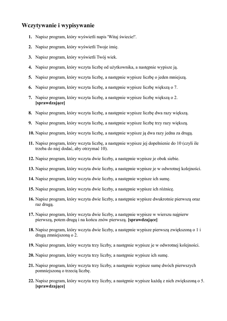 Wczytywanie i wypisywanie 1. Napisz program, który wyświetli napis 'Witaj świecie!'. 2. Napisz program, który wyświetli Twoje imię. 3. Napisz program, który wyświetli Twój wiek. 4. Napisz program, który wczyta liczbę od użytkownika, a następnie wypisze ją. 5. Napisz program, który wczyta liczbę, a następnie wypisze liczbę o jeden mniejszą. 6. Napisz program, który wczyta liczbę, a następnie wypisze liczbę większą o 7. 7. Napisz program, który wczyta liczbę, a następnie wypisze liczbę większą o 2. [sprawdzające] 8. Napisz program, który wczyta liczbę, a następnie wypisze liczbę dwa razy większą. 9. Napisz program, który wczyta liczbę, a następnie wypisze liczbę trzy razy większą. 10. Napisz program, który wczyta liczbę, a następnie wypisze ją dwa razy jedna za drugą. 11. Napisz program, który wczyta liczbę, a następnie wypisze jej dopełnienie do 10 (czyli ile trzeba do niej dodać, aby otrzymać 10). 12. Napisz program, który wczyta dwie liczby, a następnie wypisze je obok siebie. 13. Napisz program, który wczyta dwie liczby, a następnie wypisze je w odwrotnej kolejności. 14. Napisz program, który wczyta dwie liczby, a następnie wypisze ich sumę. 15. Napisz program, który wczyta dwie liczby, a następnie wypisze ich różnicę. 16. Napisz program, który wczyta dwie liczby, a następnie wypisze dwukrotnie pierwszą oraz raz drugą. 17. Napisz program, który wczyta dwie liczby, a następnie wypisze w wierszu najpierw pierwszą, potem drugą i na końcu znów pierwszą. [sprawdzające] 18. Napisz program, który wczyta dwie liczby, a następnie wypisze pierwszą zwiększoną o 1 i drugą zmniejszoną o 2. 19. Napisz program, który wczyta trzy liczby, a następnie wypisze je w odwrotnej kolejności. 20. Napisz program, który wczyta trzy liczby, a następnie wypisze ich sumę. 21. Napisz program, który wczyta trzy liczby, a następnie wypisze sumę dwóch pierwszych pomniejszoną o trzecią liczbę. 22. Napisz program, który wczyta trzy liczby, a następnie wypisze każdą z nich zwiększoną o 5. [sprawdzające] Instrukcja if 23. Napisz program, który wczyta liczbę oraz sprawdzi czy jest ona równa 1, jeśli tak to wypisze ją na ekran. 24. Napisz program, który wczyta liczbę oraz sprawdzi czy jest ona różna od 7, jeśli tak to wypisze na ekran 'Tak'. 25. Napisz program, który wczyta liczbę oraz sprawdzi czy jest ona większa od 2, jeśli tak to wypisze na ekran 'Tak', a przeciwnym przypadku wypisze 'Nie'. 26. Napisz program, który wczyta liczbę oraz sprawdzi czy jest ona równa 5, jeśli tak to wypisze na ekran 'Tak', a przeciwnym przypadku wypisze 'Nie'. 27. Napisz program, który wczyta liczbę oraz sprawdzi czy jest ona mniejsza od 10, jeśli tak to wypisze na ekran 'Tak', a przeciwnym przypadku wypisze 'Nie'. [sprawdzające] 28. Napisz program, który wczyta liczbę oraz sprawdzi czy jest ona równa 11, jeśli tak to odejmie od niej 3 i wypisze wynik. 29. Napisz program, który wczyta liczbę oraz sprawdzi czy jest ona mniejsza od 13, jeśli tak to doda do niej 5 i wypisze wynik. 30. Napisz program, który wczyta liczbę oraz sprawdzi czy jest ona większa od 9, jeśli tak to doda do niej 2, a w przeciwnym przypadku odejmie 2 i wypisze wynik. 31. Napisz program, który wczyta liczbę oraz sprawdzi czy jest ona mniejsza od 8, jeśli tak to wypisze ją na ekran. [sprawdzające] 32. Napisz program, który wczyta dwie liczby, a następnie sprawdzi czy pierwsza jest większa od drugiej, jeśli tak to wypisze na ekran 'Tak', a przeciwnym przypadku wypisze 'Nie'. 33. Napisz program, który wczyta dwie liczby, a następnie sprawdzi czy pierwsza jest równa drugiej, jeśli tak to wypisze ją na ekran. 34. Napisz program, który wczyta dwie liczby, a następnie sprawdzi czy pierwsza jest mniejsza bądź równa od drugiej, jeśli tak to wypisze na ekran 'Tak', a przeciwnym przypadku wypisze 'Nie'. 35. Napisz program, który wczyta dwie liczby, a następnie wypisze mniejszą. 36. Napisz program, który wczyta dwie liczby, a następnie wypisze większą. [sprawdzające] 37. Napisz program, który wczyta trzy liczby, a następnie sprawdzi czy wszystkie są sobie równe, jeśli tak to wypisze na ekran 'Tak', a przeciwnym przypadku wypisze 'Nie'. 38. *Napisz program, który spośród trzech podanych przez użytkownika liczb wybierze najmniejszą z nich i wypisze ją na ekranie. 39. *Napisz program, który wczyta trzy liczby, a następnie sprawdzi czy pierwsza liczba jest większa od drugiej oraz mniejsza od trzeciej. Pętla 40. Napisz program, który wypisze liczby od 1 do 10. 41. Napisz program, który wczyta liczbę od użytkownika i wypisze liczby od wczytanej liczby do 1. 42. Napisz program, który wczyta liczbę od użytkownika i wypisze liczby od 1 do wczytanej liczby. [sprawdzające] 43. Napisz program, który będzie ciągle wyświetlał Twoje imię. [sprawdzające] 44. Napisz program, który będzie wypisywał w kolejnych wierszach liczby począwszy od 1. 45. Napisz program, który wczyta liczbę od użytkownika i wypisze liczby parzyste od 2 do wczytanej liczby. 46. Wypisz liczby nieparzyste zaczynając od 21 i kończąc na 1. 47. Napisz program, który zapyta użytkownika o liczbę oraz po wczytaniu wypisze liczby od 1 do wczytanej liczby, a następnie w dół do 1. 48. Napisz program, który wypisuje wyniki dodawania dwóch do liczby, dla liczb od 1 do liczby podanej przez użytkownika. [sprawdzające] 49. Napisz program, który wypisuje wyniki odejmowania jedności od liczby, dla liczb od 1 do liczby podanej przez użytkownika. 50. Napisz program, który wypisze sumę liczb od 1 do liczby podanej przez użytkownika. 51. Ulubioną liczbą Bajtka jest 7 i bardzo chciałby dowiedzieć się jakie są wyniki dodawania 7 do kolejnych liczb naturalnych. Pomóż mu pisząc odpowiedni program wczytując maksymalną liczbę. 52. Teraz Bajtek chciałby poznać jakie są wyniki dodawania liczby do samej siebie dla liczb od 1 