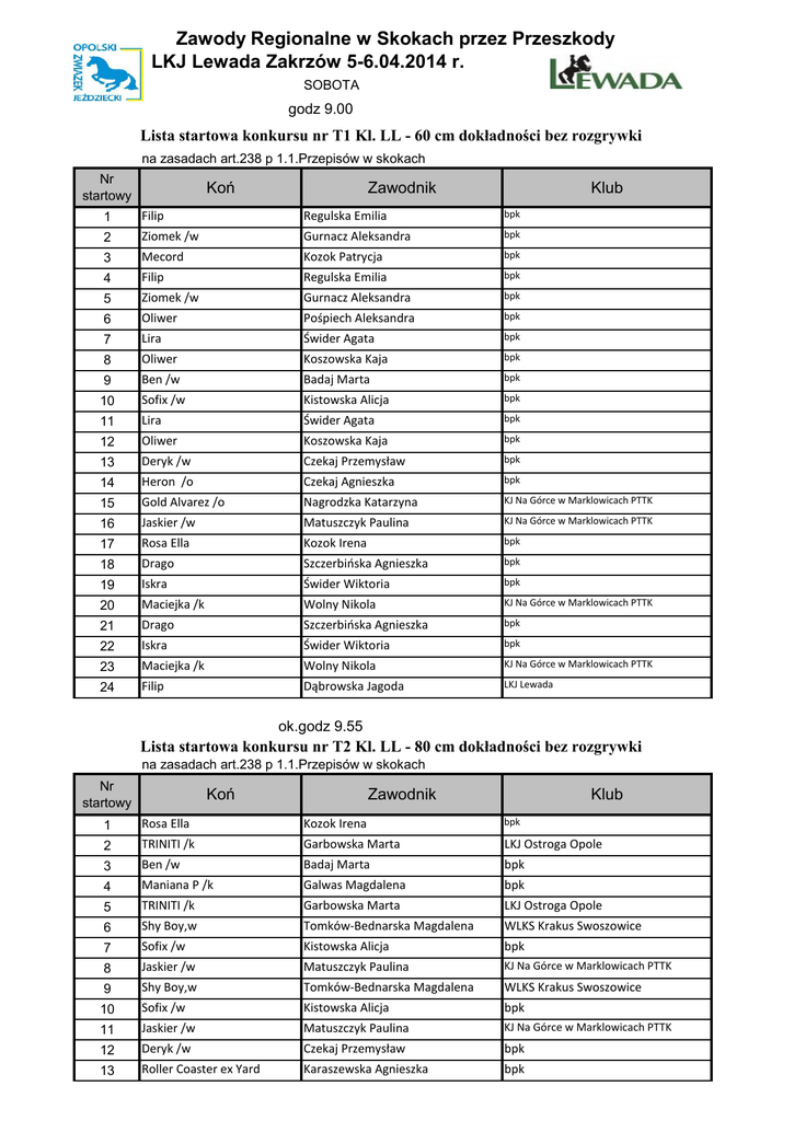 Zawody Regionalne w Skokach przez Przeszkody LKJ Lewada Zakrzów 5-6.04.2014 r. SOBOTA godz 9.00 Lista startowa konkursu nr T1 Kl. LL - 60 cm dokładności bez rozgrywki na zasadach art.238 p 1.1.Przepisów w skokach Nr startowy Koń Zawodnik Klub 1 Filip Regulska Emilia bpk 2 Ziomek /w Gurnacz Aleksandra bpk 3 Mecord Kozok Patrycja bpk 4 Filip Regulska Emilia bpk 5 Ziomek /w Gurnacz Aleksandra bpk 6 Oliwer Pośpiech Aleksandra bpk 7 Lira Świder Agata bpk 8 Oliwer Koszowska Kaja bpk 9 Ben /w Badaj Marta bpk 10 Sofix /w Kistowska Alicja bpk 11 Lira Świder Agata bpk 12 Oliwer Koszowska Kaja bpk 13 Deryk /w Czekaj Przemysław bpk 14 Heron /o Czekaj Agnieszka bpk 15 Gold Alvarez /o Nagrodzka Katarzyna KJ Na Górce w Marklowicach PTTK 16 Jaskier /w Matuszczyk Paulina KJ Na Górce w Marklowicach PTTK 17 Rosa Ella Kozok Irena bpk 18 Drago Szczerbińska Agnieszka bpk 19 Iskra Świder Wiktoria bpk 20 Maciejka /k Wolny Nikola KJ Na Górce w Marklowicach PTTK 21 Drago Szczerbińska Agnieszka bpk 22 Iskra Świder Wiktoria bpk 23 Maciejka /k Wolny Nikola KJ Na Górce w Marklowicach PTTK 24 Filip Dąbrowska Jagoda LKJ Lewada ok.godz 9.55 Lista startowa konkursu nr T2 Kl. LL - 80 cm dokładności bez rozgrywki na zasadach art.238 p 1.1.Przepisów w skokach Nr startowy Koń Zawodnik Klub 1 Rosa Ella Kozok Irena bpk 2 TRINITI /k Garbowska Marta LKJ Ostroga Opole 3 Ben /w Badaj Marta bpk 4 Maniana P /k Galwas Magdalena bpk 5 TRINITI /k Garbowska Marta LKJ Ostroga Opole 6 Shy Boy,w Tomków-Bednarska Magdalena WLKS Krakus Swoszowice 7 Sofix /w Kistowska Alicja bpk 8 Jaskier /w Matuszczyk Paulina KJ Na Górce w Marklowicach PTTK 9 Shy Boy,w Tomków-Bednarska Magdalena WLKS Krakus Swoszowice 10 Sofix /w Kistowska Alicja bpk 11 Jaskier /w Matuszczyk Paulina KJ Na Górce w Marklowicach PTTK 12 Deryk /w Czekaj Przemysław bpk 13 Roller Coaster ex Yard Karaszewska Agnieszka bpk 14 15 Gold Alvarez /o Mecord Nagrodzka Katarzyna KJ Na Górce w Marklowicach PTTK Kozok Patrycja bpk ok.. godz 10.30 Lista startowa konkursu nr 1 Kl. LL - dokładności bez rozgrywki na zasadach art.238 p 1.1.Przepisów w skokach Nr startowy Koń Zawodnik Klub 1 GOIA /k Jabłońska Julia bpk 2 Gracja /k Wilk Anna KJ Jumping Team Brynica 3 Leap Star /w Poborska Ewa JKS EQUI VERSO Jastrzębie Zdrój 4 Granville K /w Lis Wiktoria bpk 5 Ben /w Badaj Marta bpk 6 Maniana P /k Kolińska Karolina LZJ Drama Zbrosławice 7 Shy Boy,w Tomków-Bednarska Magdalena WLKS Krakus Swoszowice 8 Romus /w Szczepaniszyn Aleksandra KJ Geo 9 Rossa /k Pośpiech Michalina bpk 10 Karmelka /k Bojarczuk Jagoda bpk 11 Arkadia /k Olech Grażyna bpk 12 Dioson Karaszewska Agnieszka bpk ok. godz 11.20 Lista startowa konkursu nr 2 Kl. L- dokładności bez rozgrywki Nr startowy Koń Zawodnik Klub 1 Orvallo /w Remisz Halina Klub Jeździecki ROYAL 2 Kantor /w Poborska Ewa JKS EQUI VERSO Jastrzębie Zdrój 3 Lechita /w Lis Wiktoria bpk 4 Orvallo /w Remisz Halina Klub Jeździecki ROYAL 5 Bangkok GN /o Pażucha Wojciech KS "Pegaz" Chwałowice 6 GOIA /k Jabłońska Julia bpk 7 Gracja /k Wilk Anna KJ Jumping Team Brynica 8 Tigra –K /k Korytowska Magdalena bpk 9 Quiro 5 /w Grosz Bartosz LKJ Moszna 10 Gracja /k Wilk Anna KJ Jumping Team Brynica 11 Maniana P /k Kolińska Karolina LZJ Drama Zbrosławice 12 Carlos /w Szpryngiel Aleksandra LKJ Ostroga Opole 13 Rossa /k Pośpiech Michalina bpk 14 Romus /w Szczepaniszyn Aleksandra KJ Geo 15 Carlos /w Szpryngiel Aleksandra LKJ Ostroga Opole 16 Rossa /k Pośpiech Michalina bpk 17 Karmelka /k Bojarczuk Jagoda bpk 18 Arkadia /k Olech Grażyna bpk 19 Caprice de Campagne /k Zalewska Anna LKJ Ostroga Opole 20 Karmelka /k Bojarczuk Jagoda bpk 21 Arkadia /k Olech Grażyna bpk 22 Lester /w Remisz Halina Klub Jeździecki ROYAL 23 Leap Star /w Poborska Ewa JKS EQUI VERSO Jastrzębie Zdrój 24 Granville K /w Lis Wiktoria bpk 25 Lester /w Remisz Halina Klub Jeździecki ROYAL ok. godz 12.35 Lista startowa konkursu nr 3- Kl. P -zwykły bez rozgrywki (art..238.2.1) Koń Nr startowy Zawodnik Klub 1 Andżelina /k Kaczyna Maria KJ Trachy Gliwice 2 Tigra –K /k Korytowska Magdalena bpk 3 Merano /w Szpak Iga bpk 4 Bangkok GN /o Pażucha Wojciech KS "Pegaz" Chwałowice 5 Quiro 5 /w Grosz Bartosz LKJ Moszna 6 Kantor /w Poborska Ewa JKS EQUI VERSO Jastrzębie Zdrój 7 Caprice de Campagne /k Zalewska Anna LKJ Ostroga Opole 8 Lechita /w Lis Wiktoria bpk 9 Bukolika /k Kaczyna Maria KJ Trachy Gliwice 10 Tamiza-k /k Korytowska Magdalena bpk 11 Kronos /o Szpak Iga bpk ok. godz 13.10 Lista startowa konkursu nr 5- Kl. N -zwykły bez rozgrywki (art..238.2.1) Nr Koń startowy Kronos /o 1 Bukolika /k 2 Zawodnik Klub Szpak Iga bpk Kaczyna Maria KJ Trachy Gliwice 3 Cappone /w Godoś Karolina Klub Jeździecki ROYAL 4 Wat Nu /w Ruczka Mirella KJ Turbud Brzeg 5 Folklore 13 /k Grosz Bartosz LKJ Moszna 6 Merano /w Szpak Iga bpk 7 Dolgano /w Świętochowska Aleksandra bpk 8 Andżelina /k Kaczyna Maria KJ Trachy Gliwice 9 Royboss /w Godoś Karolina Klub Jeździecki ROYAL 10 Undiamo /w Ruczka Mirella KJ Turbud Brzeg 11 Ula Bajou – K /k Szpak Iga bpk ok. godz 13.40 Lista startowa konkursu nr 6- Kl. C -zwykły bez rozgrywki (art..238.2.1) Nr Koń startowy Royboss /w 1 Undiamo /w 2 Zawodnik Klub Godoś Karolina Klub Jeździecki ROYAL Ruczka Mirella KJ Turbud Brzeg 3 Folklore 13 /k Grosz Bartosz LKJ Moszna 4 Dolgano /w Świętochowska Aleksandra bpk 5 Cappone /w Godoś Karolina Klub Jeździecki ROYAL 6 Wat Nu /w Ruczka Mirella KJ Turbud Brzeg