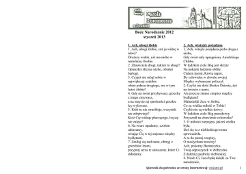 Boże Narodzenie 2012 styczeń 2013 1. Ach, ubogi żłobie 1. Ach, ubogi żłobie, cóż ja widzę w tobie? Droższy widok, niż ma niebo w maleńkiej Osobie. 2. Zbawicielu drogi, takżeś to ubogi? Opuściłeś śliczne niebo, obrałeś barłogi. 3. Czyjeś nie mógł sobie w największej ozdobie obrać pałacu drogiego, nie w tym leżeć żłobie? 4. Gdy na świat przybywasz, grzechy z niego zmywasz, a na zmycie tej sprośności gorzkie łzy wylewasz. 5. Któż tu nie struchleje, wszystek nie zdrętwieje? Któż Cię widząc płaczącego, łzą się nie zaleje? 6. Na twarz upadamy, czołem uderzamy, witając Cię w tej stajence między bydlętami. 7. Zmiłuj się nad nami, obmyj z grzechów łzami, przyjmij serca te skruszone, które Ci składamy. 2. Ach, wiatajże pożądana 1. Ach, witajże pożądana perło droga z nieba, Gdy świat cały upragniony Anielskiego Chleba. W ludzkim ciele Bóg jest skryty Na pokarm ludziom obfity. Ciałem karmi, Krwią napoi, By człowieka w chwale swojej Między wybranymi policzył. 2. Czyliż nie dość Boskie Dziecię, żeś na świecie z nami, Ale jeszcze zimno cierpisz między bydlętami! Malusieńki Jezu w żłobie. Co za wielka miłość w Tobie! Czyliż nie są wielkie dziwy: W ludzkim ciele Bóg prawdziwy Przyszedł na zbawienie człowieka? 3. O miłości niepojęta, jakżeś wielka była, Iżeś się tu z niebieskiego tronu sprowadziła. A to do pustej szopiny, O niesłychane nowiny! Ach, pokorny Baraneczku, Twój odpoczynek w żłóbeczku Z dalekiej podróży niebieskiej. 4. Niech Ci, Jezu będą dzięki za Twe narodzenie, śpiewnik do pobrania ze strony internetowej: swkarol.pl 1 Bo przez nie zacząłeś nasze sprawować zbawienie. Miłość, która to sprawiła, Iż cię do nas sprowadziła, Niech swą iskrą nas zapali, Abyśmy Cię miłowali Teraz i bez końca w wieczności! 6. Pókiż tego będzie? Dość tego dzieci, A czemuż nie idzie spać drugi, trzeci? Dosyć osioł i wół beczy, Budzą dziecię, nie do rzeczy. Spać, spać, spać, spać! 4. A czemuż mój Jezus 1. A czemuż mój Jezus tak ubogo leży? Ani po królewsku, ni w drogiej odzieży? 3. A cóż z tą Dzieciną 1. A cóż z tą Dzieciną będziem Znać dlatego, by grzesznika, czynili, Czartowskiego niewolnika, Braciszkowie mili, że się nam kwili? Od piekła wybawił, przez ubóstwo Zaśpiewajmy Mu wesoło zbawił. I obrócmy się z Nim w koło. Hoc hoc 2. Czemuż nie w pałacach rodzi się hoc hoc ! Dziecina, 2. Ale drżysz od zimna mój Wszak świat, niebo, ziemia, Jego jest Aniołeczku, dziedzina, Leżąc w tym kamiennym, zimnym Ale w stajence ubogiej, Na wianeczku w ten mróz srogi? żłóbeczku. W kamiennym żłóbeczku zimno Więc z osiołkiem razem z wołem, Zagrzewać Cię będziem społem: Hu, Paniąteczku. 3. Czemuż nie w bogatej pościeli hu, hu, hu, hu. królewskiej, 3. Podobno Dzieciątko, że głodne Nie pod pawilonem leży Pan niebieski? płacze, Pajęczyna pawilonem, Dlatego tak z nami nierade skacze. Aby każdy był zbawionym. Więc ja Mu dam kukiełeczkę Kochaj Go serdecznie, będziesz żył z I masełka osełeczkę. La la la la! Nim wiecznie. 4. Albo Pacholęciu w dudki zagrajmy I na piszczałkach rozweselajmy. 5. Anioł pasterzom mówił 1. Anioł pasterzom mówił: Chrystus się Li li li, moje dudki, Skacz Słowiczku, mój malutki. Li li wam narodził, w Betlejem, nie bardzo podłym mieście, li li! narodził się w ubóstwie, Pan wszego 5. Już ci nie chce płakać Dziecina stworzenia. dłużej 2. Chcąc się dowiedzieć tego poselstwa Ale ukojone oczęta mruży wesołego, Więc Go włóżmy w kolebeczkę, Zaśpiewajmy Mu piosneczkę. Lu Lu bieżeli do Betlejem skwapliwie, znaleźli Dziecię w żłobie, Maryję z Lu Lu! Józefem. śpiewnik do pobrania ze strony internetowej: swkarol.pl 2 89. Psalm responsoryjny z dn. R: Pośród narodów głoście chwałę Pana. Śpiewajcie Panu pieśń nową, Śpiewaj Panu, ziemio cała. Śpiewajcie Panu, sławcie Jego imię, Każdego dnia głoście Jego zbawienie. Głoście Jego chwałę wśród wszystkich narodów, Rozgłaszajcie Jego cuda pośród wszystkich ludów. Oddajcie Panu chwałę i uznajcie Jego potęgę. Oddajcie Panu chwałę należną Jego imieniu. Aby mógł wkroczyć Król chwały. Kto jest tym Królem chwały? Pan dzielny i potężny, Pan potężny w boju. Bramy, podnieście swe szczyty, Unieście się odwieczne podwoje, Aby mógł wkroczyć Król chwały. Kto jest tym Królem chwały? Pan Zastępów: On jest Królem chwały. A: Alleluja, alleluja, alleluja. Słowo na oświecenie pogan I chwała ludu Twego, Izraela. Uwielbiajcie Pana w świętym przybytku. Zadrżyj ziemio cała, przed Jego obliczem. Głoście wśród ludów, że Pan jest królem, Będzie sprawiedliwie rządził ludy. A: Alleluja, alleluja, alleluja. Bóg wezwał nas przez Ewangelię Abyśmy dostąpili chwały naszego Pana, Jezusa Chrystusa. 90. Święto Matki Bożej Gromnicznej. Święto Ofiarowania Pańskiego. Rok C R: Pan Bóg Zastępów, On jest Królem chwały. Bramy, podnieście swe szczyty, Unieście się odwieczne podwoje, śpiewnik do pobrania ze strony internetowej: swkarol.pl 30 3. Taki Pan chwały wielkiej, uniżył się Wysoki. Pałacu kosztownego żadnego nie miał zbudowanego, Pan wszego stworzenia. 4. O dziwne narodzenie, nigdy niewysłowione! poczęła Panna Syna w czystości. Porodziła w całości panieństwa swojego. 6. A wczora z wieczora A wczora z wieczora, z niebieskiego dwora Przyszła nam nowina, Panna rodzi Syna. Boga prawdziwego, Nieogarnionego Za wyrokiem Boskim, w Betlejem żydowskim. 2. Pastuszkowie mali w polu wtenczas spali, Gdy Anioł z północy światłość z nieba toczy. Chwałę oznajmiając, szopę pokazując Gdzie Panna z Dzieciątkiem, wołem i oślątkiem. 3. I z Józefem starym, nad Jezusem małym, Chwałą Boga tego, dziś narodzonego. 4. Natychmiast pastuszy radzi drogiej duszy, Do onej to budki bieżą, wziąwszy dudki. 5. Niebiescy duchowie, z daleka królowie Pragną widzieć swego